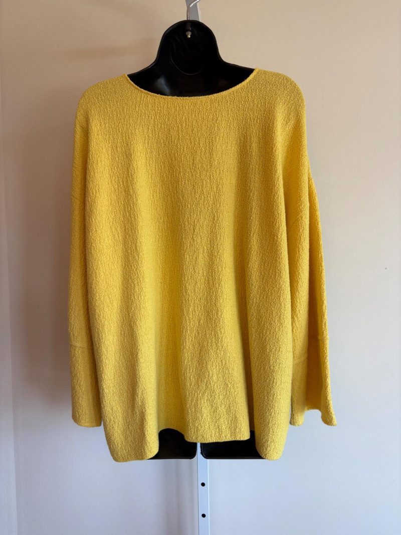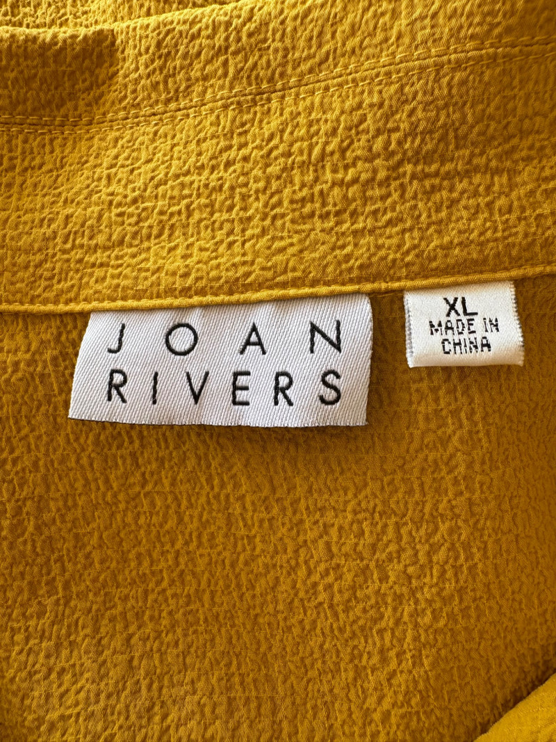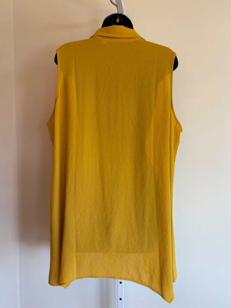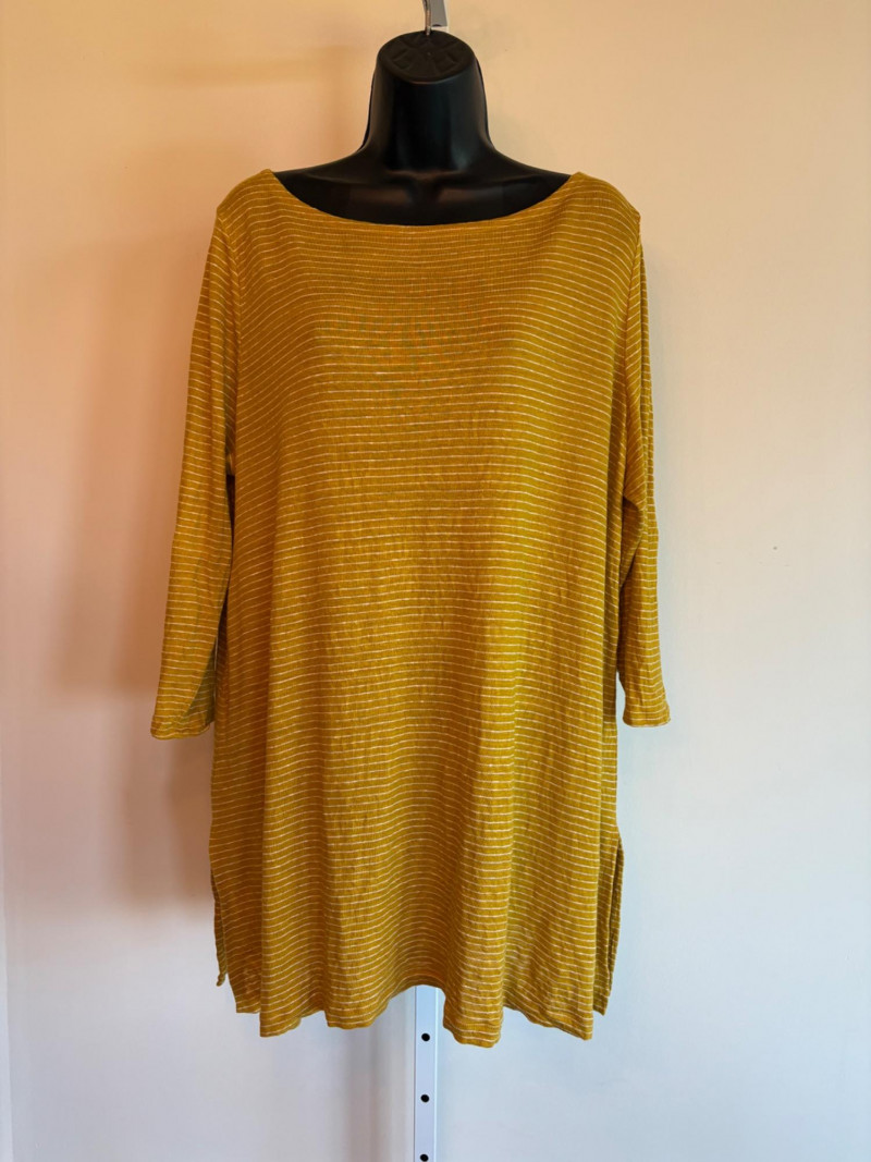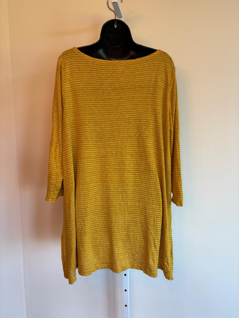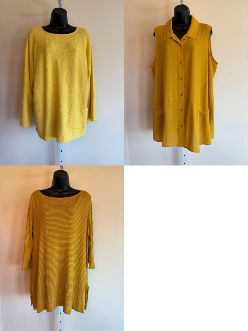 Three sunny summer tops from various makers in shades of gold/yellow. Long-sleeve textured boxy top from Margaret Winters. Saturated yellow-colored nubby top has curved neckline, dropped shoulder seams, large banded sleeve ends, split hem, and front left patch pocket. In excellent condition. 100% cotton. Measures 25" pit to pit and 24" from back neckline to hem. Size tag says XL. Gold & white horizontal striped knit t-shirt tunic from Eileen Fisher has wide curved neckline, 3/4 sleeves, and deep split hem. In excellent condition. 100% organic linen. Measures 24" pit to pit and 30" from back neckline to hem. Size tag says XL. Sleeveless collared long blouse from Joan Rivers in a rich gold fabric with button front closure, pieced construction, and in-seam front pockets along piecing seam with modified shark bite hem. In excellent condition. 99% polyester with 1% spandex. Measures 25" pit to pit and 34" from back neck seam to bottom back hem. Size tag says XL.