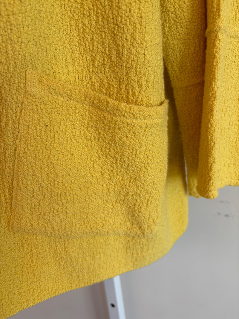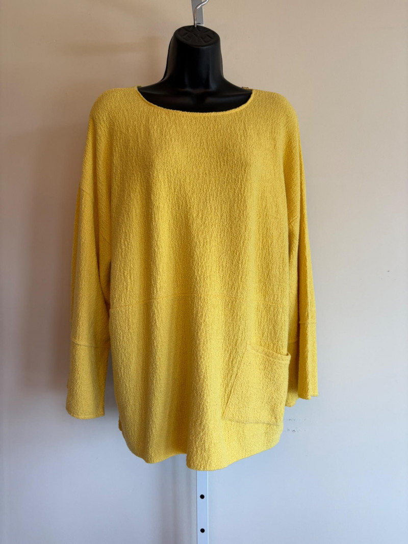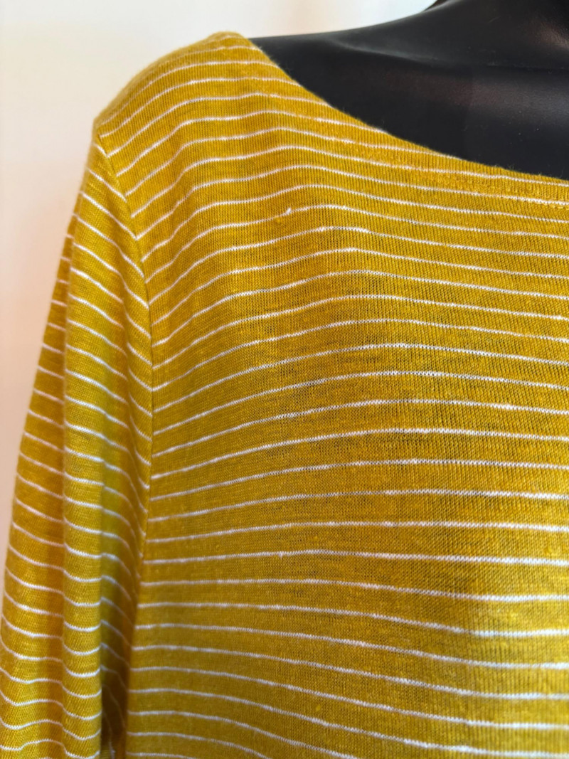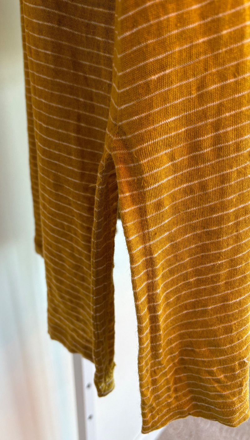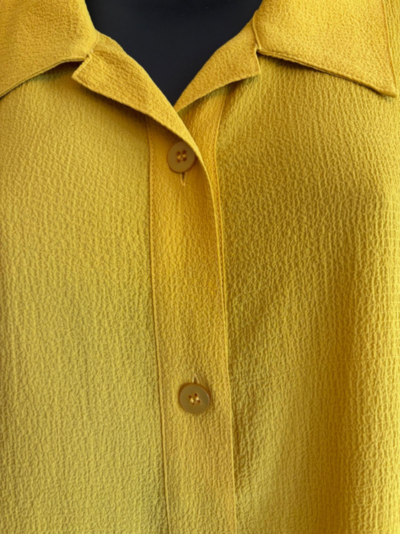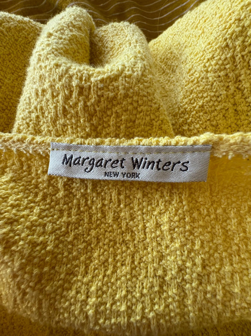Three sunny summer tops from various makers in shades of gold/yellow. Long-sleeve textured boxy top from Margaret Winters. Saturated yellow-colored nubby top has curved neckline, dropped shoulder seams, large banded sleeve ends, split hem, and front left patch pocket. In excellent condition. 100% cotton. Measures 25" pit to pit and 24" from back neckline to hem. Size tag says XL. Gold & white horizontal striped knit t-shirt tunic from Eileen Fisher has wide curved neckline, 3/4 sleeves, and deep split hem. In excellent condition. 100% organic linen. Measures 24" pit to pit and 30" from back neckline to hem. Size tag says XL. Sleeveless collared long blouse from Joan Rivers in a rich gold fabric with button front closure, pieced construction, and in-seam front pockets along piecing seam with modified shark bite hem. In excellent condition. 99% polyester with 1% spandex. Measures 25" pit to pit and 34" from back neck seam to bottom back hem. Size tag says XL.