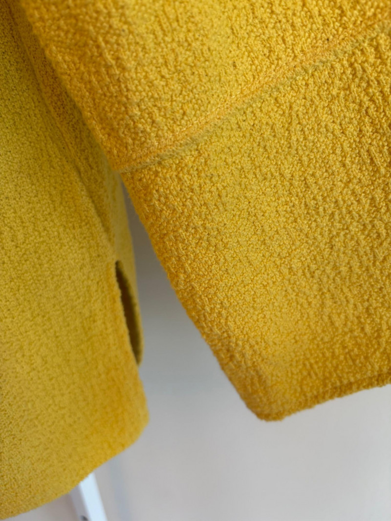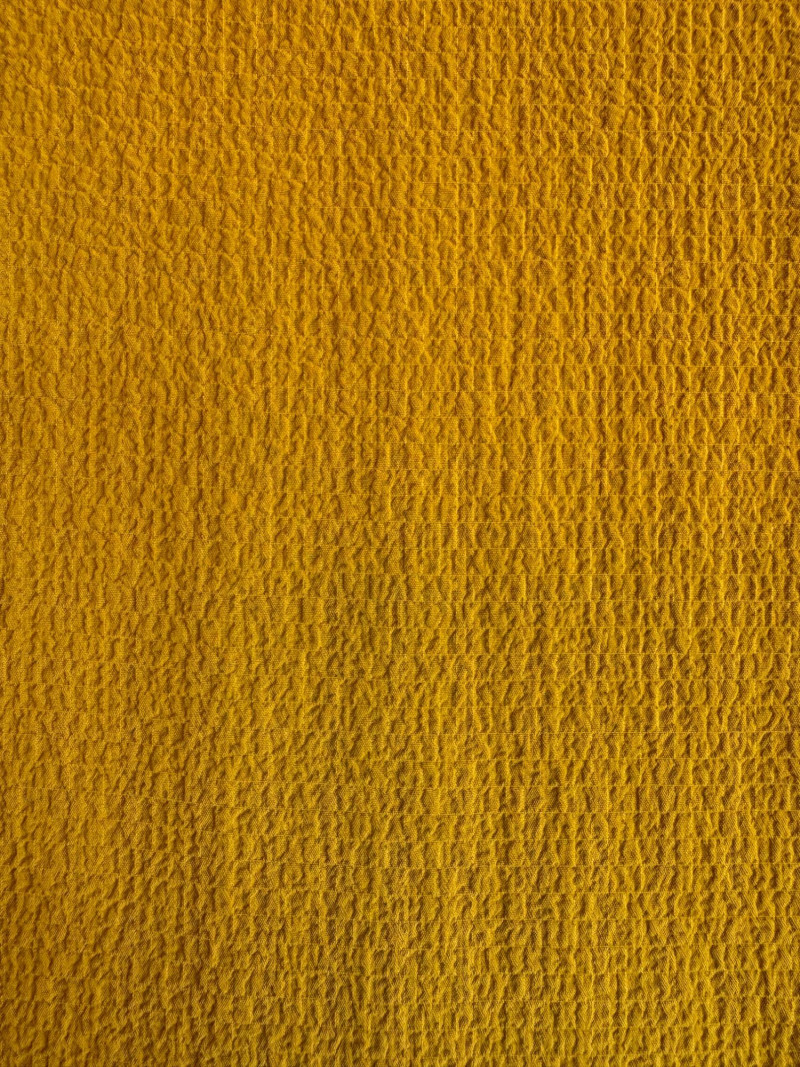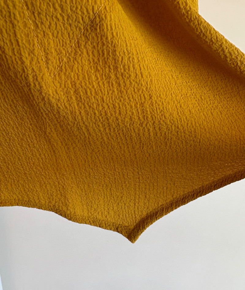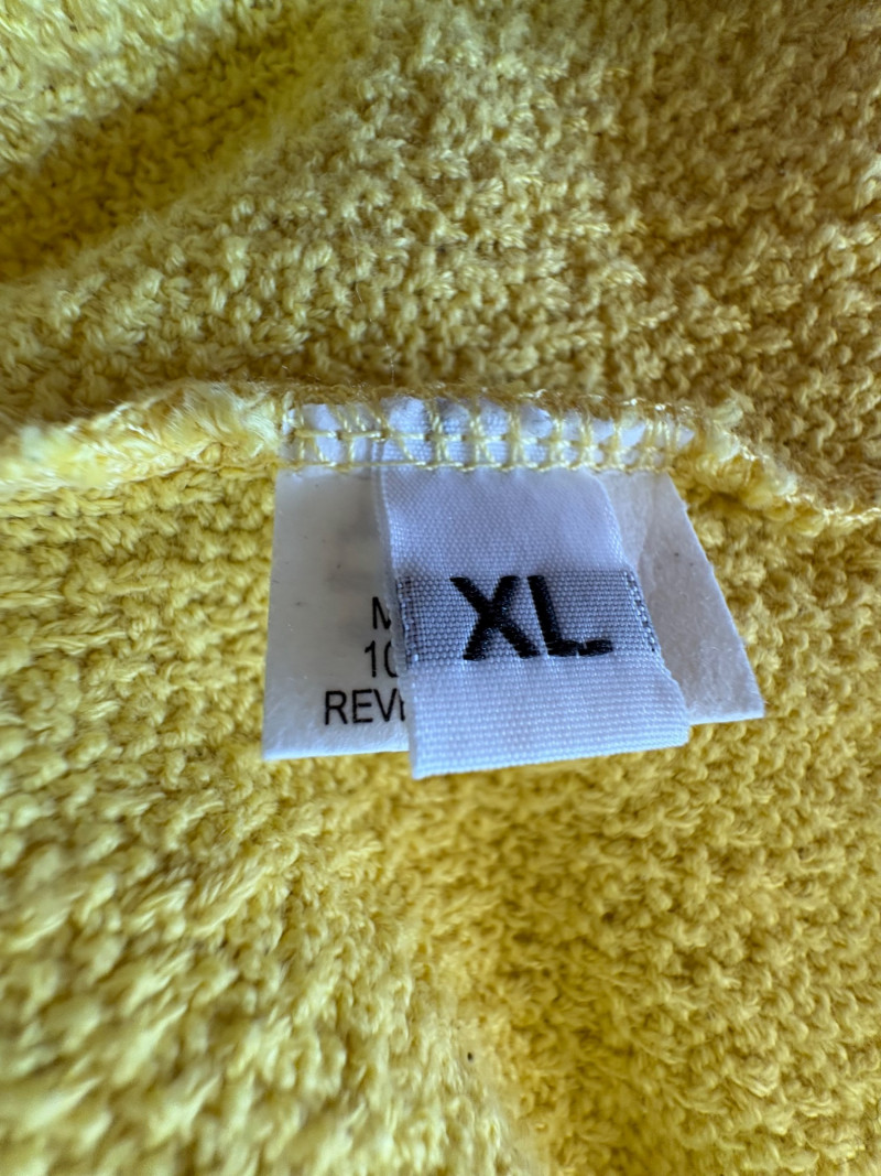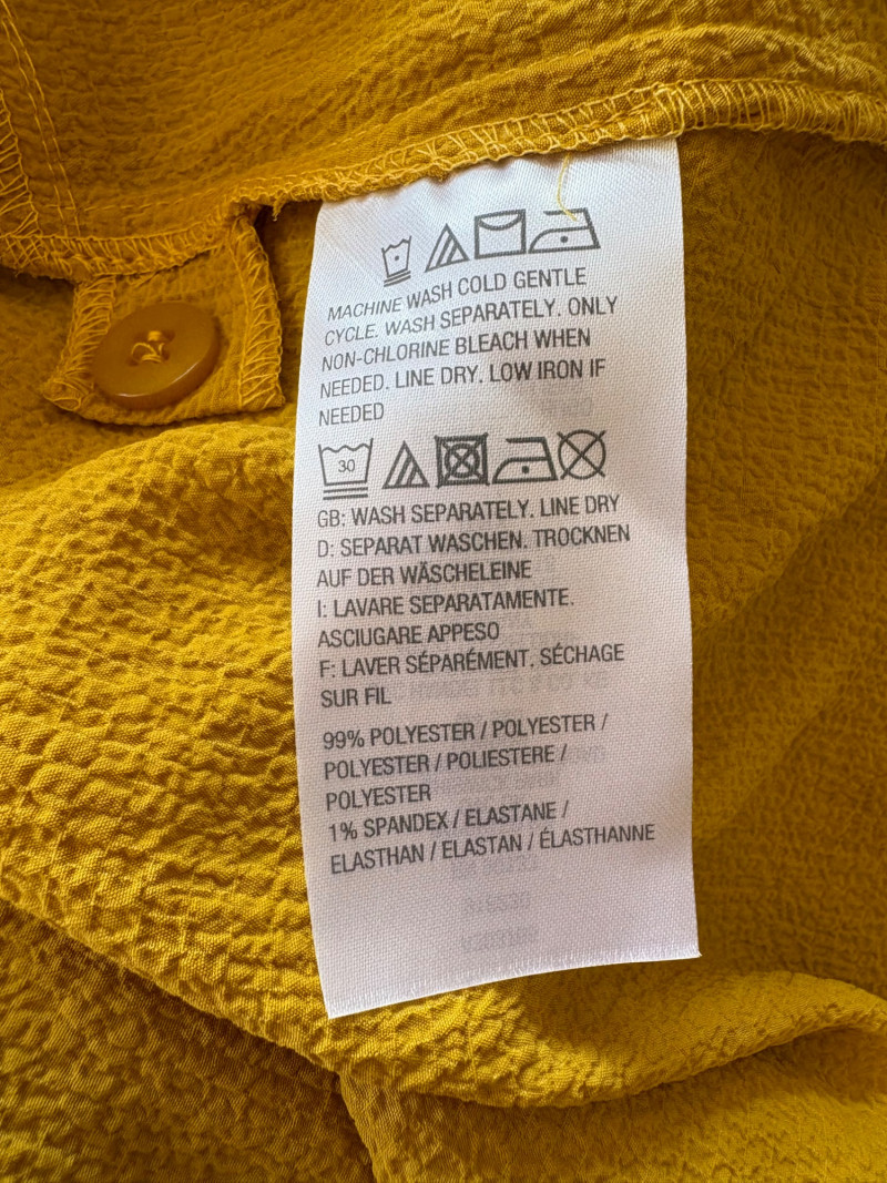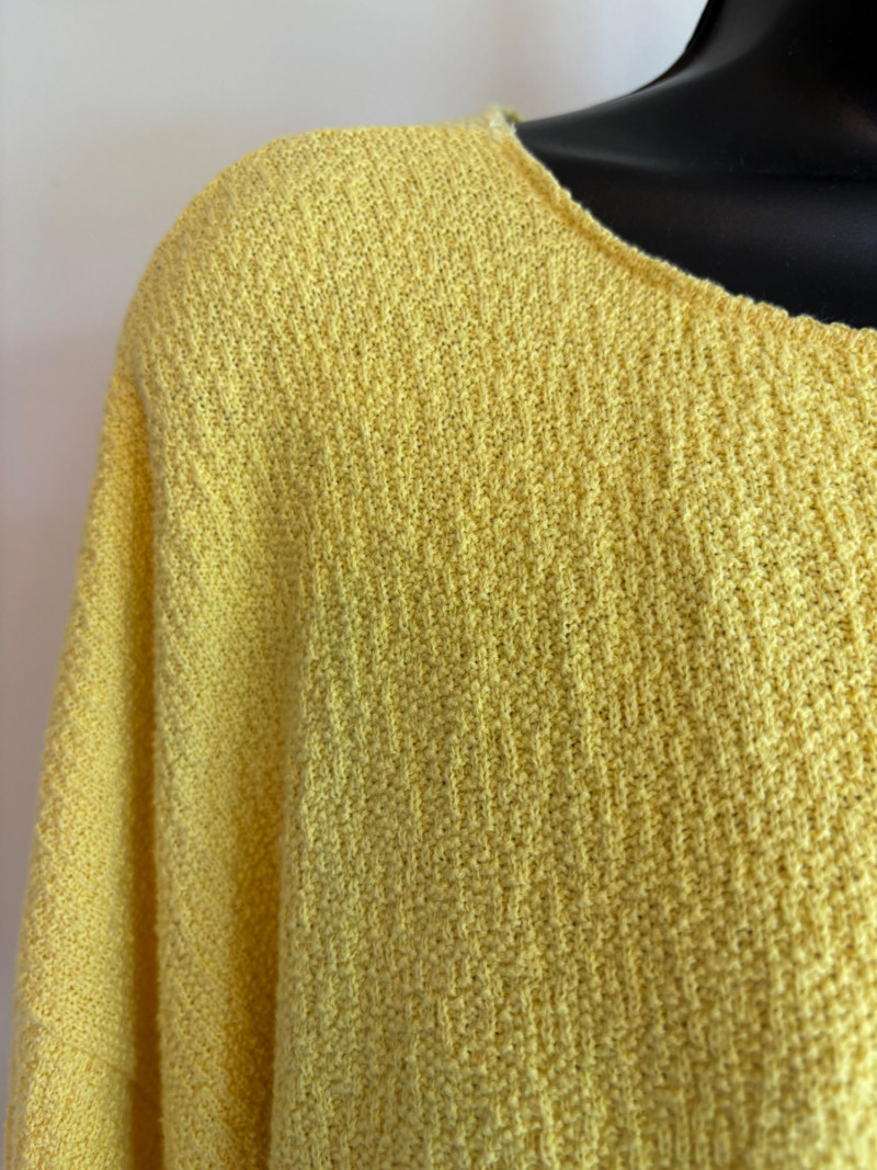 Three sunny summer tops from various makers in shades of gold/yellow. Long-sleeve textured boxy top from Margaret Winters. Saturated yellow-colored nubby top has curved neckline, dropped shoulder seams, large banded sleeve ends, split hem, and front left patch pocket. In excellent condition. 100% cotton. Measures 25" pit to pit and 24" from back neckline to hem. Size tag says XL. Gold & white horizontal striped knit t-shirt tunic from Eileen Fisher has wide curved neckline, 3/4 sleeves, and deep split hem. In excellent condition. 100% organic linen. Measures 24" pit to pit and 30" from back neckline to hem. Size tag says XL. Sleeveless collared long blouse from Joan Rivers in a rich gold fabric with button front closure, pieced construction, and in-seam front pockets along piecing seam with modified shark bite hem. In excellent condition. 99% polyester with 1% spandex. Measures 25" pit to pit and 34" from back neck seam to bottom back hem. Size tag says XL.