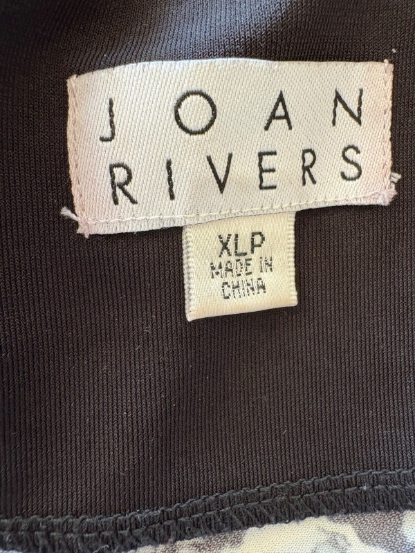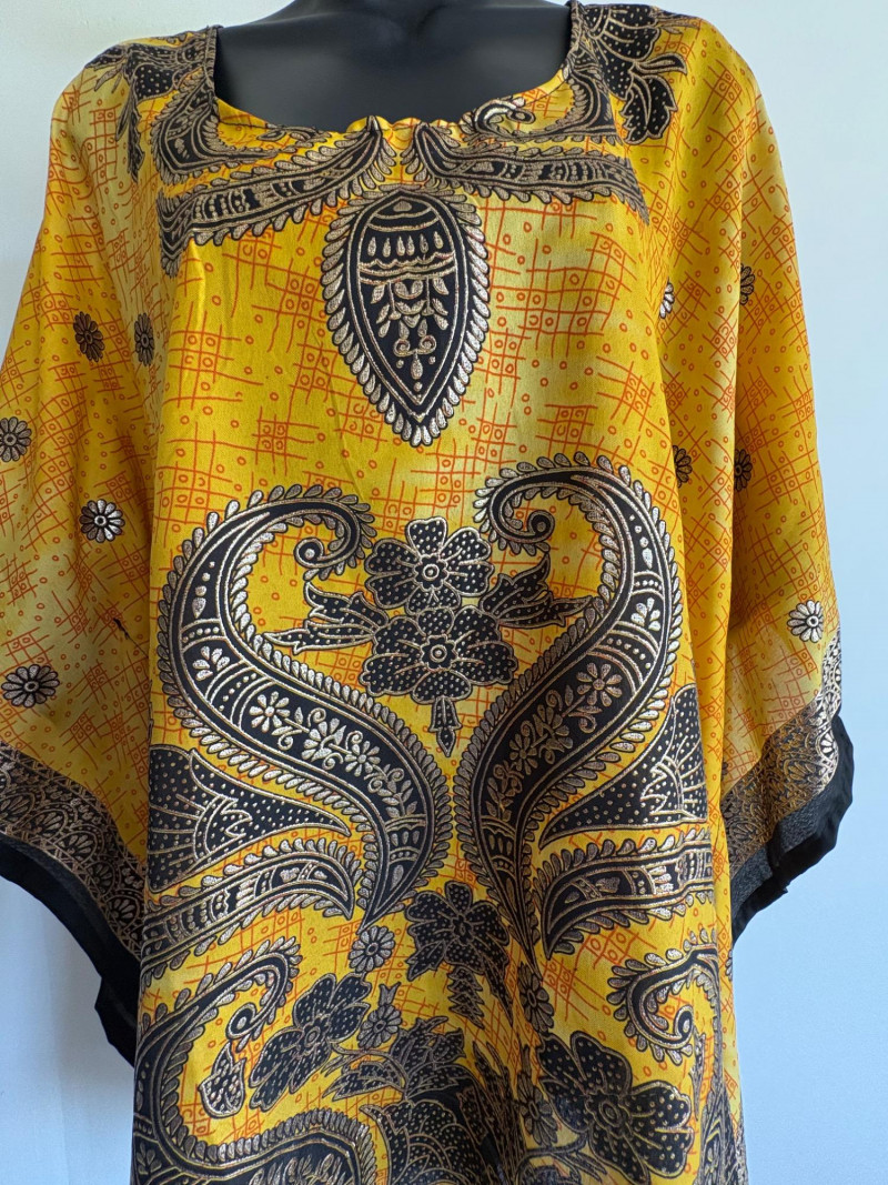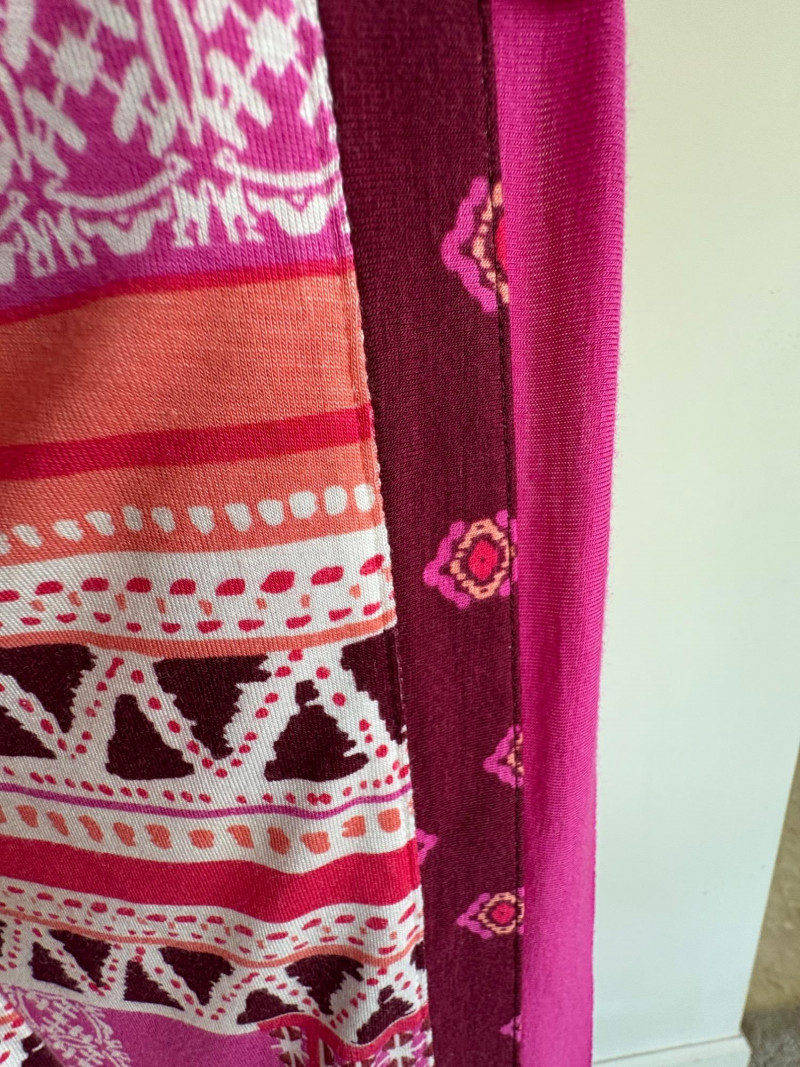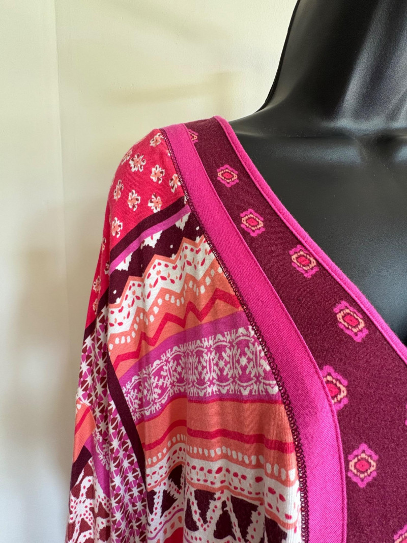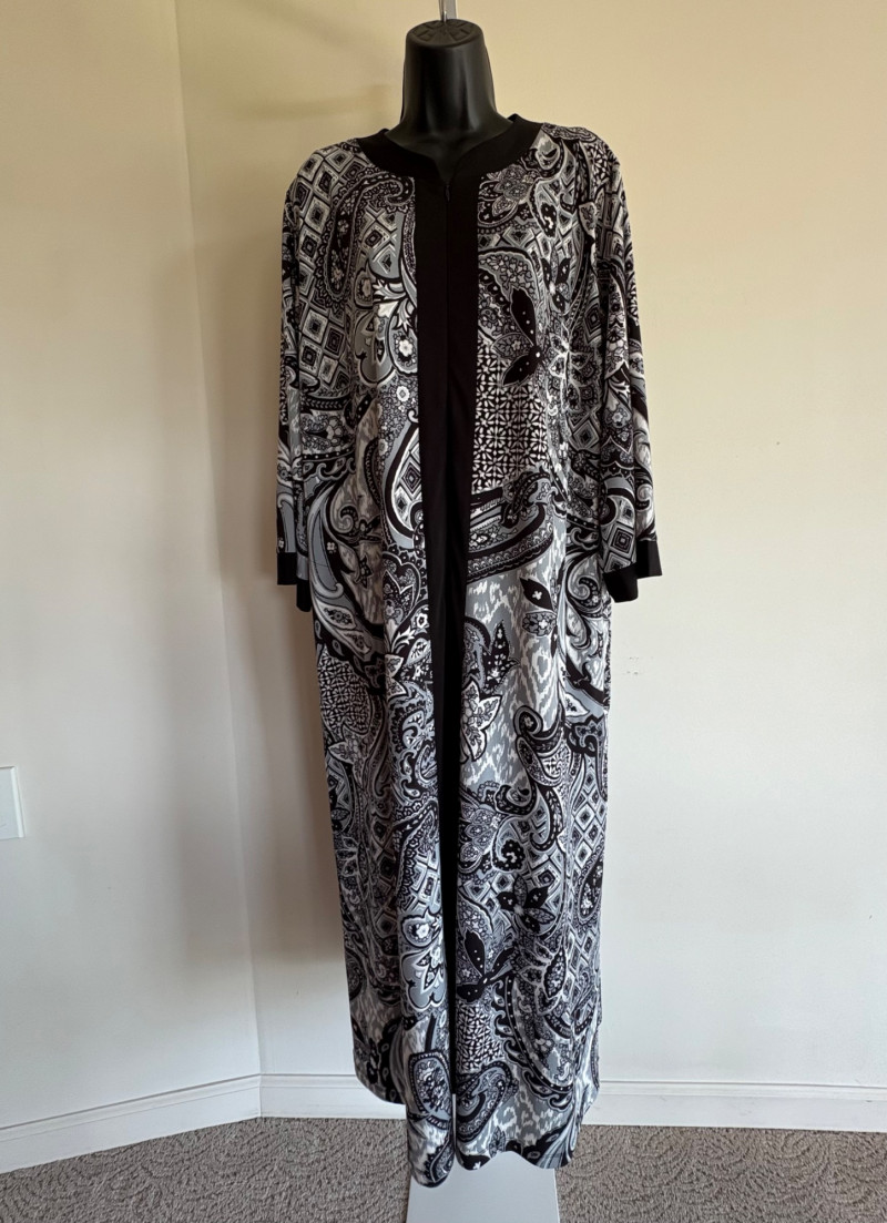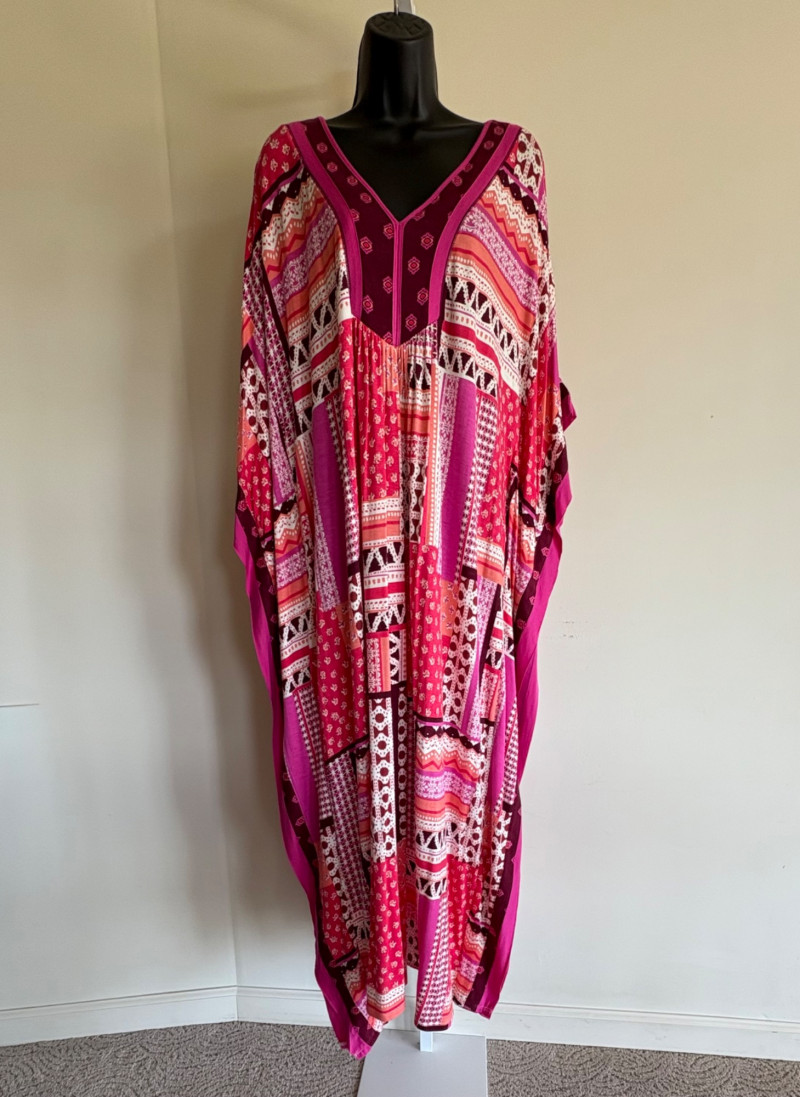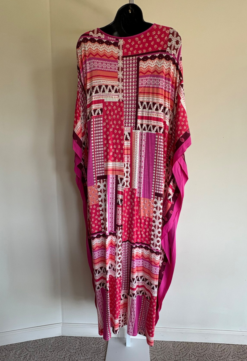 3 wonderfully comfortable caftans - one in soft knit, one in smooth knit, and the last in silky woven. Long multi-colored pink caftan from Ellen Tracy in soft cotton knit has a gathered tunic-style front yoke and will fit virtually any figure. Dressy enough to wear as a beach cover up to stay out of the sun, but comfy enough to serve as your favorite housedress when spending the day at home. 95% rayon with 5% spandex; it feels like your favorite t-shirt that's been washed a million times. In very good used condition. 44" from back neckline to bottom hem. Size tag says X/XL. Black, grey, and white knit caftan from Joan Rivers is really more of a housedress in a caftan-like style, but has designated sleeves. Black bordered zip-front with smooth paisley print. In excellent condition. 91% polyester with 9% spandex. Measures 25.5" pit to pit and 48" from back neck seam to bottom hem. Size tag says XL Petite. Gold, red, and black shorter caftan from Metropolitan has great border printing, iridescent gold sections, and a scoop neck. Great beach coverup or casual shirt. 100% polyester. Measures 33" from back neckline to bottom hem. (Not the same quality as the other two caftans, but useful nonetheless!). Size tag says OSFA.