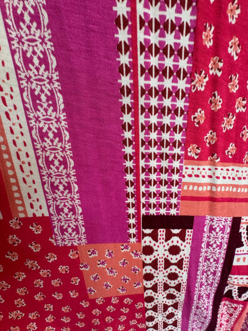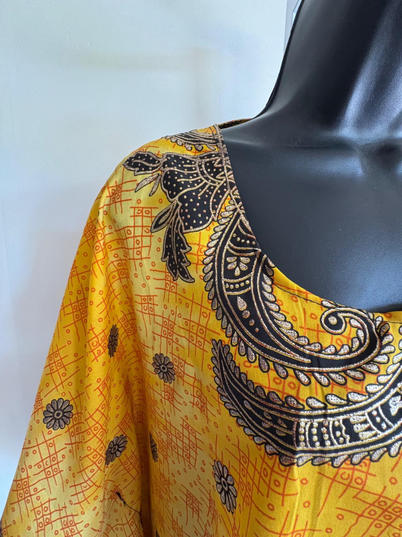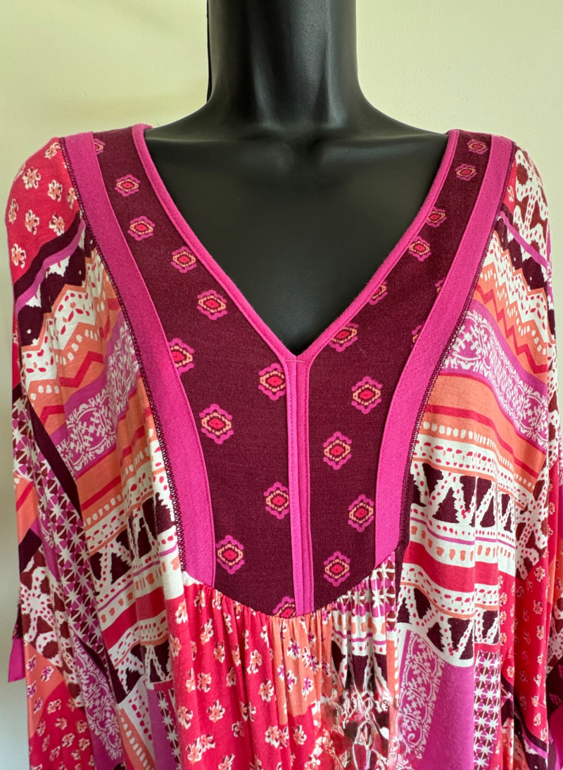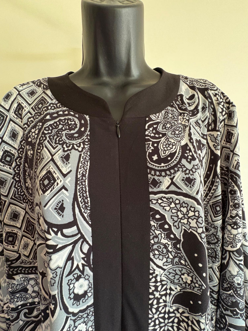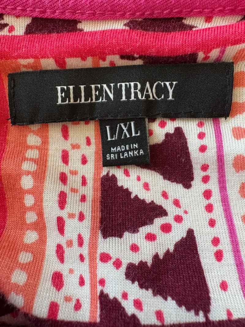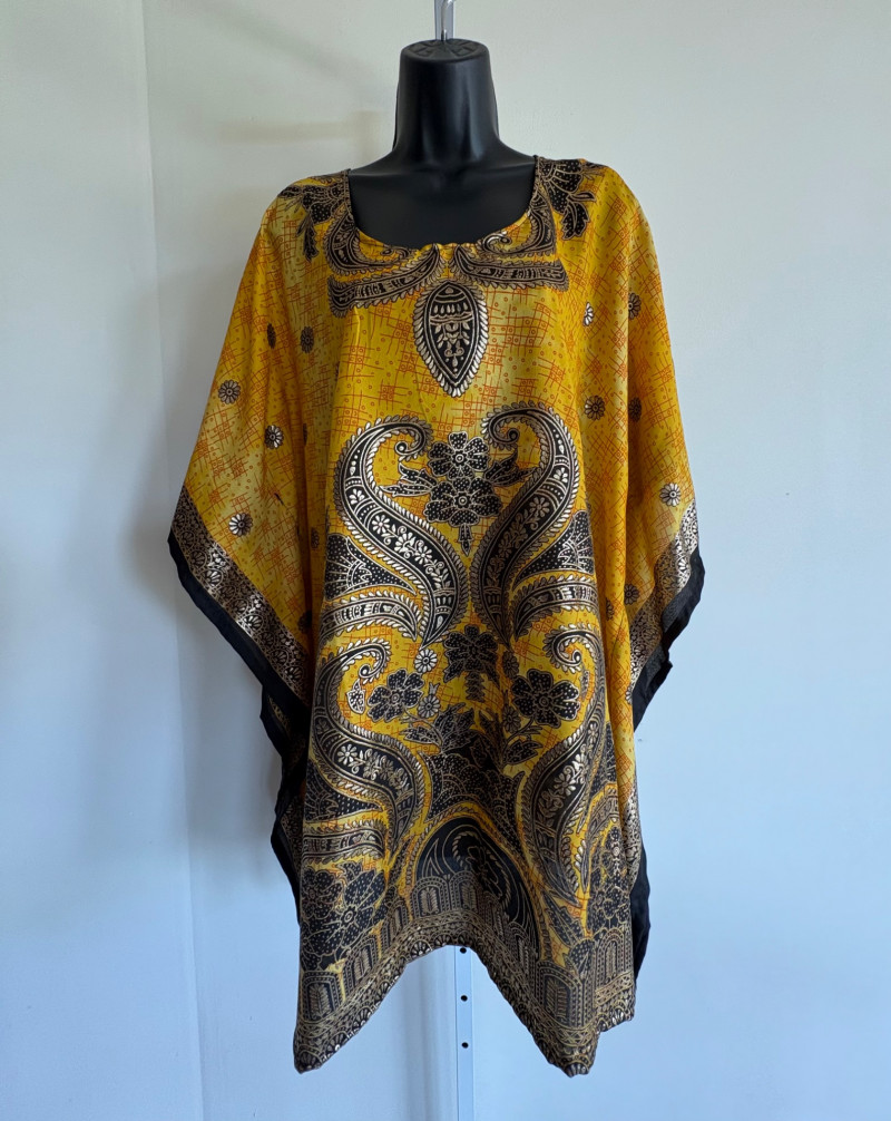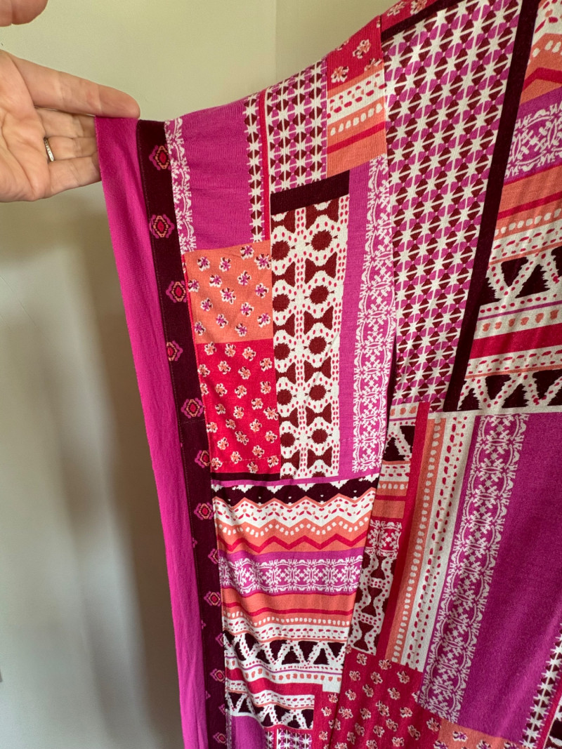 3 wonderfully comfortable caftans - one in soft knit, one in smooth knit, and the last in silky woven. Long multi-colored pink caftan from Ellen Tracy in soft cotton knit has a gathered tunic-style front yoke and will fit virtually any figure. Dressy enough to wear as a beach cover up to stay out of the sun, but comfy enough to serve as your favorite housedress when spending the day at home. 95% rayon with 5% spandex; it feels like your favorite t-shirt that's been washed a million times. In very good used condition. 44" from back neckline to bottom hem. Size tag says X/XL. Black, grey, and white knit caftan from Joan Rivers is really more of a housedress in a caftan-like style, but has designated sleeves. Black bordered zip-front with smooth paisley print. In excellent condition. 91% polyester with 9% spandex. Measures 25.5" pit to pit and 48" from back neck seam to bottom hem. Size tag says XL Petite. Gold, red, and black shorter caftan from Metropolitan has great border printing, iridescent gold sections, and a scoop neck. Great beach coverup or casual shirt. 100% polyester. Measures 33" from back neckline to bottom hem. (Not the same quality as the other two caftans, but useful nonetheless!). Size tag says OSFA.