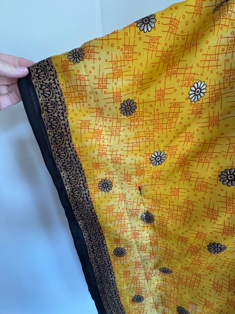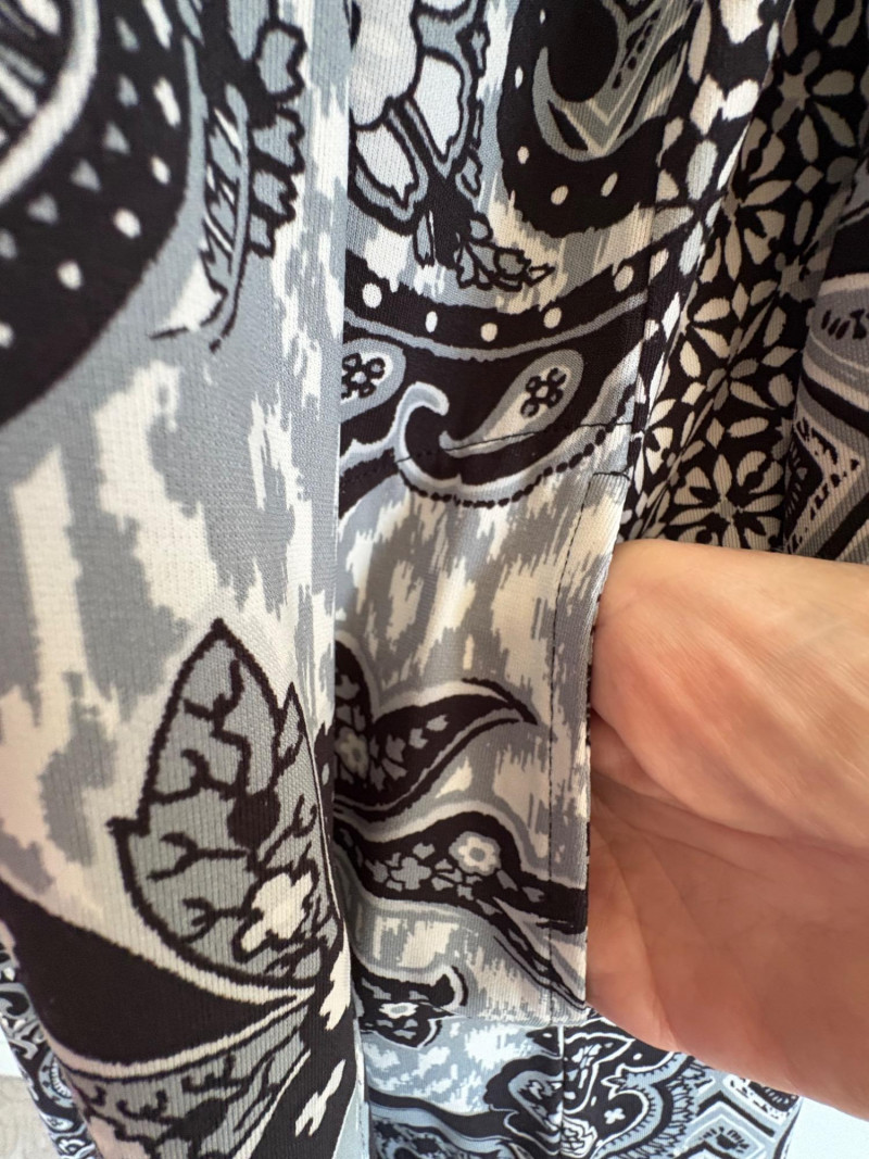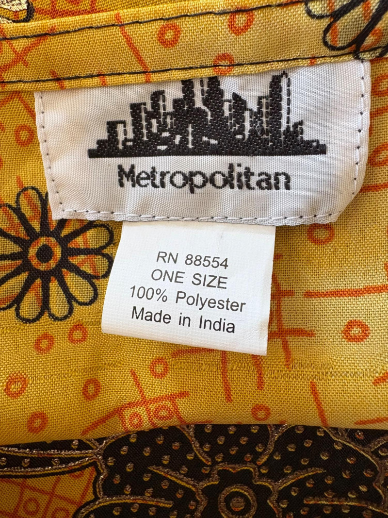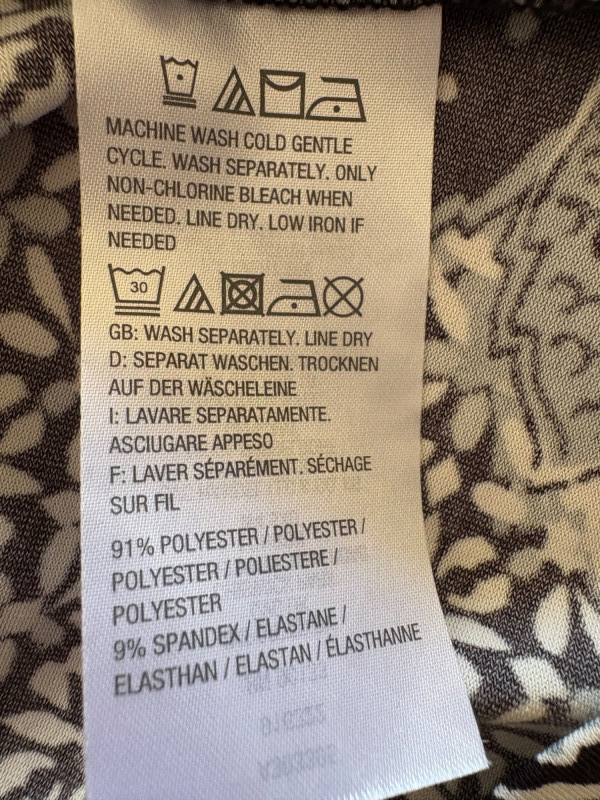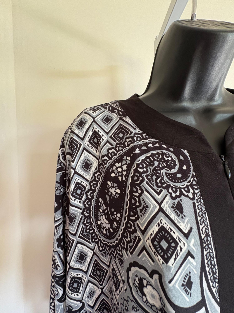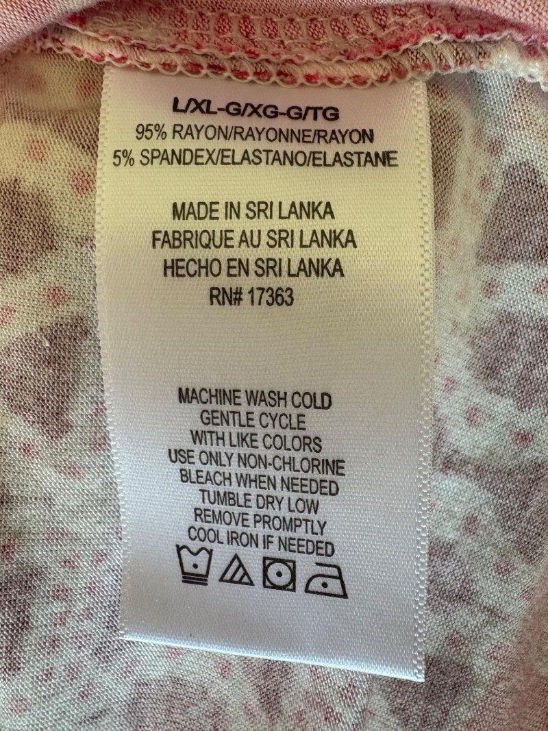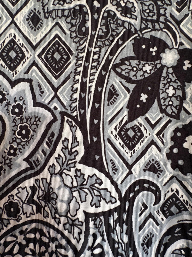 3 wonderfully comfortable caftans - one in soft knit, one in smooth knit, and the last in silky woven. Long multi-colored pink caftan from Ellen Tracy in soft cotton knit has a gathered tunic-style front yoke and will fit virtually any figure. Dressy enough to wear as a beach cover up to stay out of the sun, but comfy enough to serve as your favorite housedress when spending the day at home. 95% rayon with 5% spandex; it feels like your favorite t-shirt that's been washed a million times. In very good used condition. 44" from back neckline to bottom hem. Size tag says X/XL. Black, grey, and white knit caftan from Joan Rivers is really more of a housedress in a caftan-like style, but has designated sleeves. Black bordered zip-front with smooth paisley print. In excellent condition. 91% polyester with 9% spandex. Measures 25.5" pit to pit and 48" from back neck seam to bottom hem. Size tag says XL Petite. Gold, red, and black shorter caftan from Metropolitan has great border printing, iridescent gold sections, and a scoop neck. Great beach coverup or casual shirt. 100% polyester. Measures 33" from back neckline to bottom hem. (Not the same quality as the other two caftans, but useful nonetheless!). Size tag says OSFA.