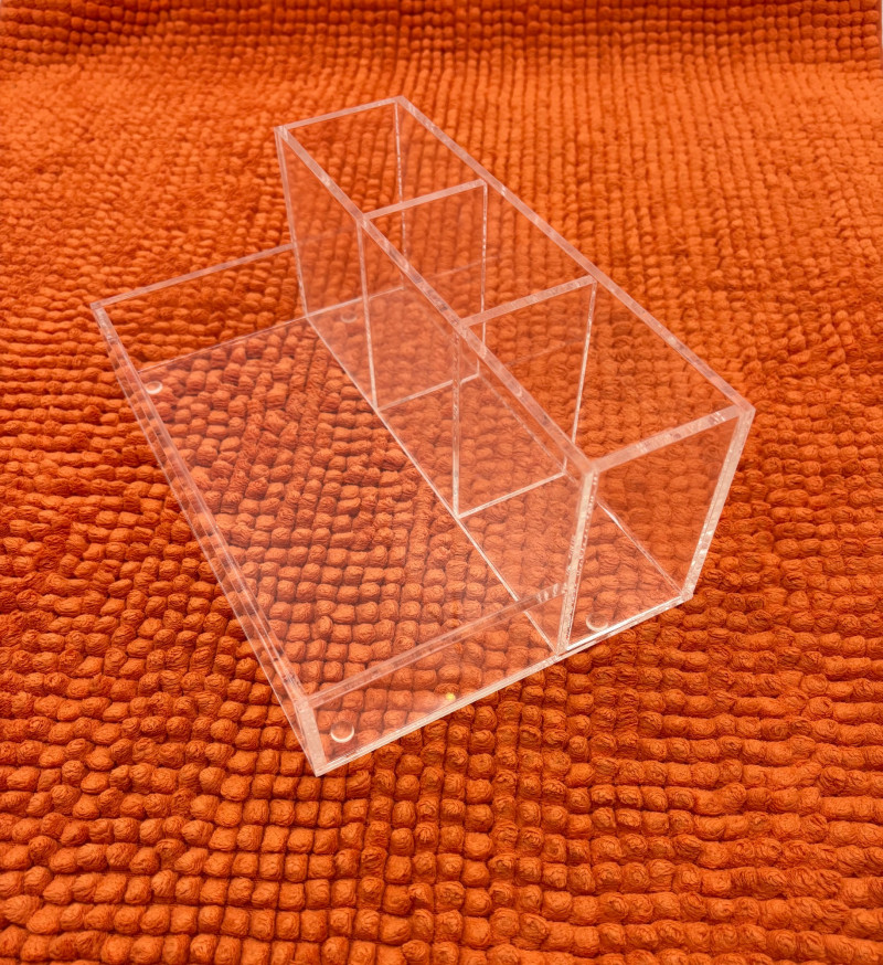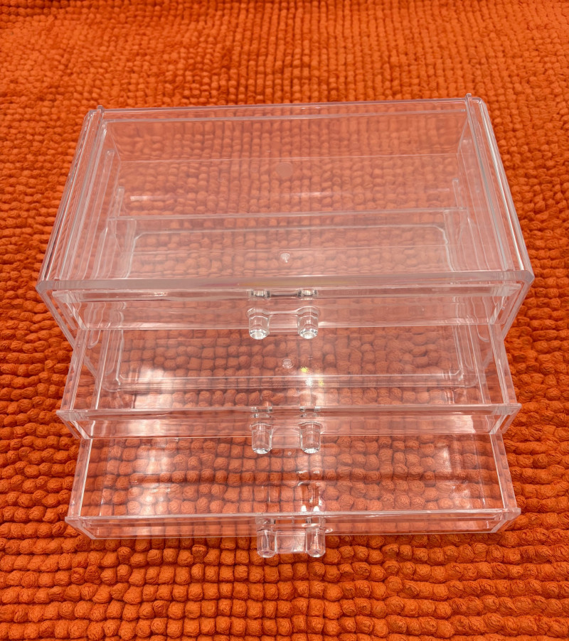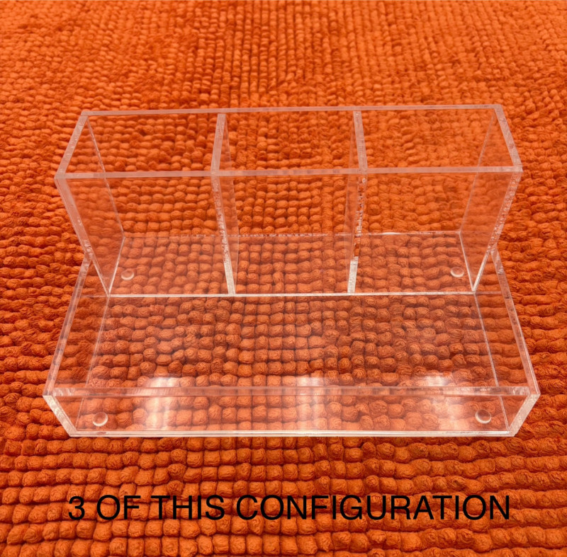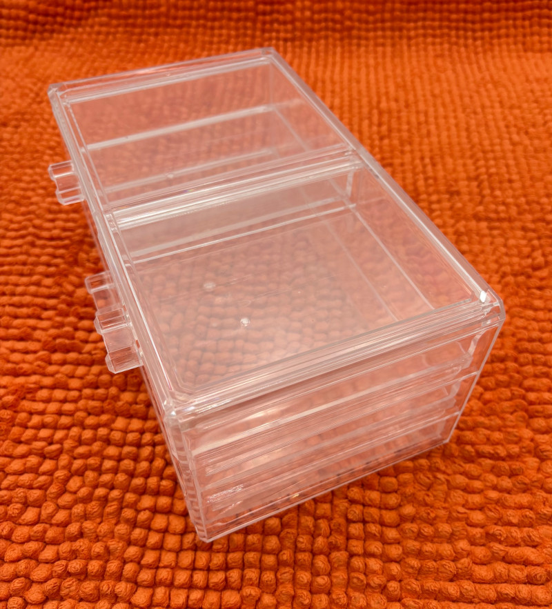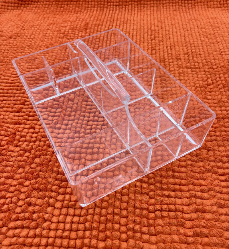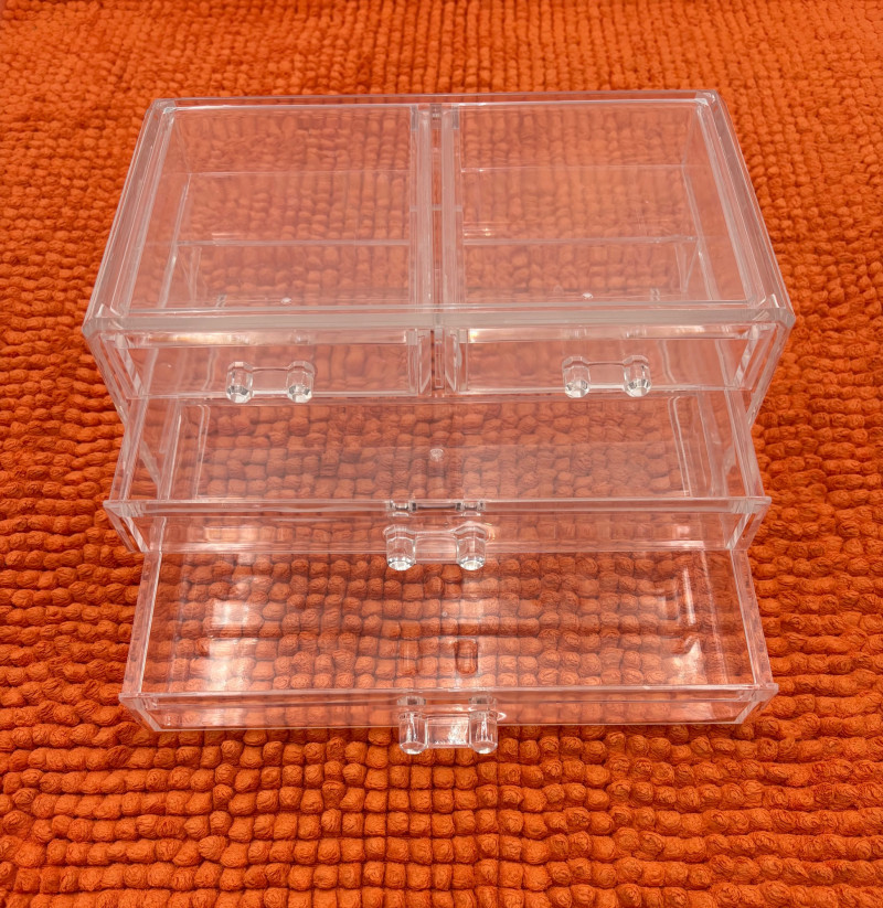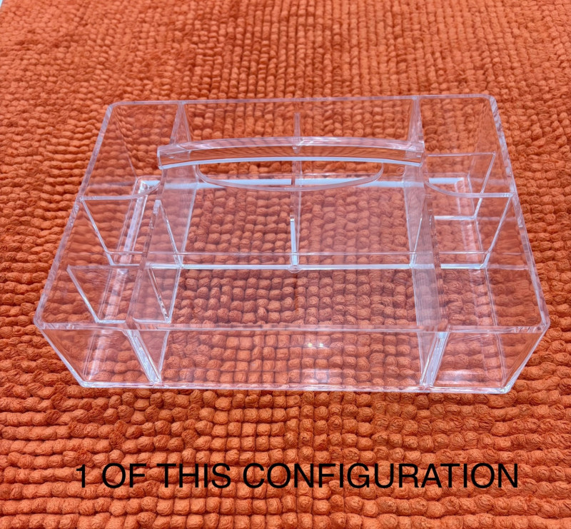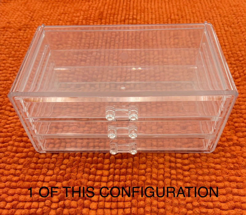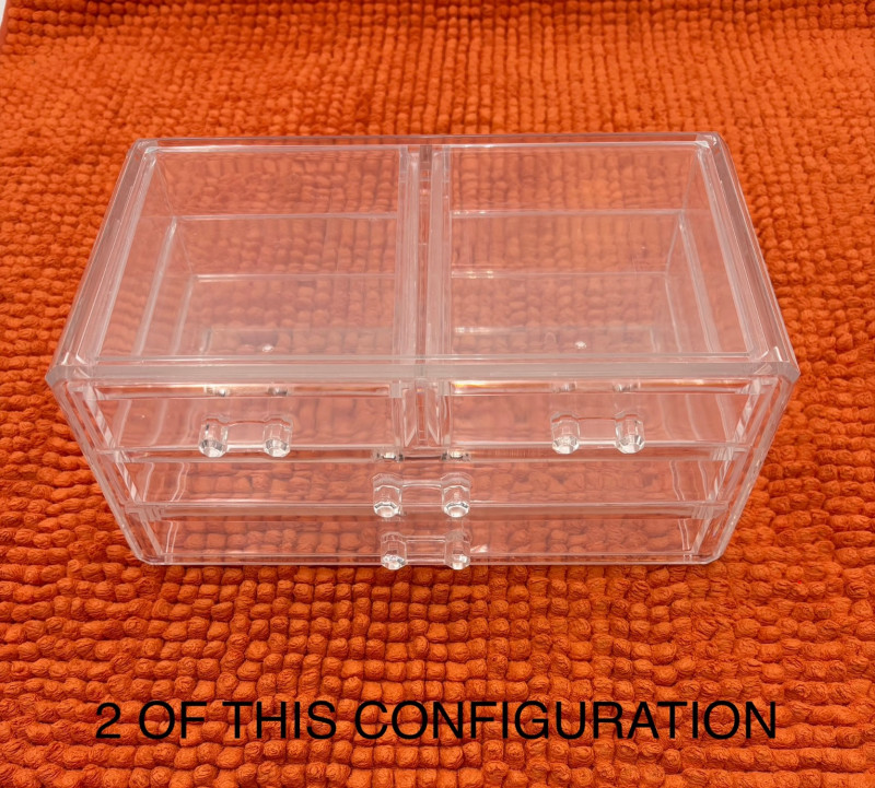 Wonderful group of acrylic storage for your makeup, skincare, jewelry or other needs. You can see what you have without opening anything up! All pieces could use a good wash. 3 open trays with tripartite holders in the rear. Measure 3.5" H x 9" W x 6" D. 1 handled tray with various size compartments. Measures 4" H at handle x 10" W x 7.5" D. 2 four-drawer chests with two wide lower drawers below 2 small drawers. Measures 4.5" H x 9.25" W x 6" D. 1 three-drawer chest with wide drawers. This chest measures the same as the two above, but has cracks on the lowest drawer handle. Doesn't affect the function of the drawer/drawer handle and not really very noticeable, but we wanted to mention.