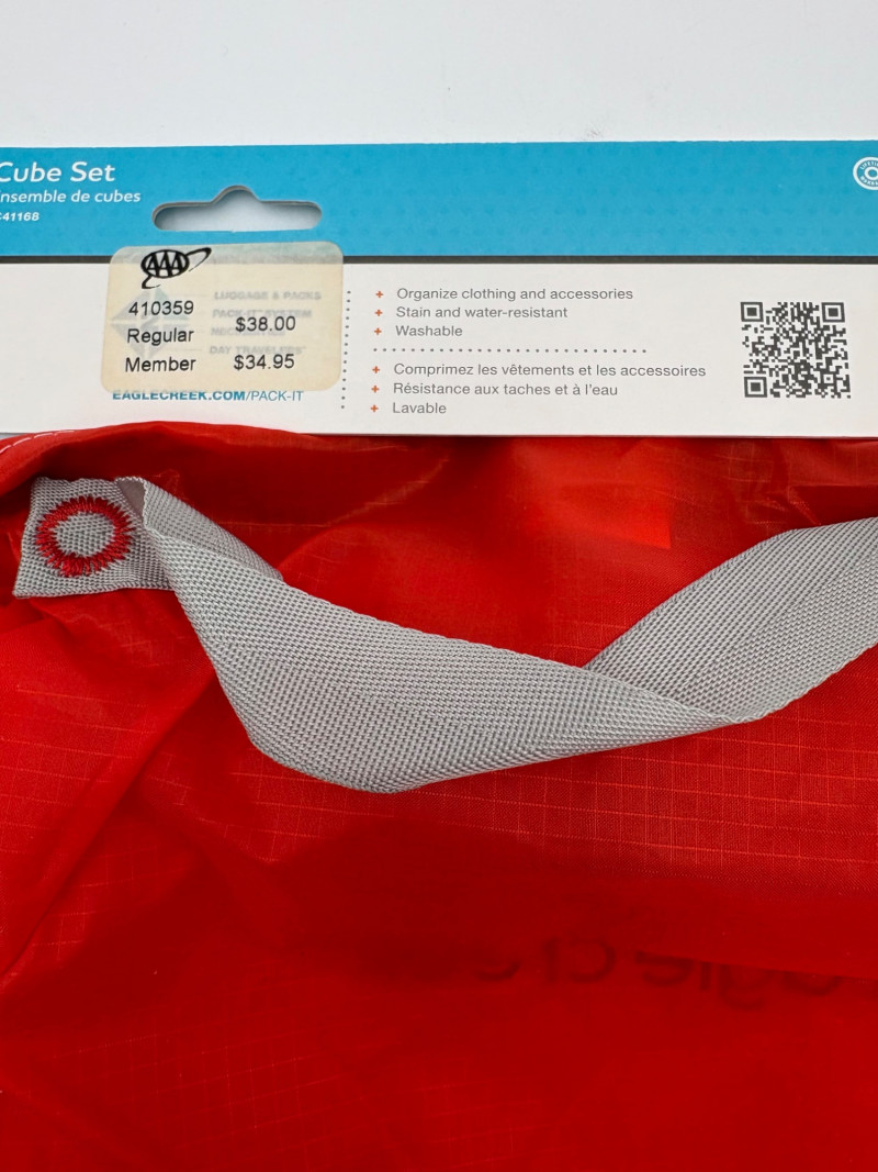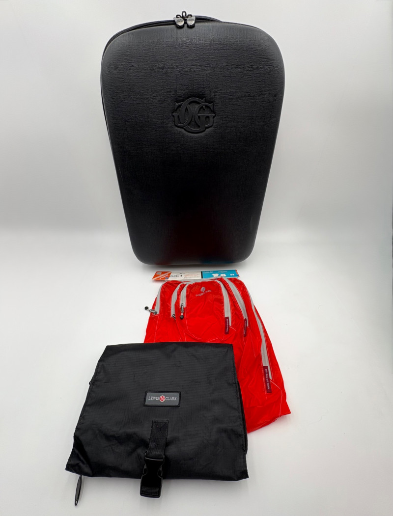 Great carry-on hardside suitcase from Guess. Has telescoping handle, 2-way zippers, pocketed separator, inside lid pocket, and click restraints. Measures approx. 21" x 14" x 7". In very good used condition with a few negligible scuffs. 3 packing cubes in bright orange from Eagle Creek. New with tag. Hanging toiletry bag from Lewis N Clark.. Multiple net & solid fabric compartments as well as one clear one. Made of rip-stop nylon and folds compactly. Measures 10.5" W x 8.5" H when empty and folded, but will accommodate thick items with adjustable click closure. In very good used condition.