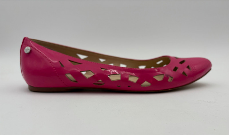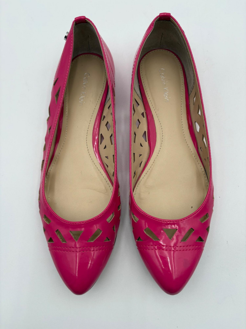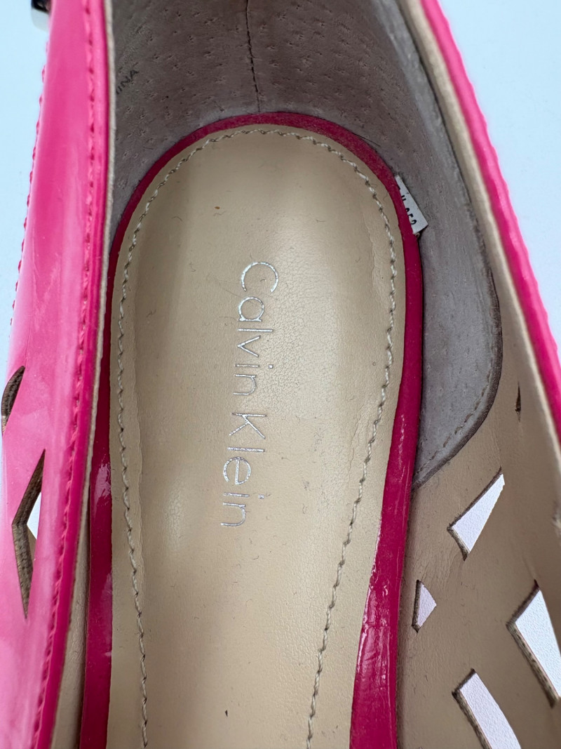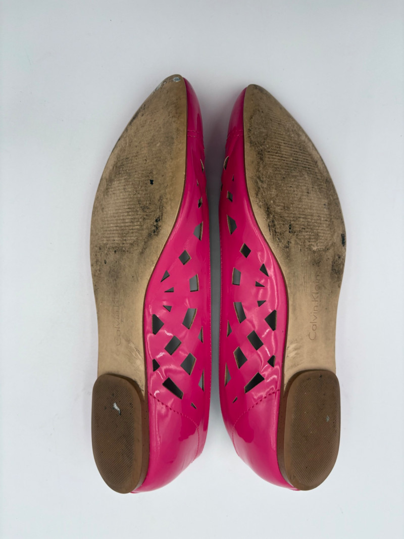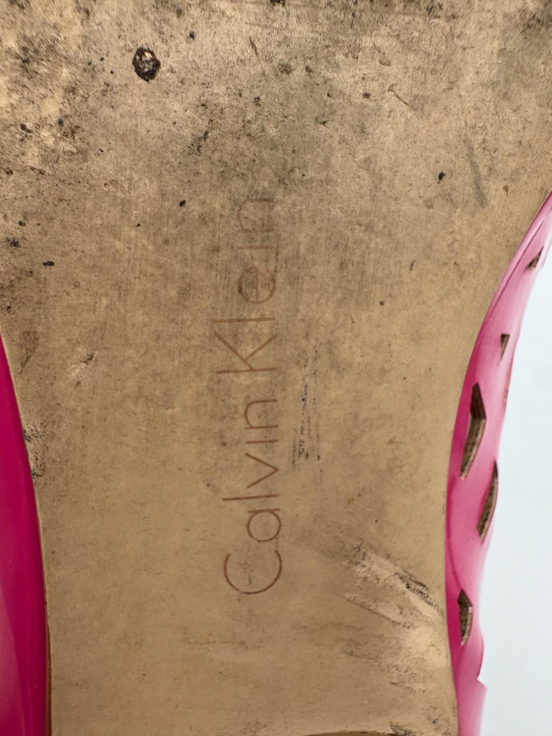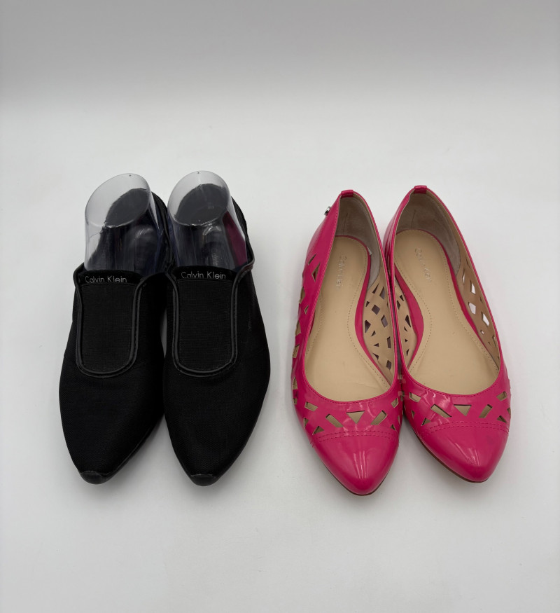 Tow pairs of very different summer shoes from Calvin Klein that will keep your feet cool in the heat while still looking stylish. Black "net" loafers have flexile rubber sole, suede heel wrap, pointed toes, and elasticated section over the tongue at the top of the foot for great fit. In good used condition with the piping on the ankle appearing a bit loose. Size 7. Pink patent flats with narrow rubber sole and geometric cut-outs in the uppers. In good used condition with one black smudge on the right left shoe - see last photo.. Size 7.