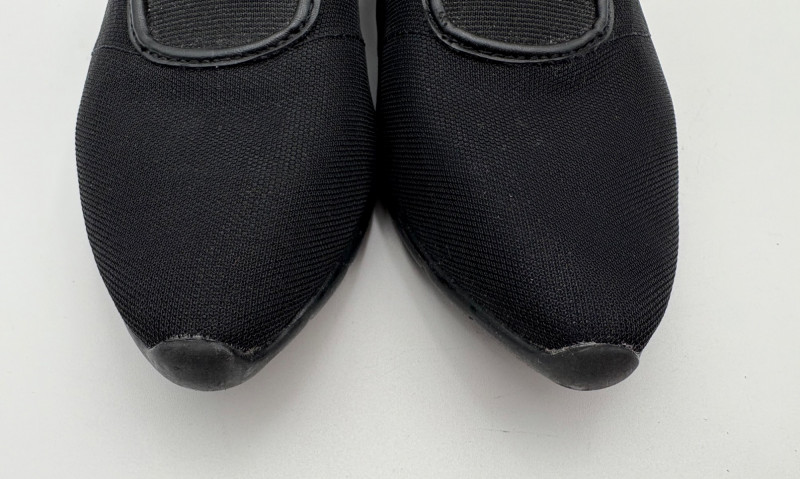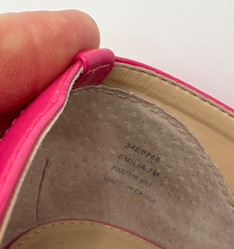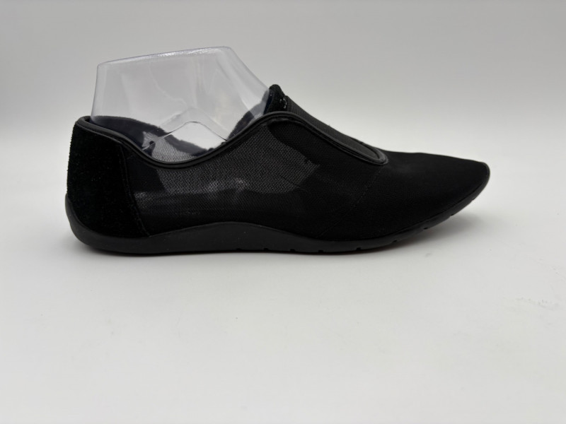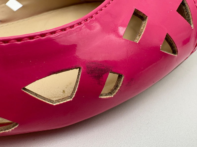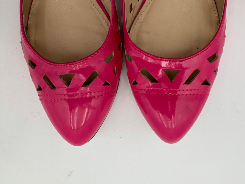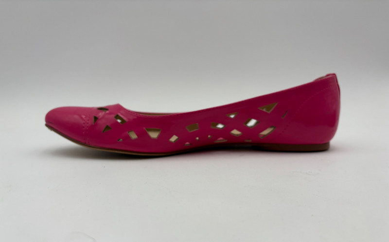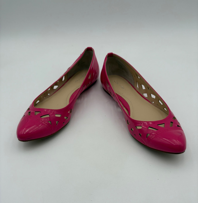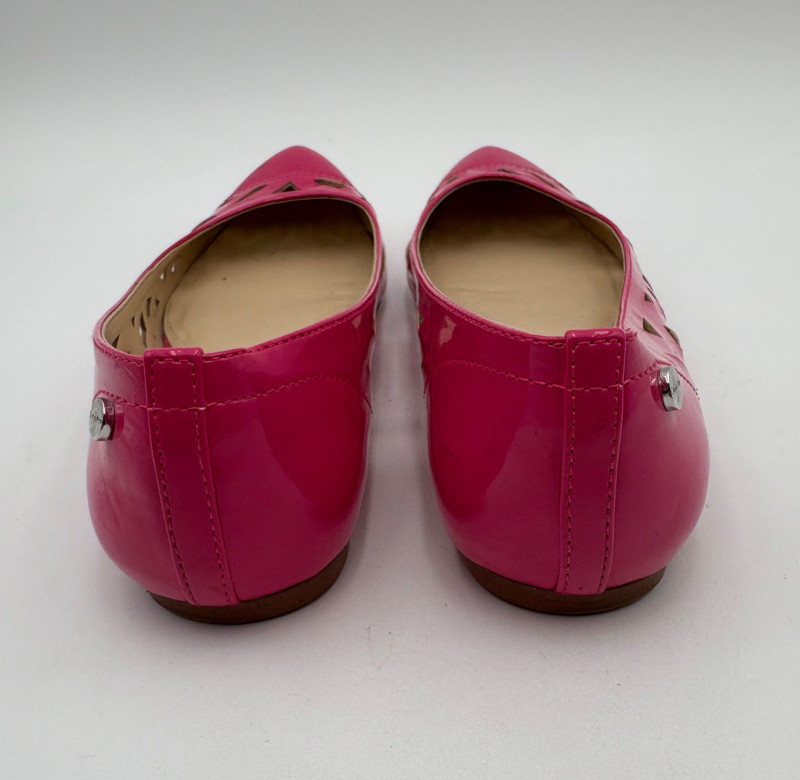 Tow pairs of very different summer shoes from Calvin Klein that will keep your feet cool in the heat while still looking stylish. Black "net" loafers have flexile rubber sole, suede heel wrap, pointed toes, and elasticated section over the tongue at the top of the foot for great fit. In good used condition with the piping on the ankle appearing a bit loose. Size 7. Pink patent flats with narrow rubber sole and geometric cut-outs in the uppers. In good used condition with one black smudge on the right left shoe - see last photo.. Size 7.