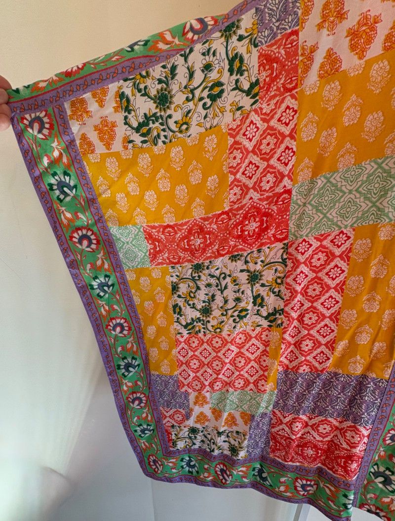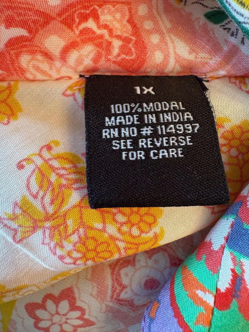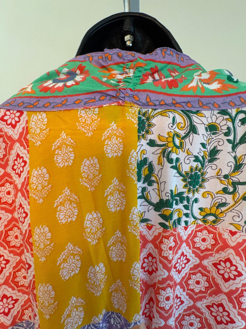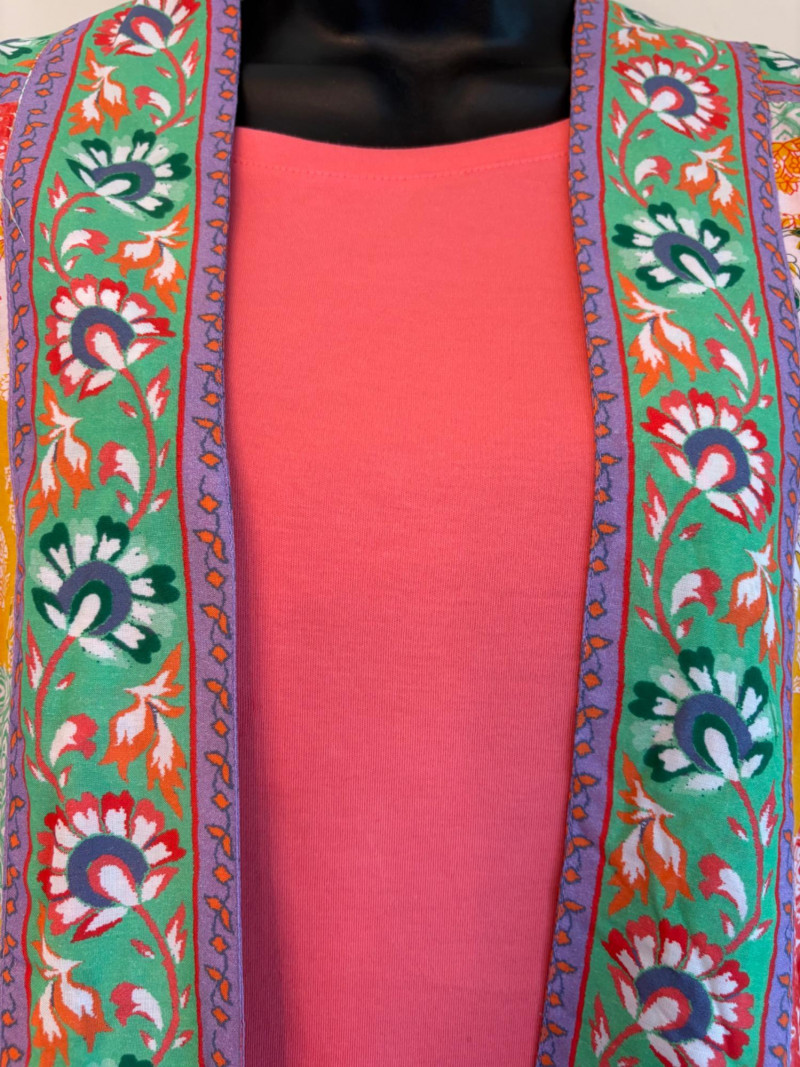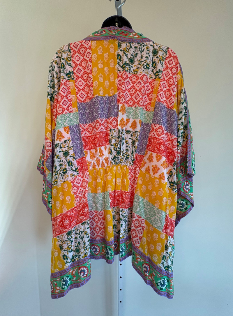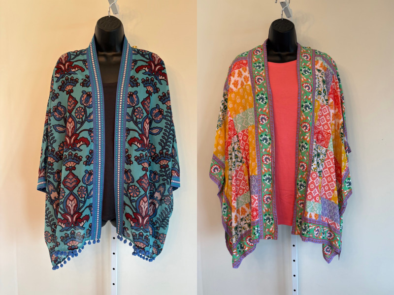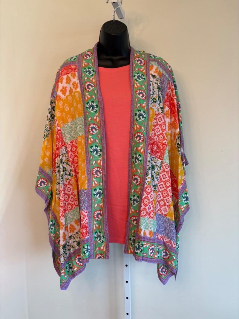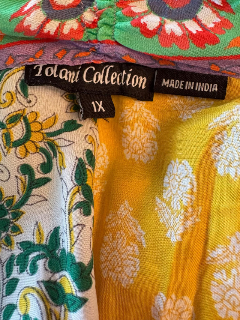 4 tops that combine to take you from bright daytime colors to more subdued evening colors during the heat of summer. For day: Super lightweight stretchy knit t-shirt from Eileen Fisher in black with elbow length sleeves. In excellent condition. 70% silk with 30% cotton. Measures 23" pit to pit and 22" L. Size tag says XL. Blue-tone caftan-style floral print piece from Colleen Lopez has blue embroidered border along the neck & cuffs with tassels on the lower hem. 100% polyester. In excellent condition. Free size with 27" L. Size tag says XL. For evening: High quality knit t-shirt from Isaac Mizrahi has short sleeves and curved neckline. 100% cotton. In excellent condition. Measures 24" pit to pit and 26" L. Size tag says XL. Cheery patchwork fabric caftan-style piece from Tolani Collection has squared off sleeves and shirred elastic at the back waist & neck. 100% modal. In excellent condition. Free size with 28" L. Size tag says 1X.