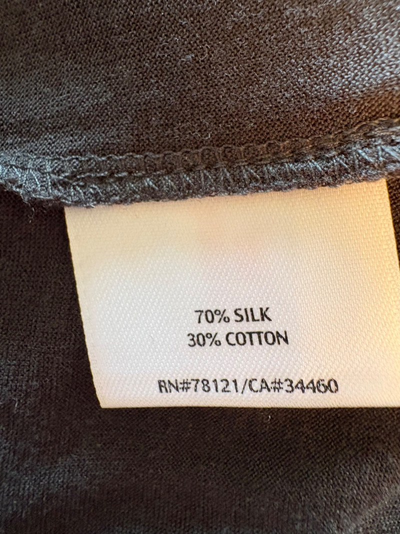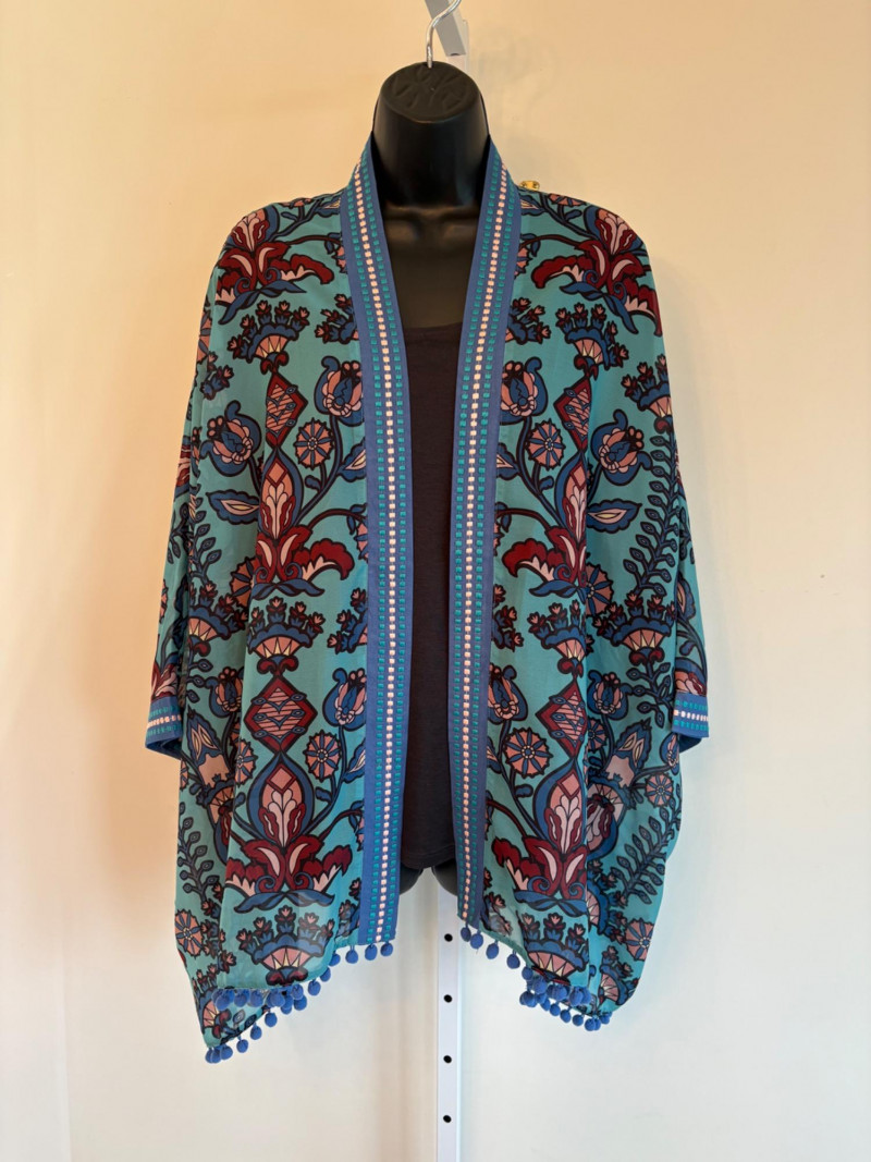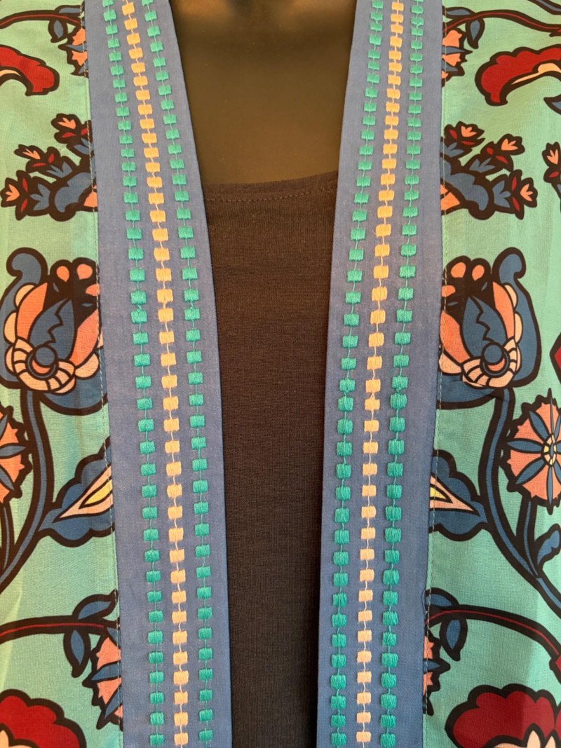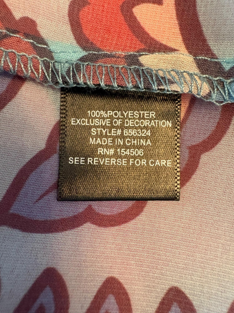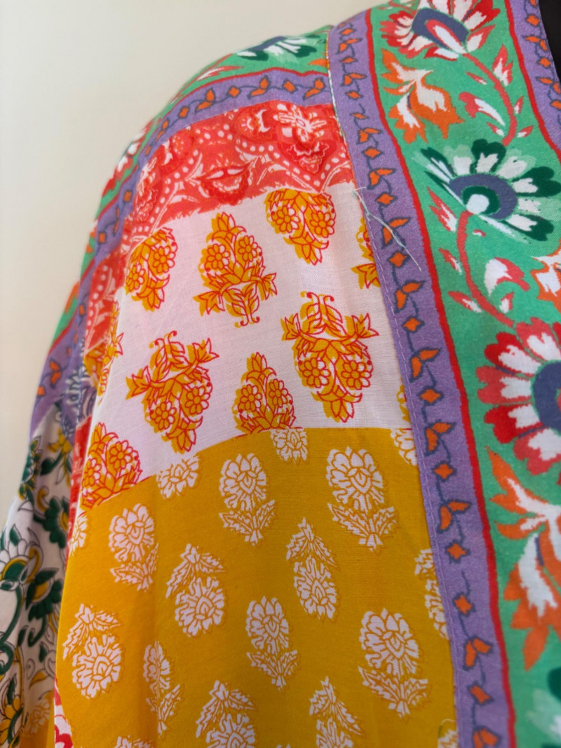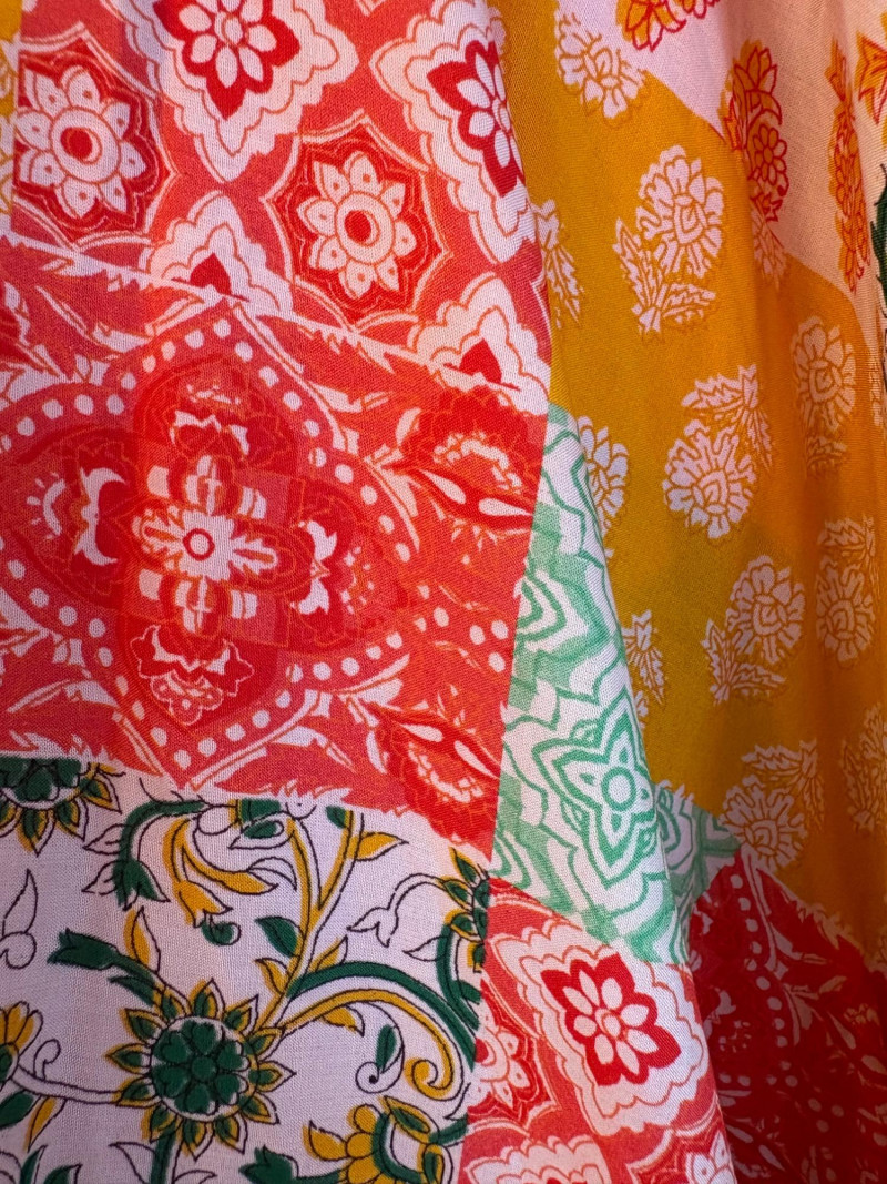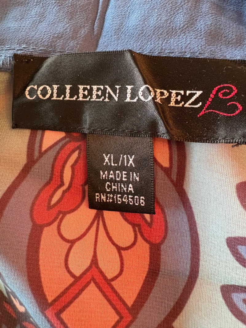 4 tops that combine to take you from bright daytime colors to more subdued evening colors during the heat of summer. For day: Super lightweight stretchy knit t-shirt from Eileen Fisher in black with elbow length sleeves. In excellent condition. 70% silk with 30% cotton. Measures 23" pit to pit and 22" L. Size tag says XL. Blue-tone caftan-style floral print piece from Colleen Lopez has blue embroidered border along the neck & cuffs with tassels on the lower hem. 100% polyester. In excellent condition. Free size with 27" L. Size tag says XL. For evening: High quality knit t-shirt from Isaac Mizrahi has short sleeves and curved neckline. 100% cotton. In excellent condition. Measures 24" pit to pit and 26" L. Size tag says XL. Cheery patchwork fabric caftan-style piece from Tolani Collection has squared off sleeves and shirred elastic at the back waist & neck. 100% modal. In excellent condition. Free size with 28" L. Size tag says 1X.