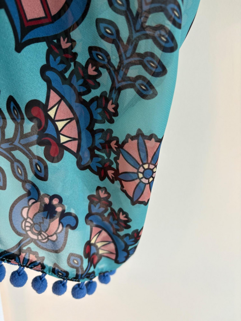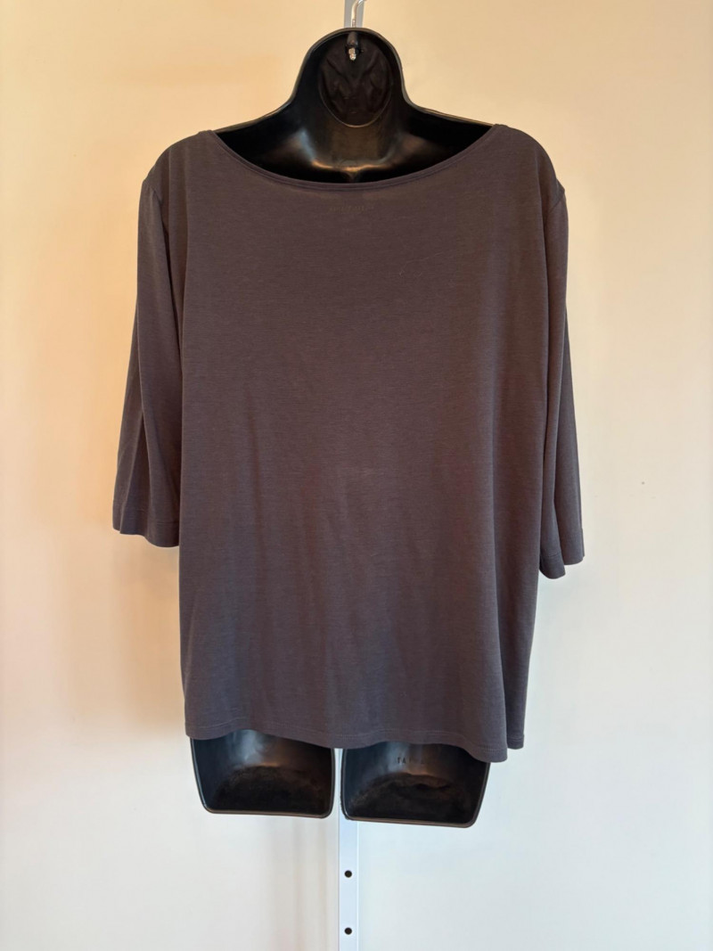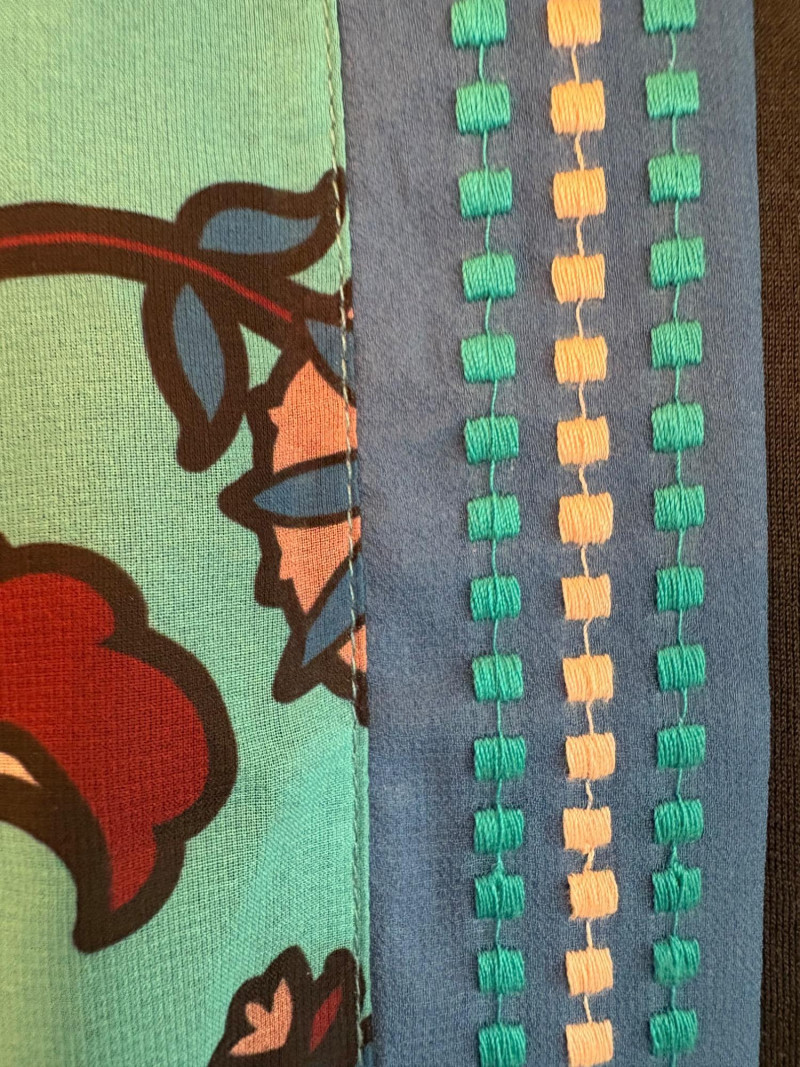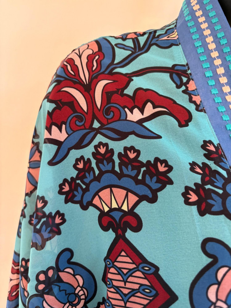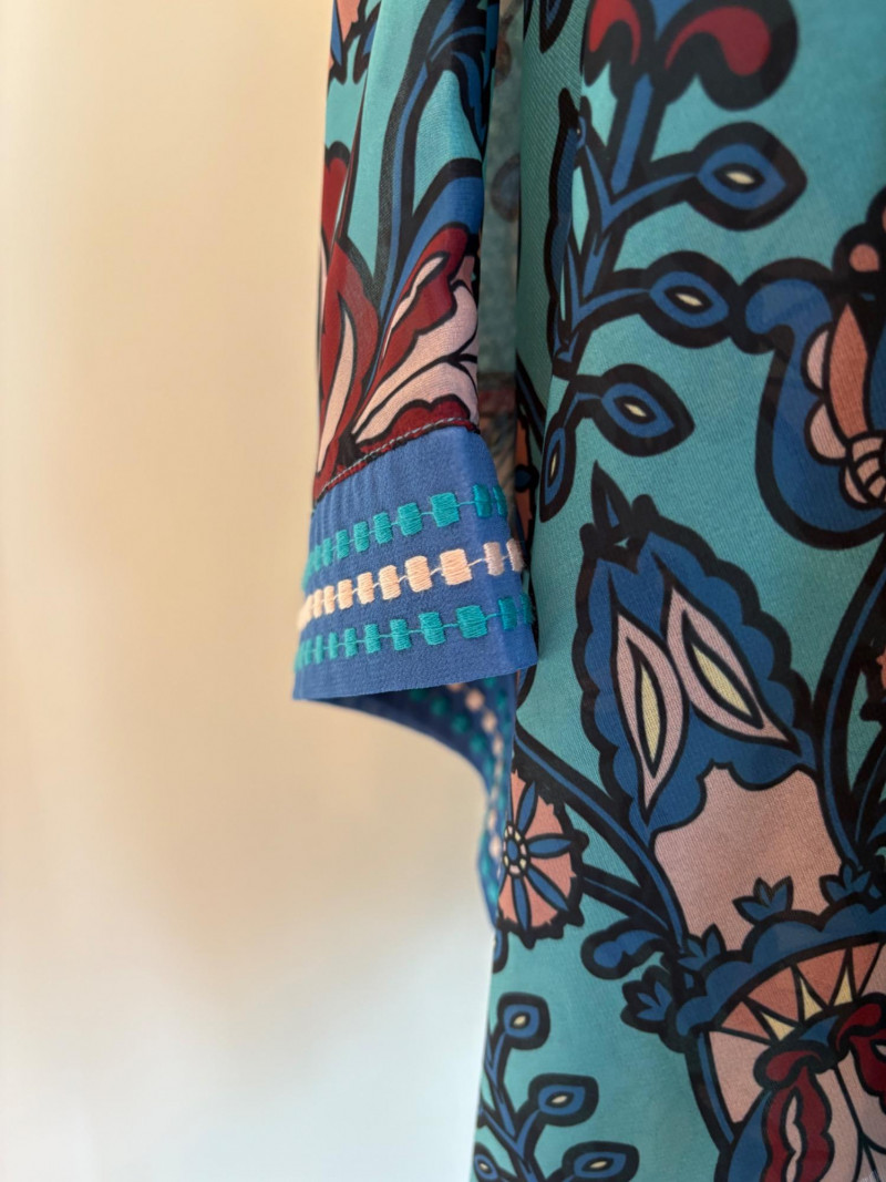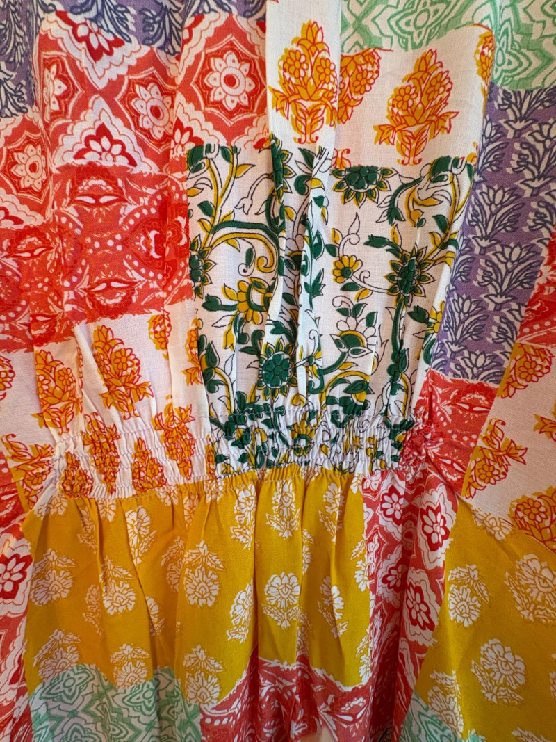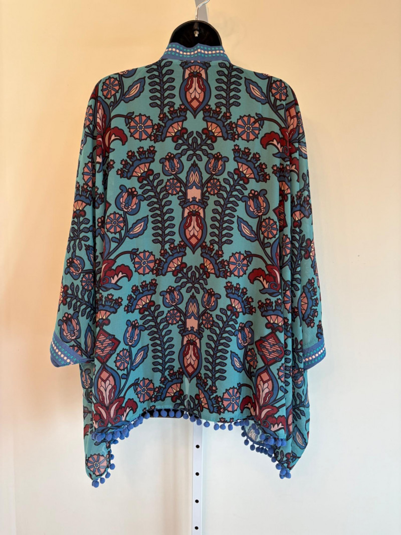 4 tops that combine to take you from bright daytime colors to more subdued evening colors during the heat of summer. For day: Super lightweight stretchy knit t-shirt from Eileen Fisher in black with elbow length sleeves. In excellent condition. 70% silk with 30% cotton. Measures 23" pit to pit and 22" L. Size tag says XL. Blue-tone caftan-style floral print piece from Colleen Lopez has blue embroidered border along the neck & cuffs with tassels on the lower hem. 100% polyester. In excellent condition. Free size with 27" L. Size tag says XL. For evening: High quality knit t-shirt from Isaac Mizrahi has short sleeves and curved neckline. 100% cotton. In excellent condition. Measures 24" pit to pit and 26" L. Size tag says XL. Cheery patchwork fabric caftan-style piece from Tolani Collection has squared off sleeves and shirred elastic at the back waist & neck. 100% modal. In excellent condition. Free size with 28" L. Size tag says 1X.