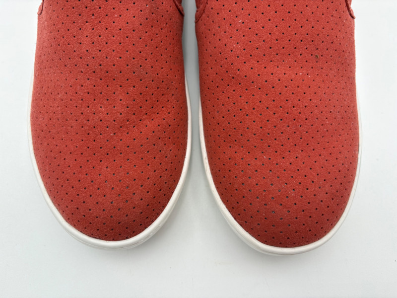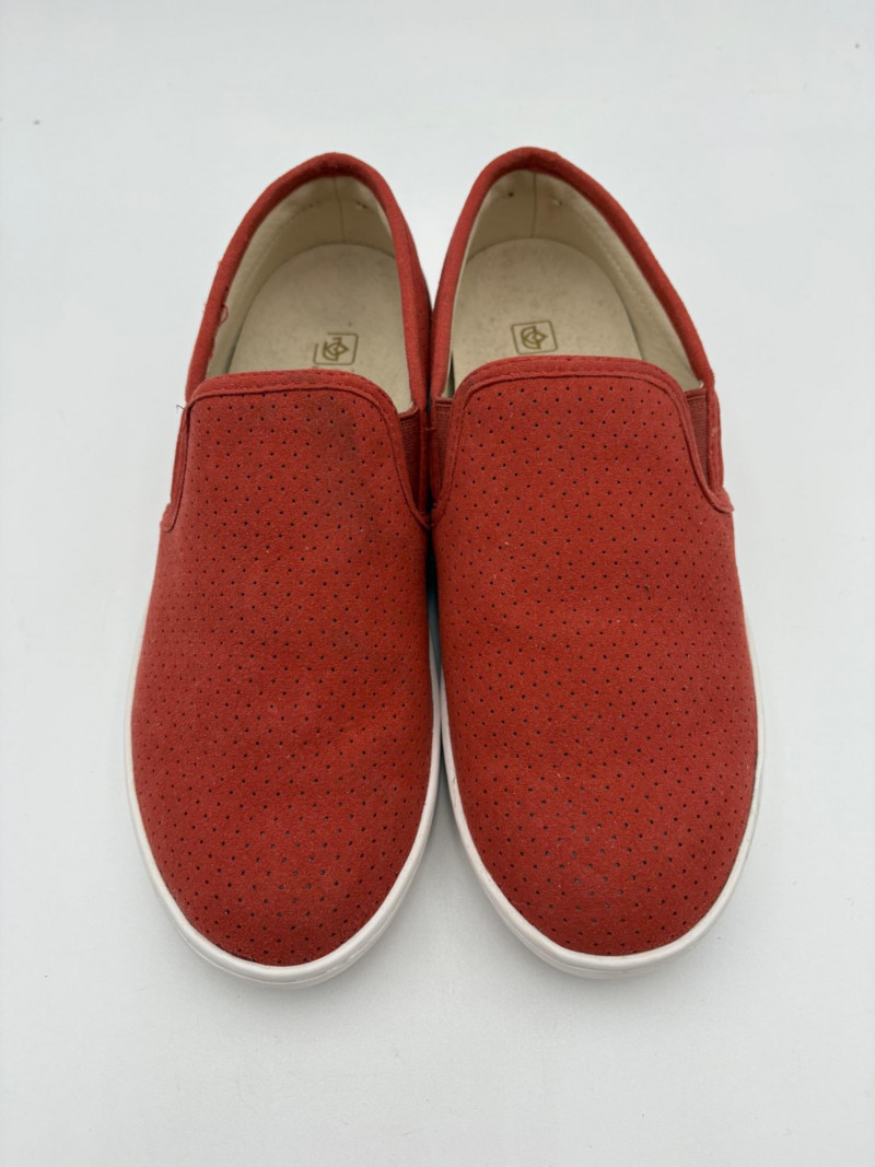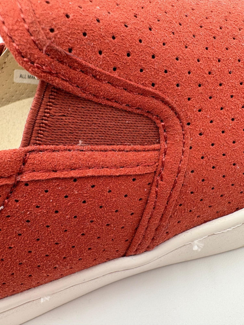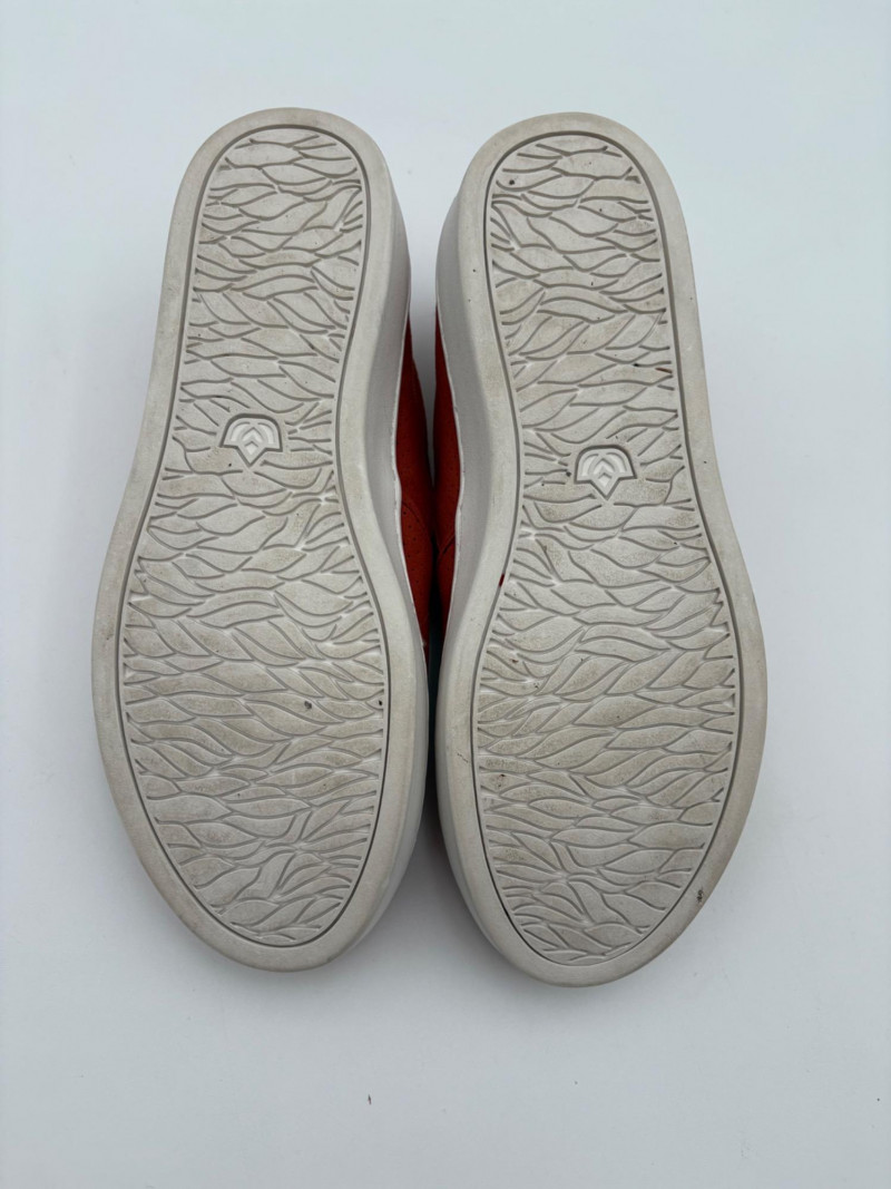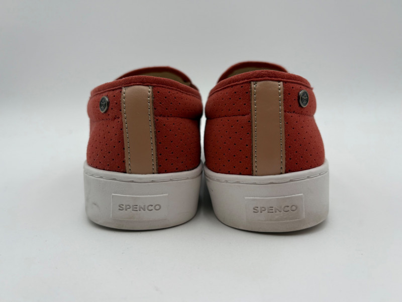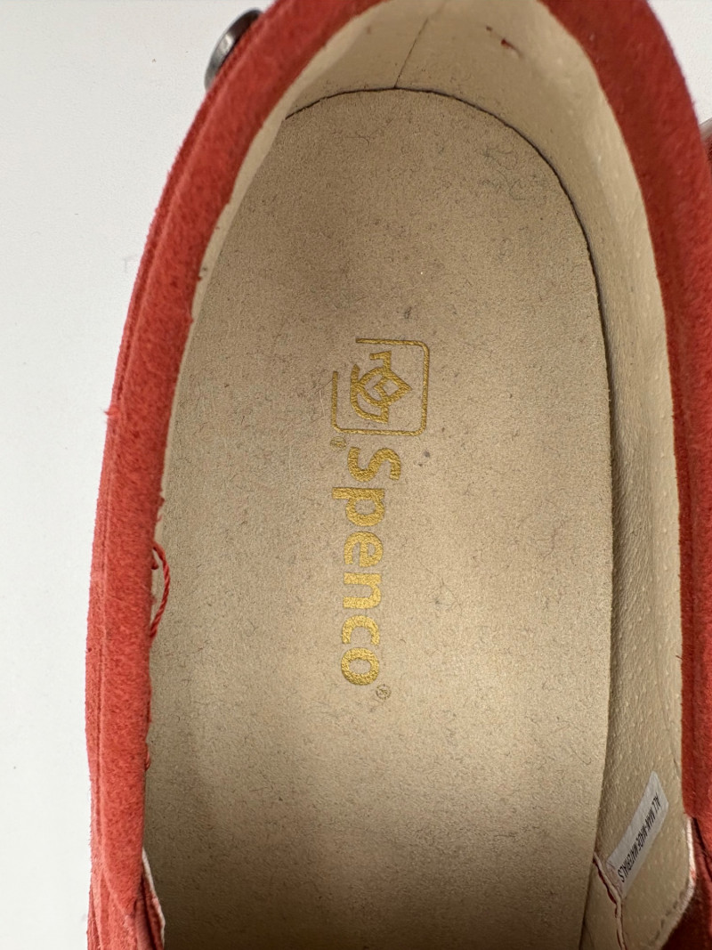 Great yellow leather slides with wide band over the foot and molded footbed with a non-slip rubber sole. In excellent condition - they don't show any signs of being worn other than to try on, Size 7. Orange perforated faux leather casual "boat" style shoes from Spenco. Thick white rubber sole, elasticated gussets between tongue and sides, and a heavily padded insole. In very good condition - very little wear on either the soles or the uppers. Size 7.