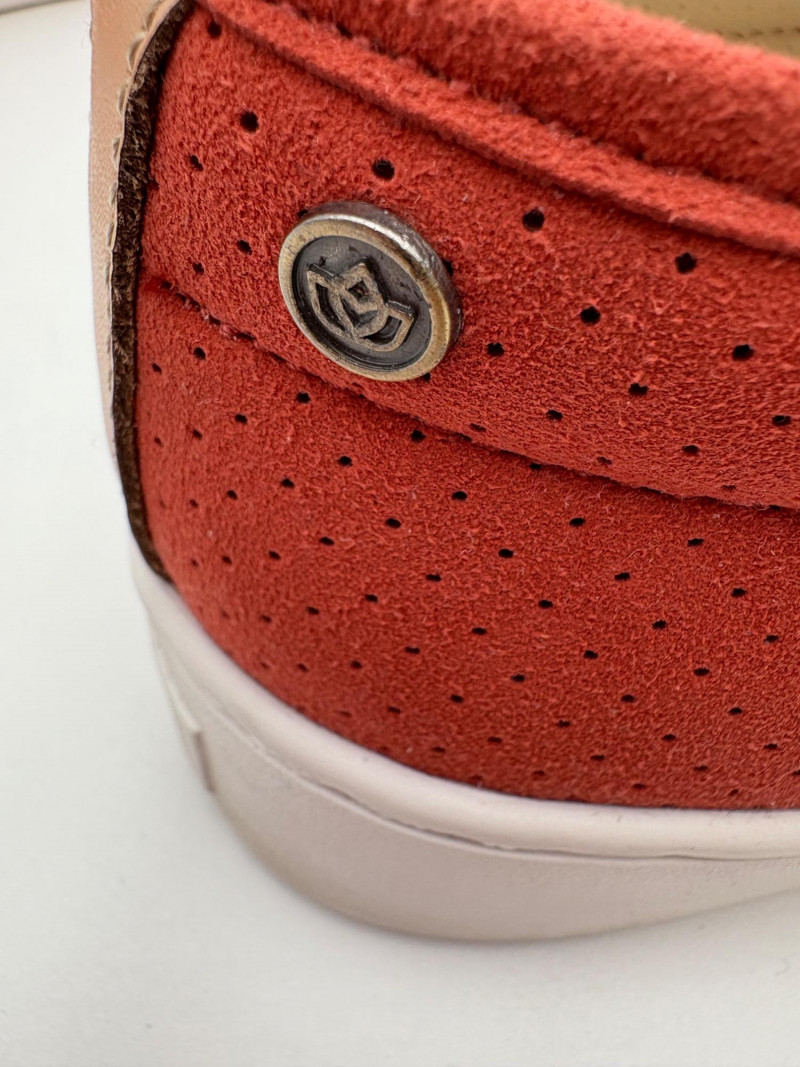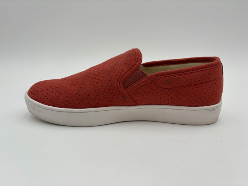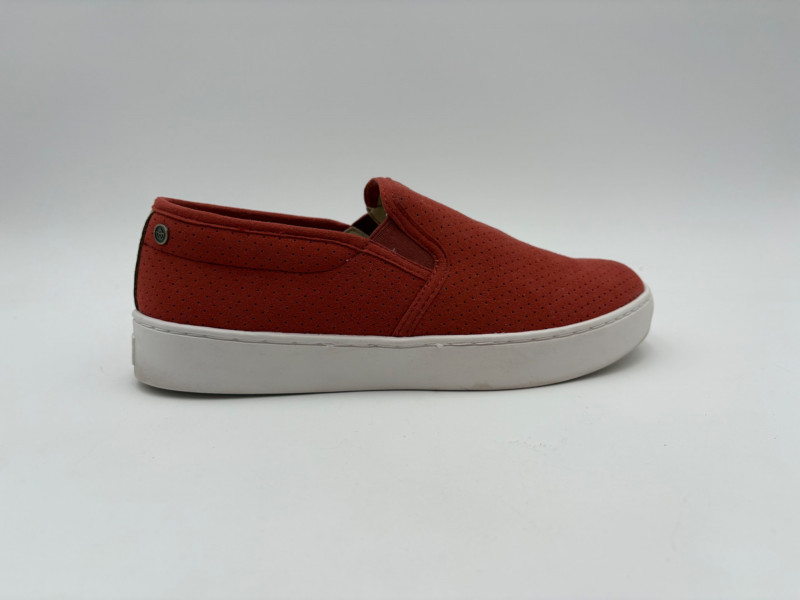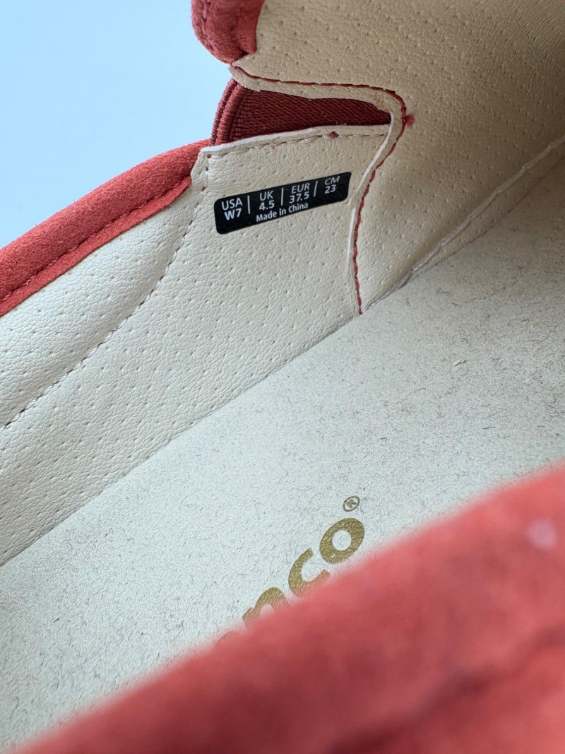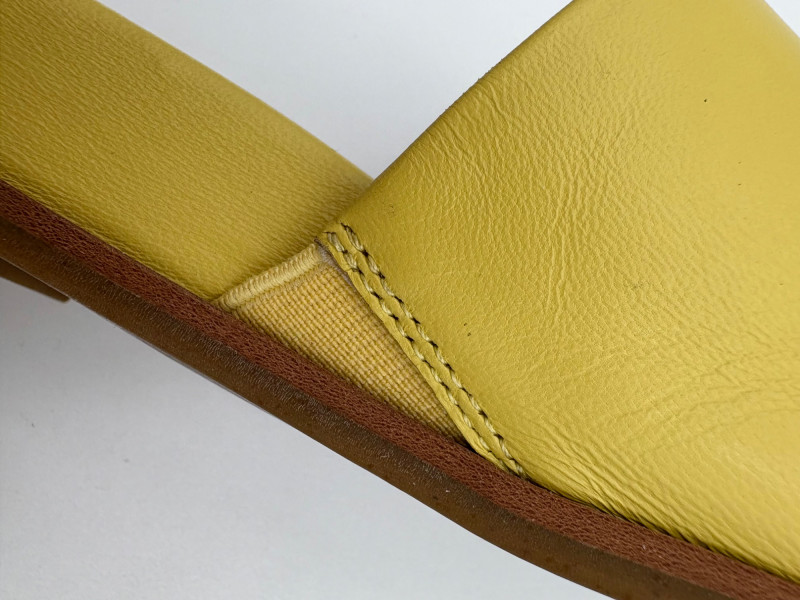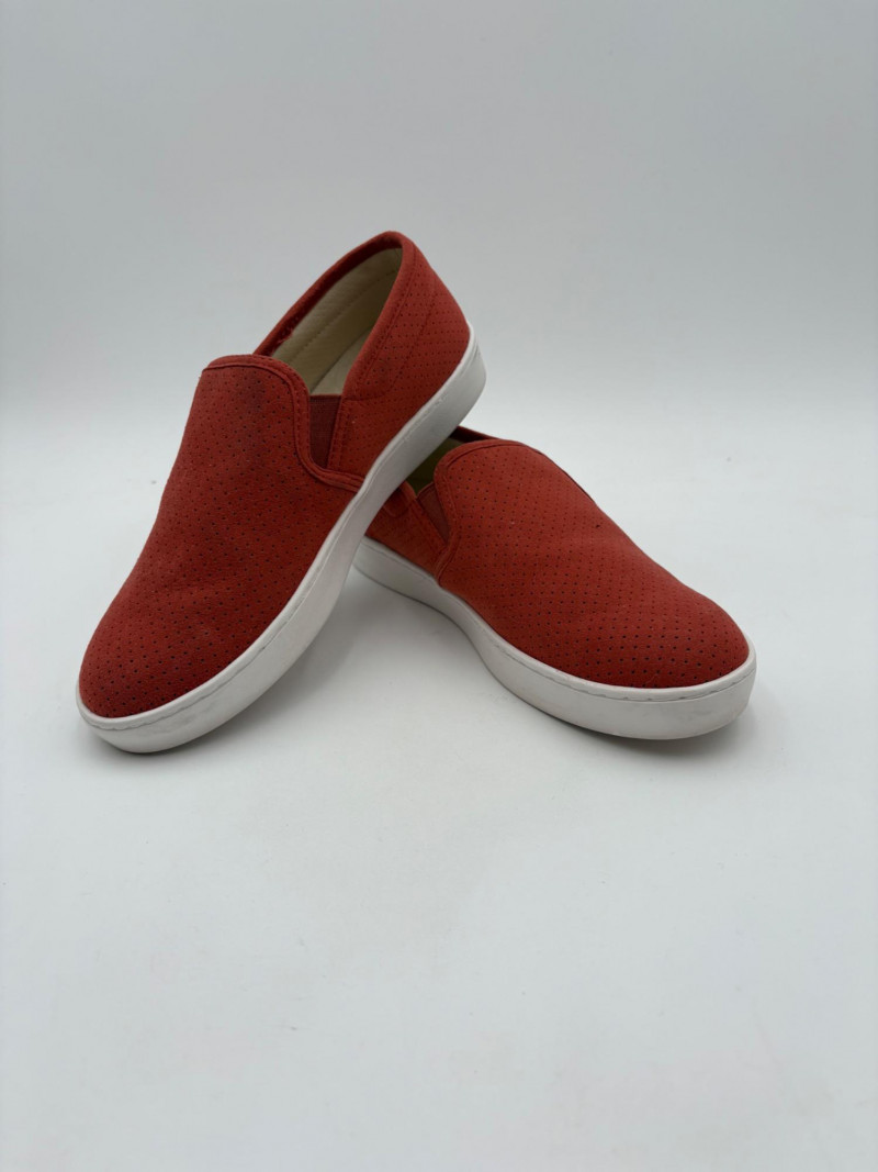 Great yellow leather slides with wide band over the foot and molded footbed with a non-slip rubber sole. In excellent condition - they don't show any signs of being worn other than to try on, Size 7. Orange perforated faux leather casual "boat" style shoes from Spenco. Thick white rubber sole, elasticated gussets between tongue and sides, and a heavily padded insole. In very good condition - very little wear on either the soles or the uppers. Size 7.