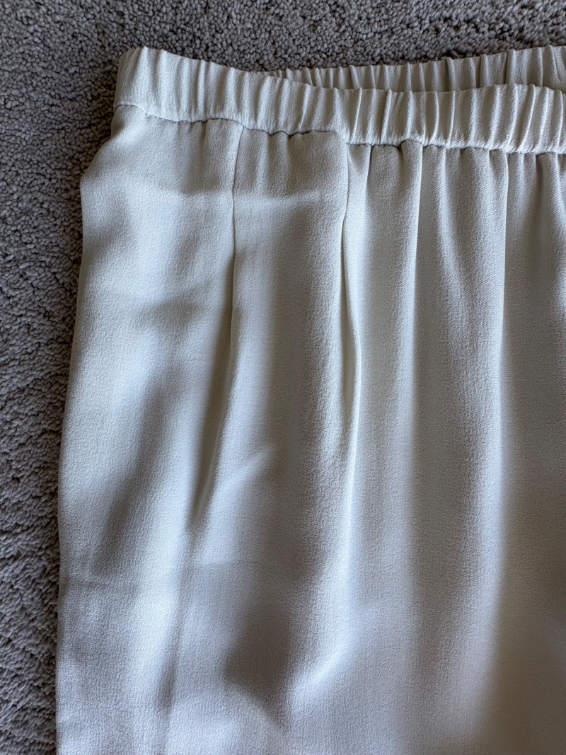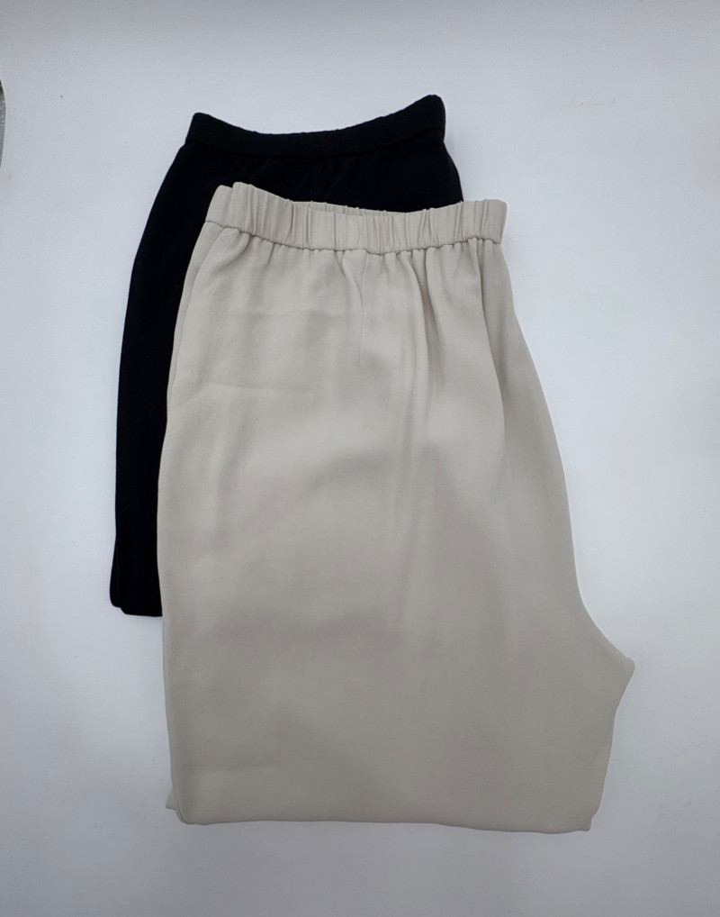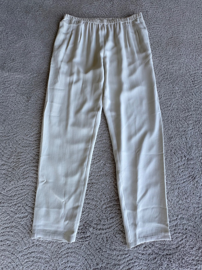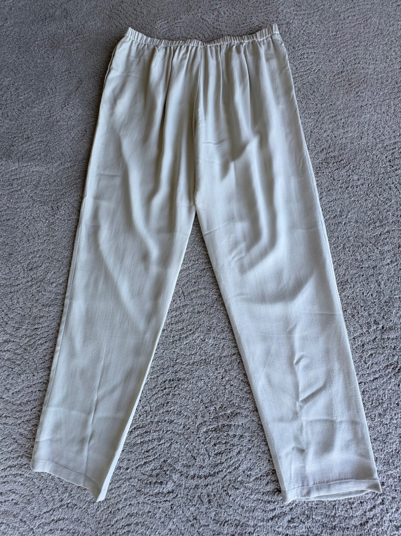 2 pairs of beautiful pants from Eileen Fisher in contrasting style for a variety of outfits in excellent condition. Ivory pair are fully lined and have beautiful beautiful fall. Elastic waistband and in-seam side pockets with slightly tapered leg. 100% silk pants with 100% silk lining. 17" side to side at waist with a 30.5" inseam. Size tag says L/G.