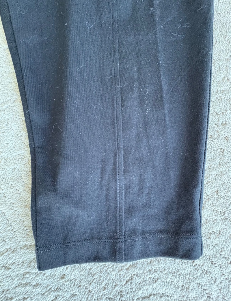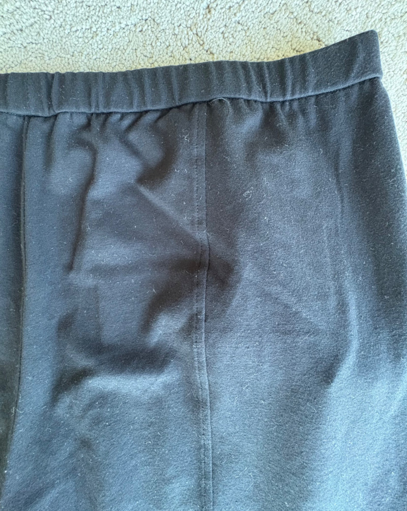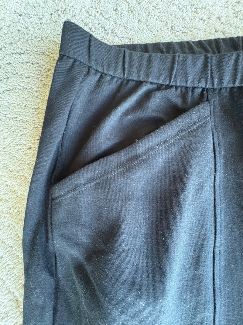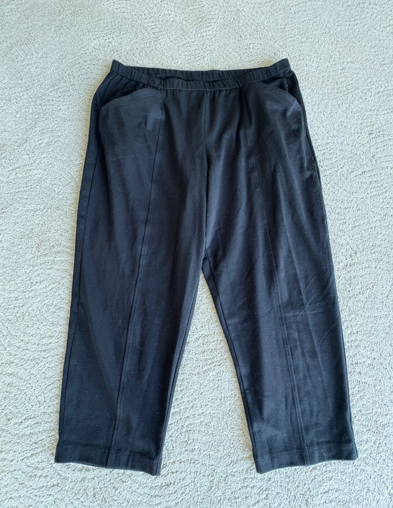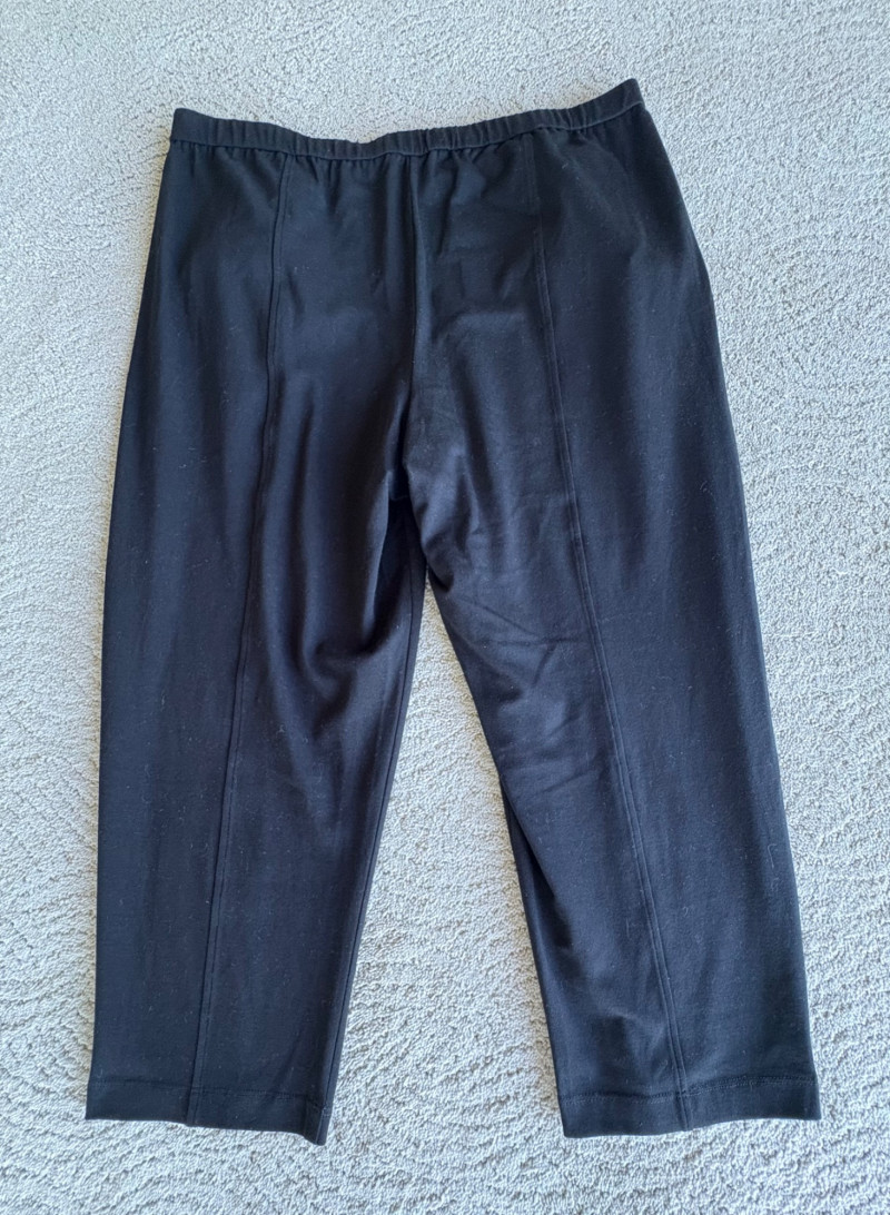 Black smooth knit pair has narrow elasticated waistband, multiple panel legs, angled side front pockets, and top stitching. 17.5" side to side at waist with 23" inseam. 90% organic cotton with 10% spandex - very smooth and silky to the touch. Size tag says L/G.