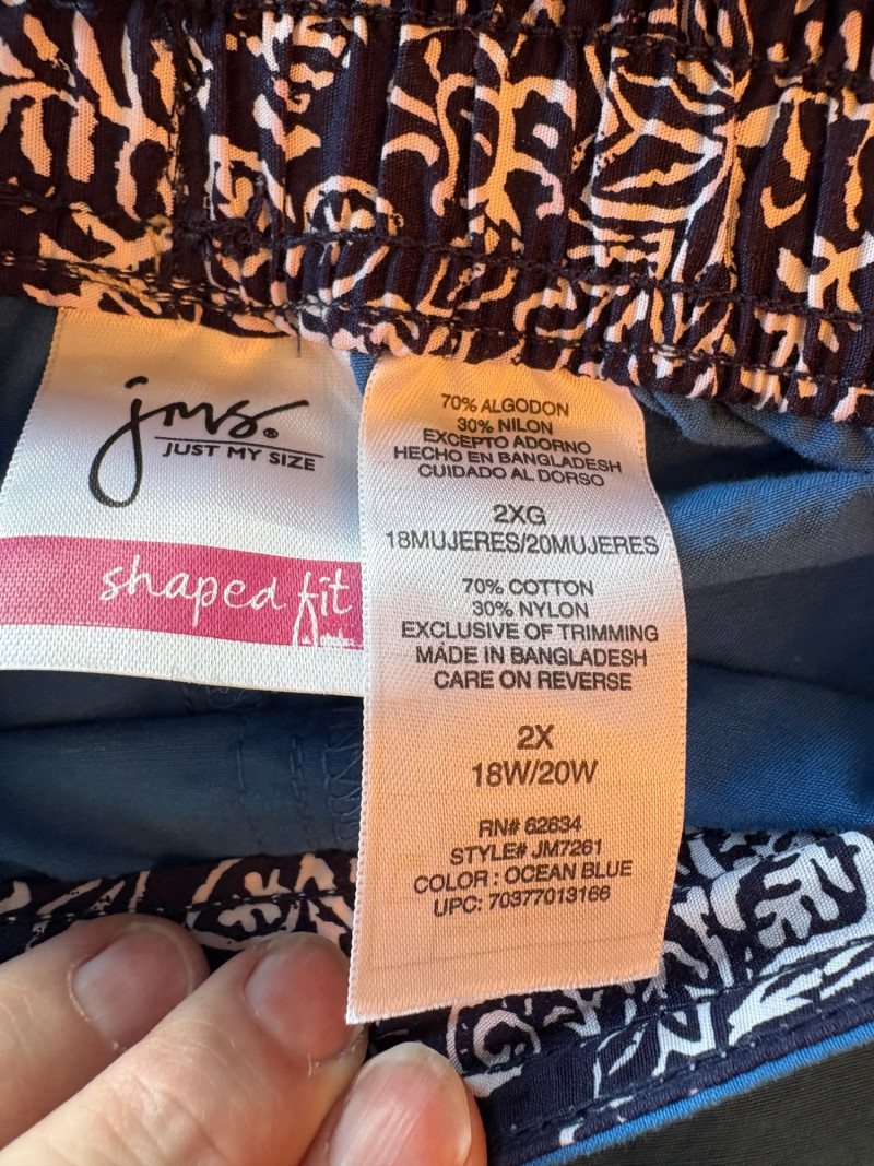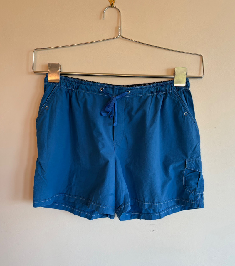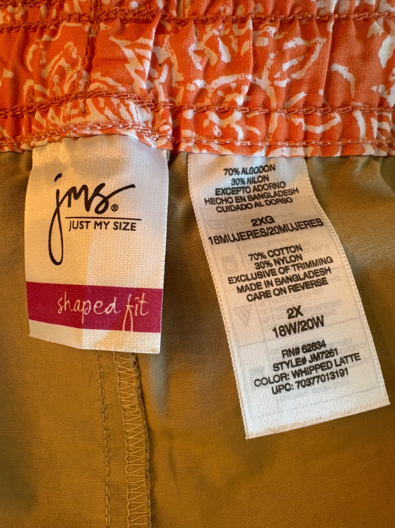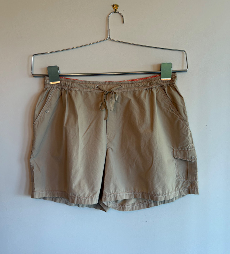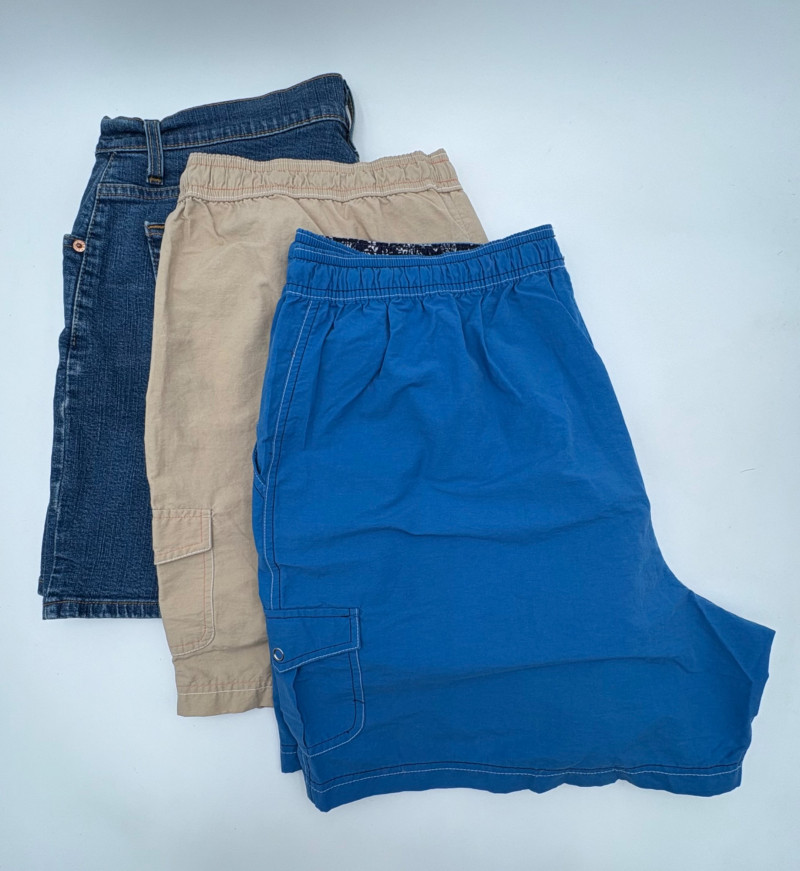 Three pairs of shorts for casual wear from JMS & Levi's. Levi's shorts have traditional 5-pocket styling, zip fly front, and Levi's back tag. In excellent condition (we think they have a purposedly distressed finish). 97% cotton with 3% spandex. Measure 18" side to side at waist with 6.5" inseam. Size tag says 16. 2 pairs of identical JMS shorts in blue and khaki. Both have elasticated waistband with drawstring, faux fly, set-in side pockets, and left leg cargo pocket. 70% cotton with 30% nylon. Both are in excellent condition and measure 18.5" side to side at waist with 5.5" inseam. Size tags say 2X.