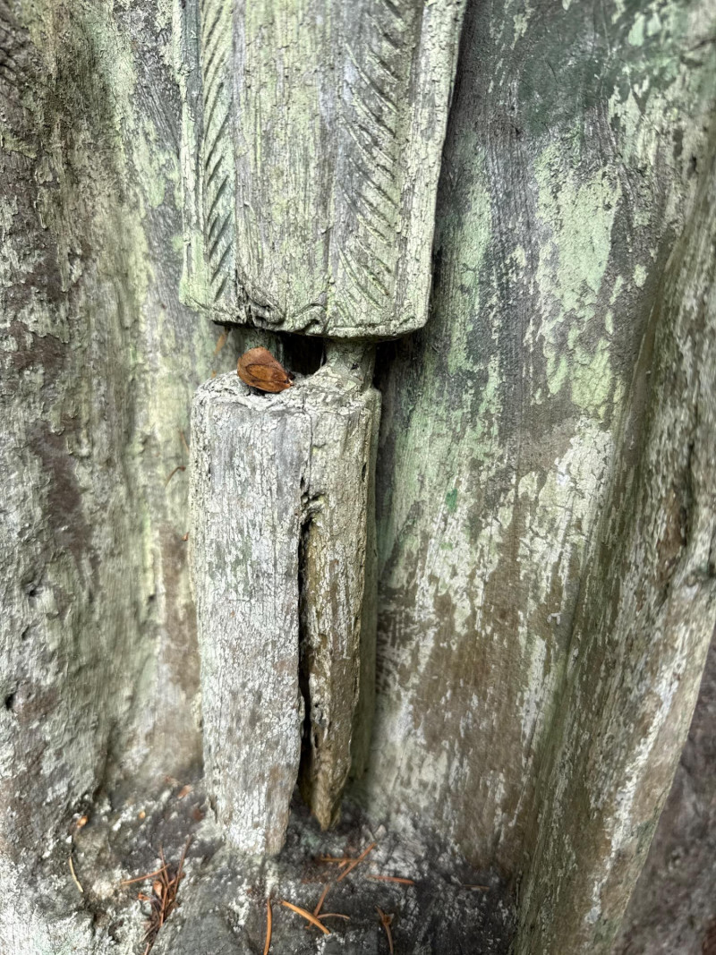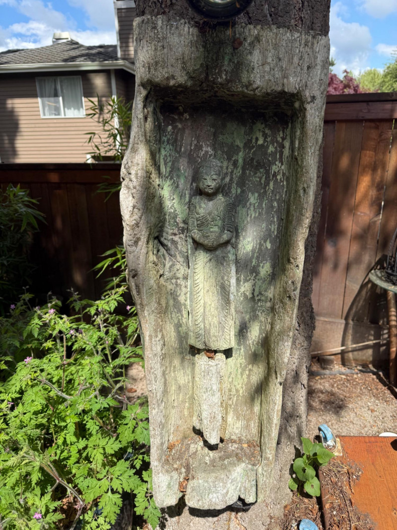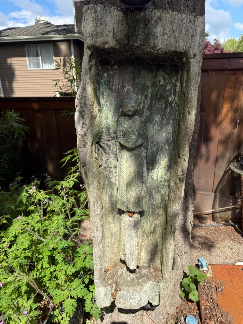 Hand carved wood statue. Dimensions are 34in tall, 11in wide, 6in deep