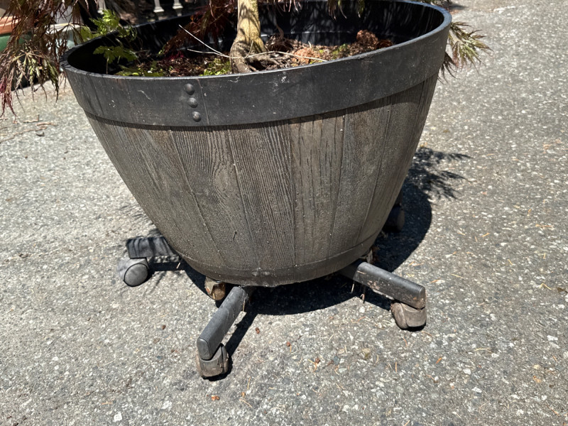 **Note: Plant dimensions are approximate. Plant health is not guaranteed but are being maintained. Plastic/Resin pot dimensions are 20in tall, 25in wide. Wheels are not original. Plant dimensions from soil to tip are: 22in tall, 42in wide. Heavy, with easy load location. Bring support to help load.