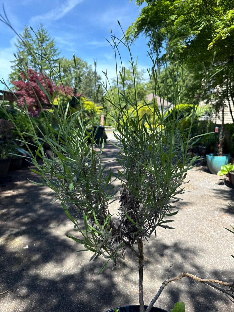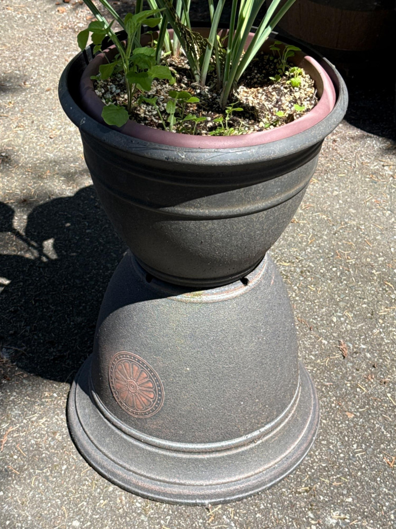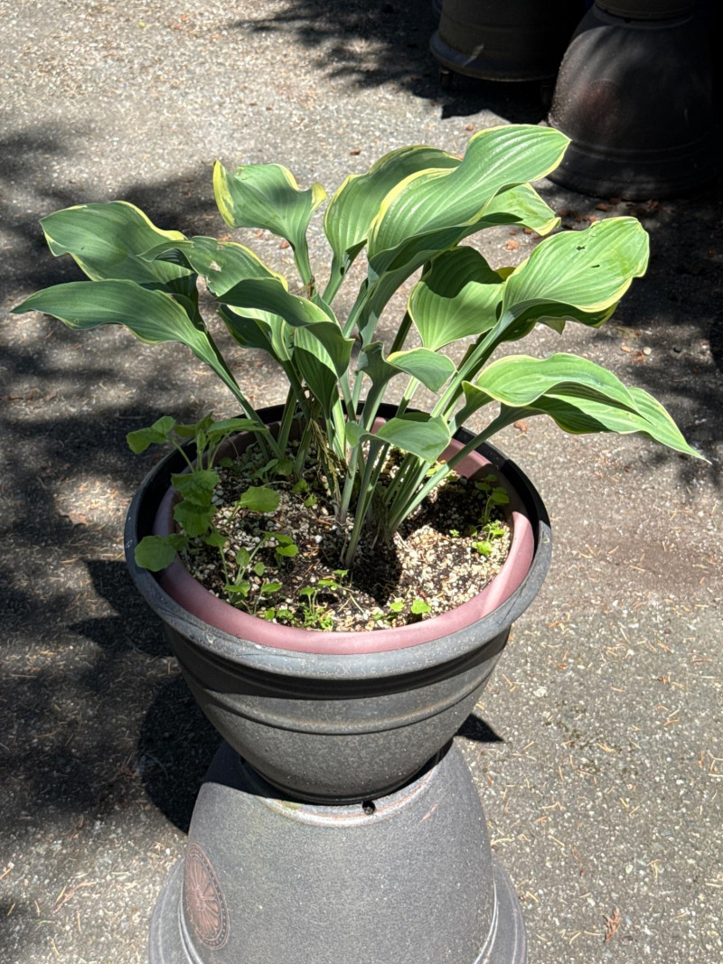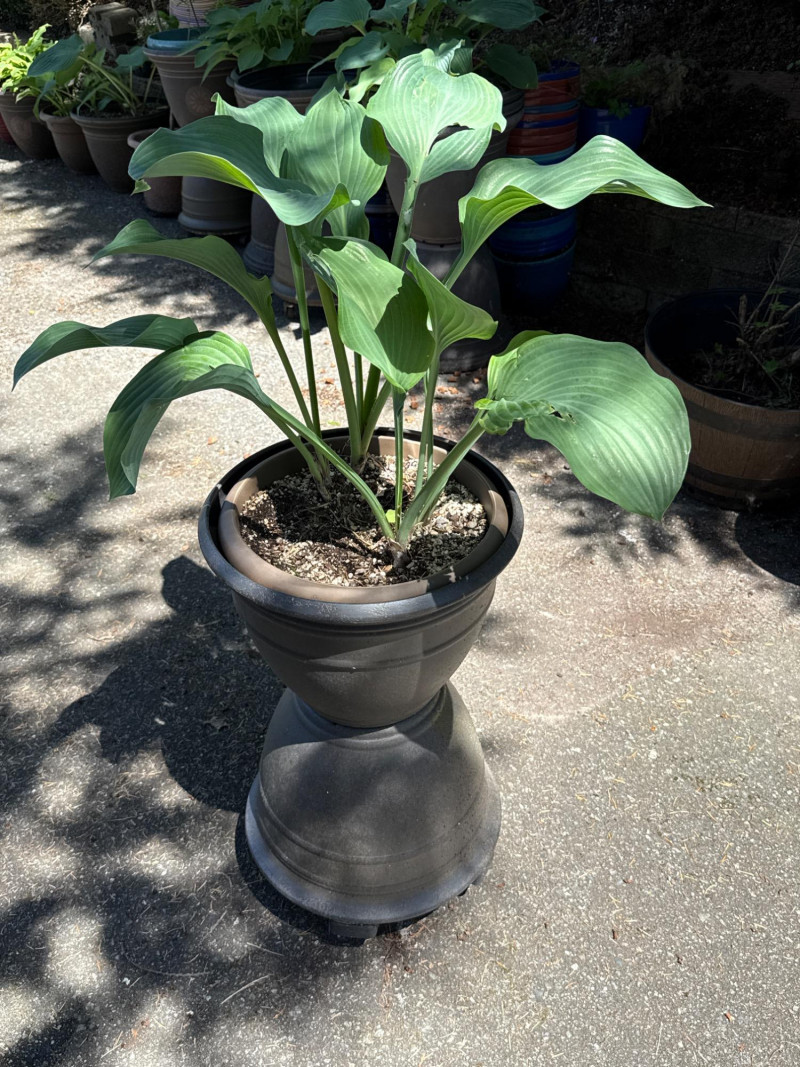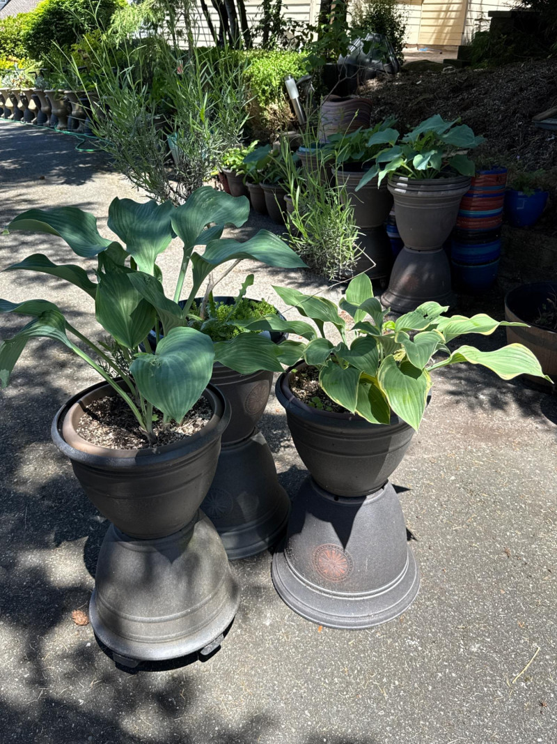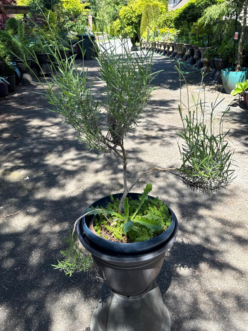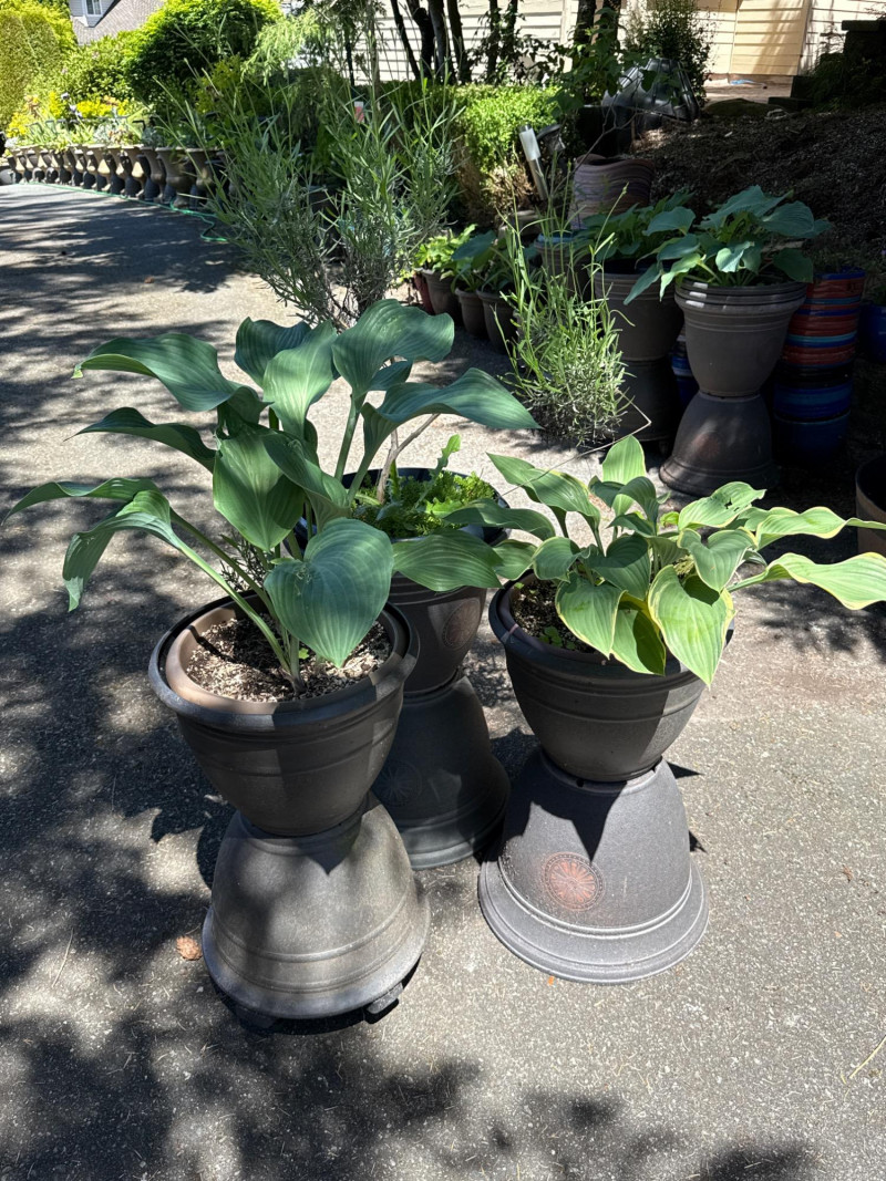 **Note: Plant dimensions are approximate. Plant health is not guaranteed but are being maintained. Plastic/Resin pot dimensions are 25in tall, 14in wide Lavendar Plant dimensions from soil to tip are: 33in tall, 27in wide. Easy load location. Plastic pots are attached in the middle. One with wheels Variegated Hosta.