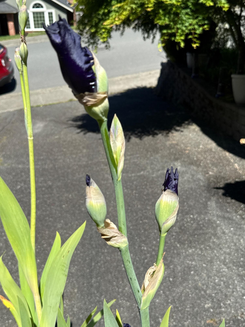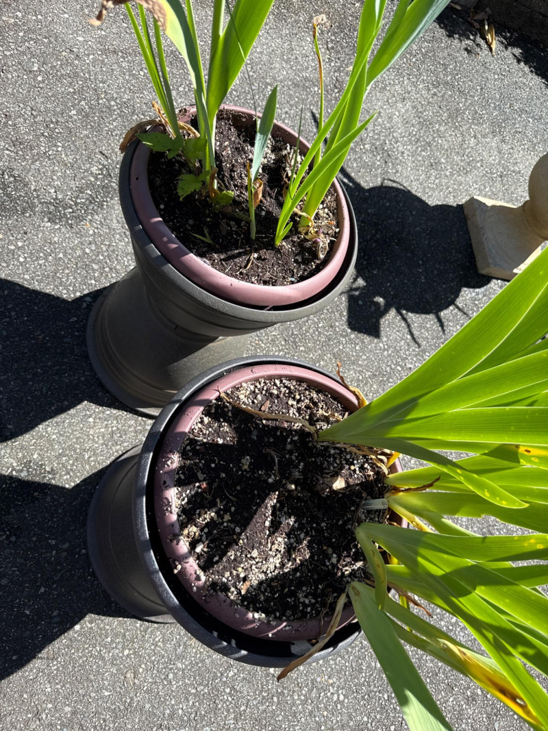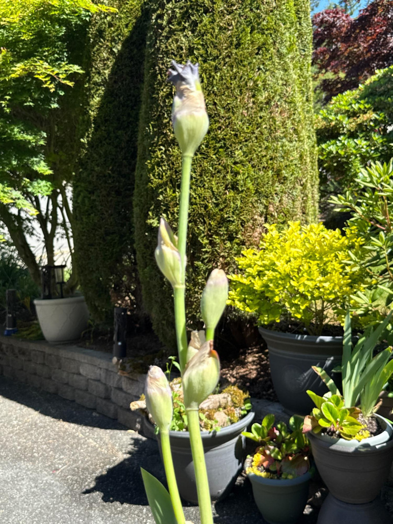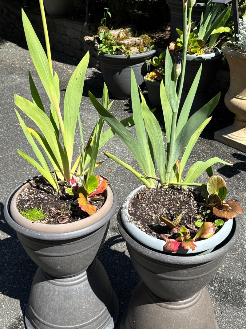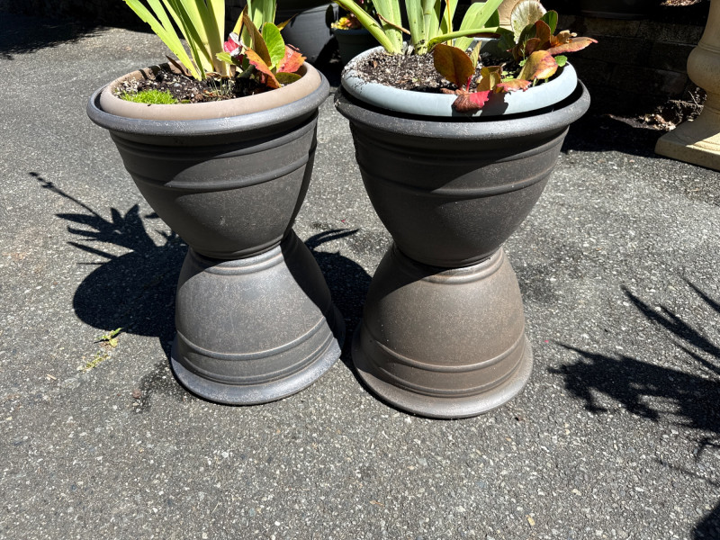 **Note: Plant dimensions are approximate. Plant health is not guaranteed but are being maintained. Plastic/Resin pot dimensions are: Stacked pot is 22in tall, 14in wide. 3 varieties of Iris and small kalanchoe plants
