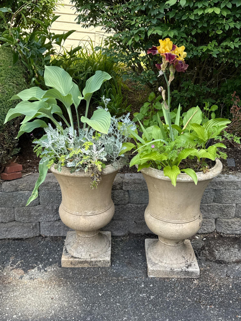 Lot # 53 - Hosta, Red and Gold Iris and Dusty Miller Plants in Pedestal Pots