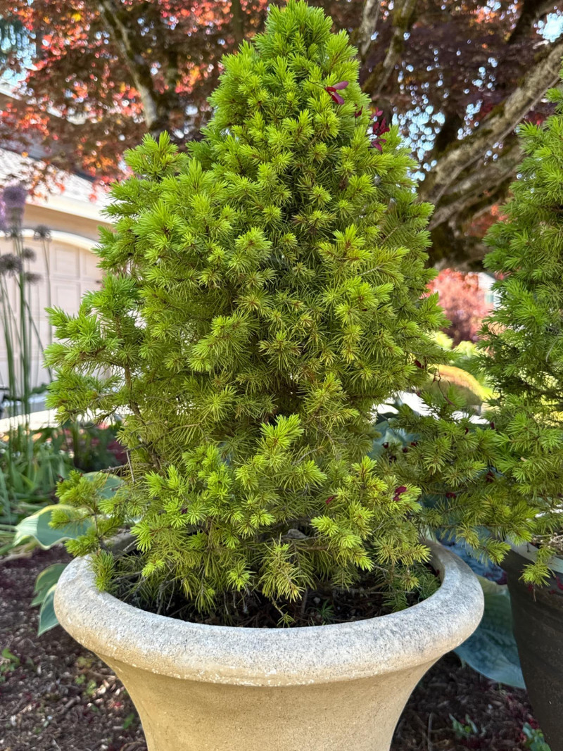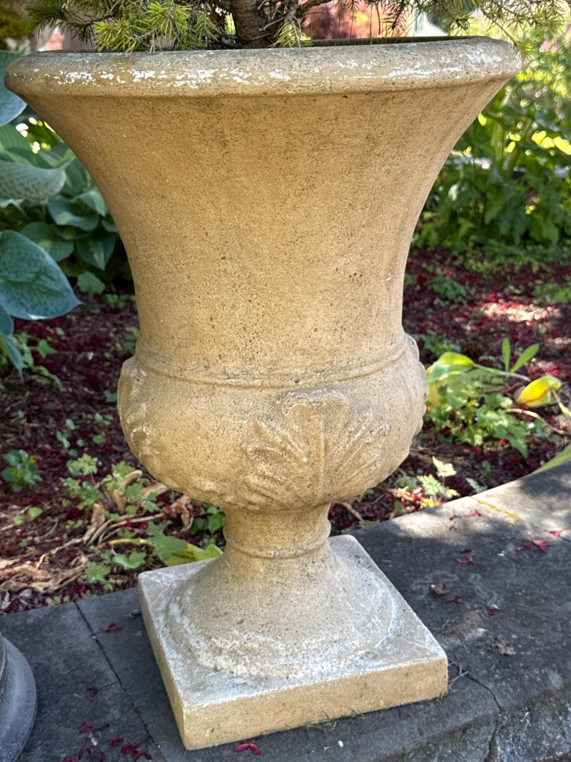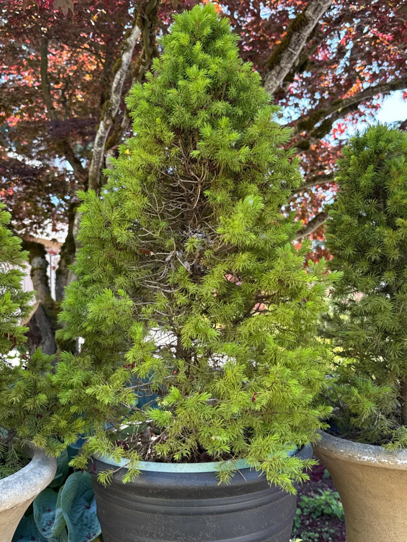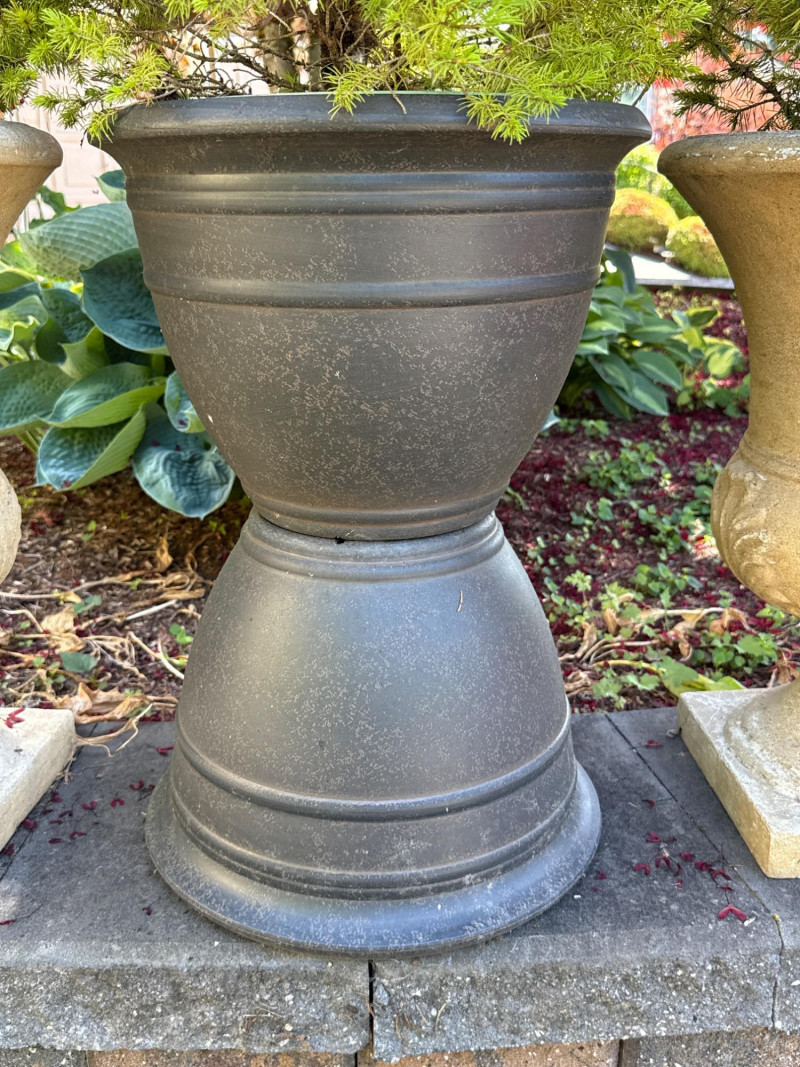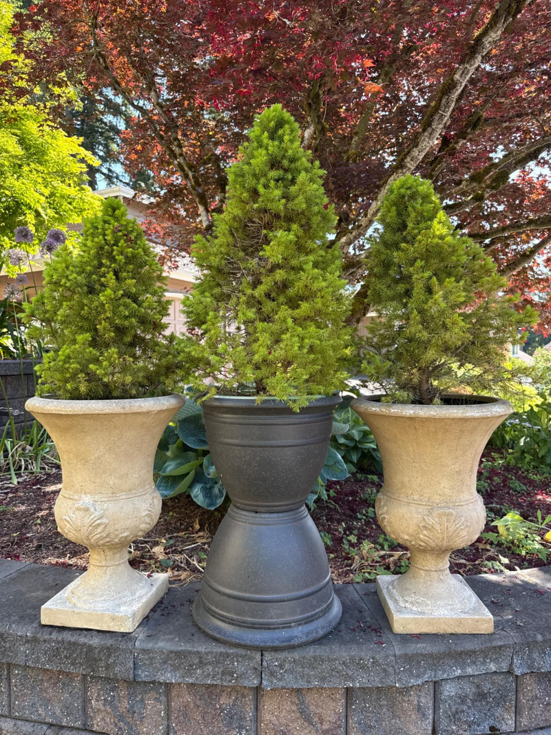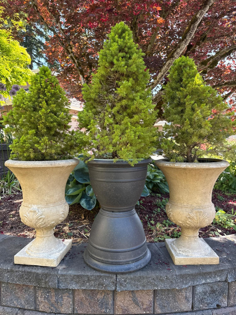 Lot # 66 - Three Pedestal Pots with Dwarf Alberta Spruce Trees