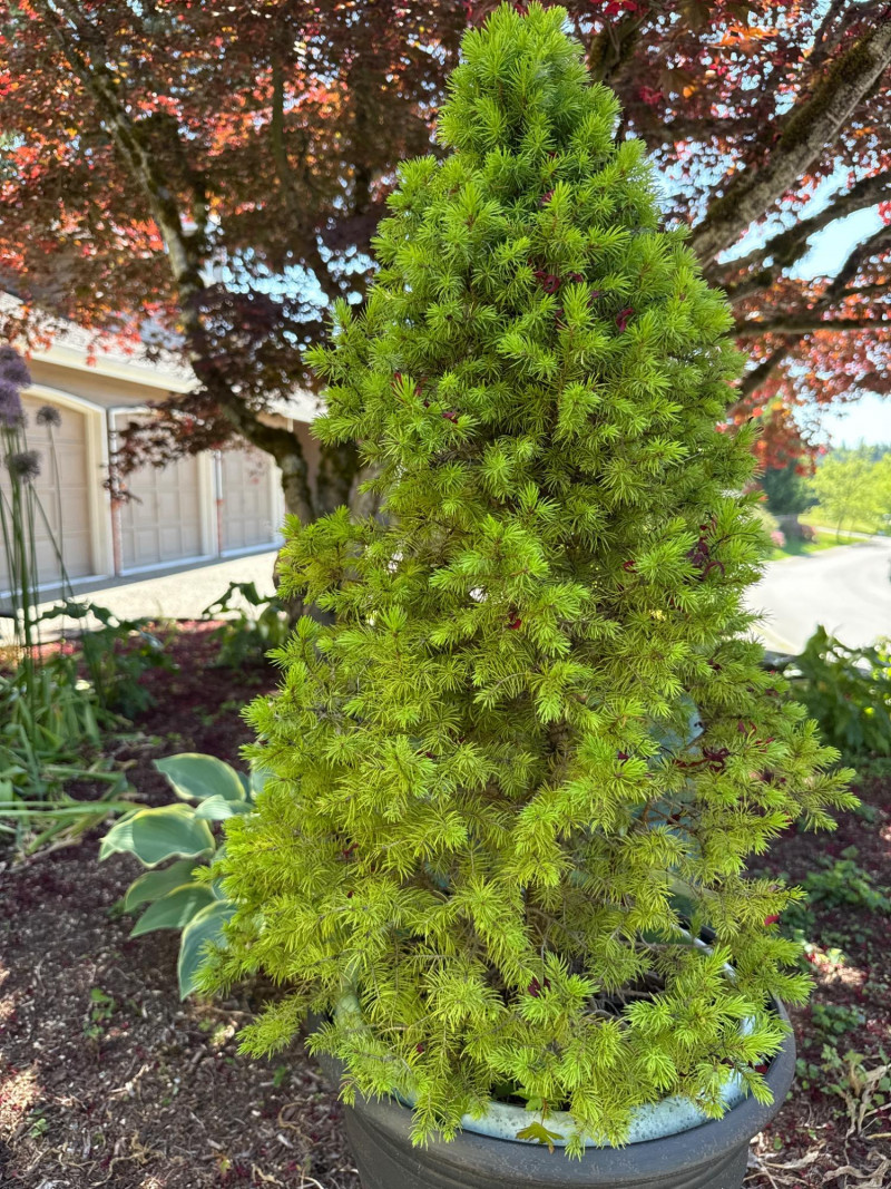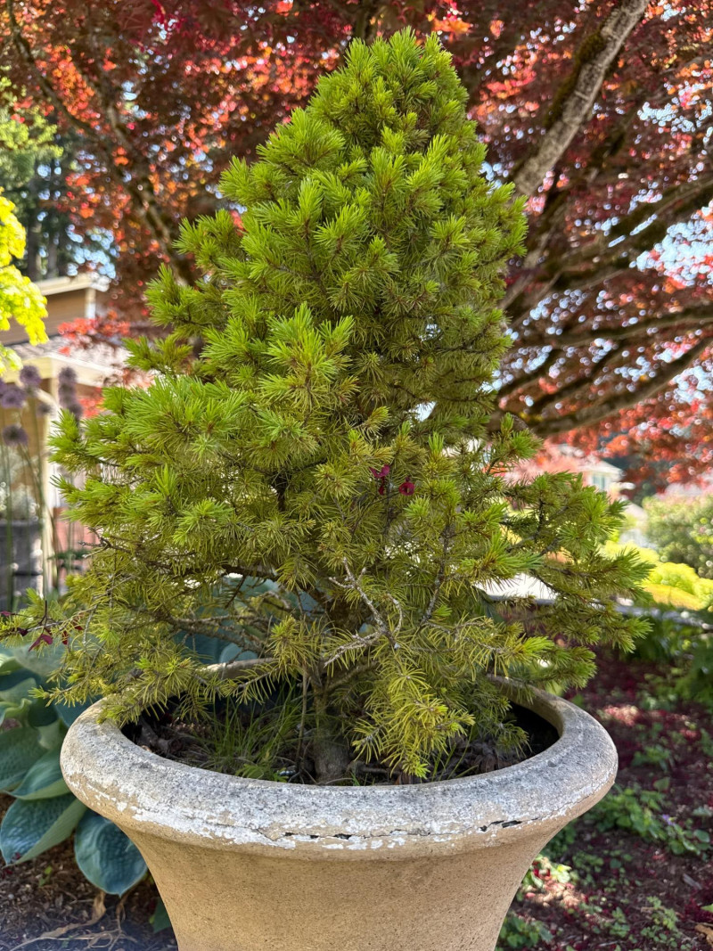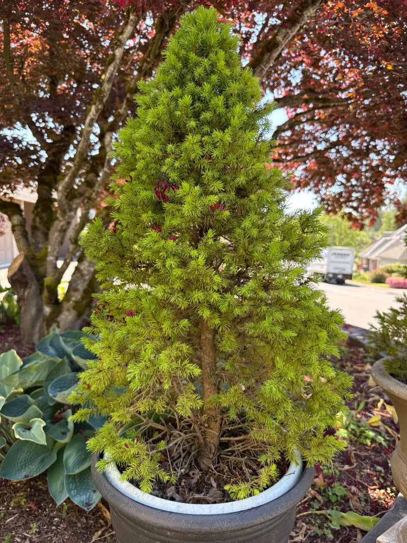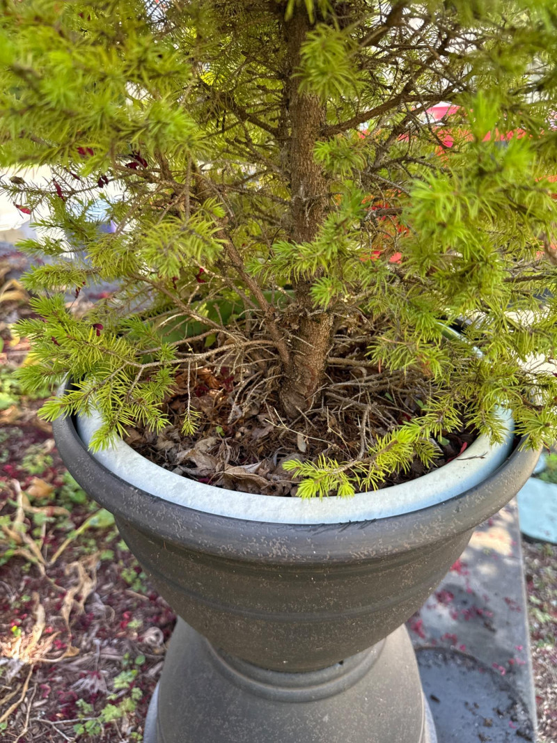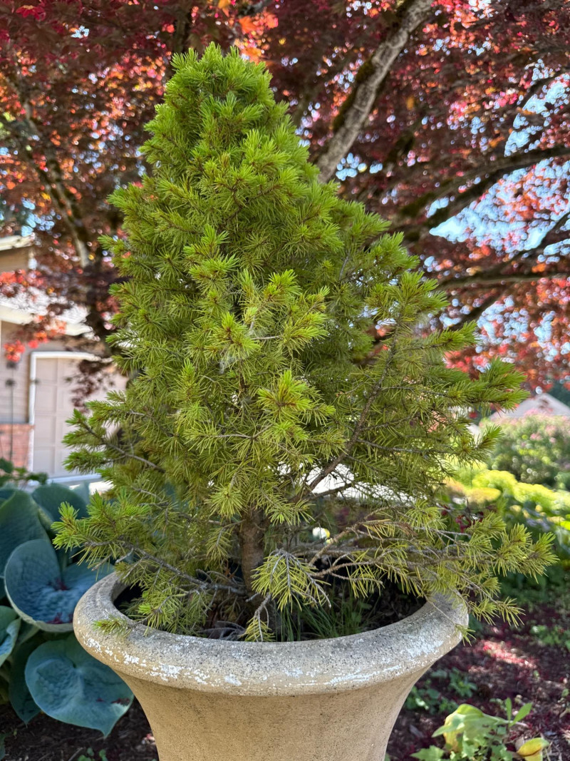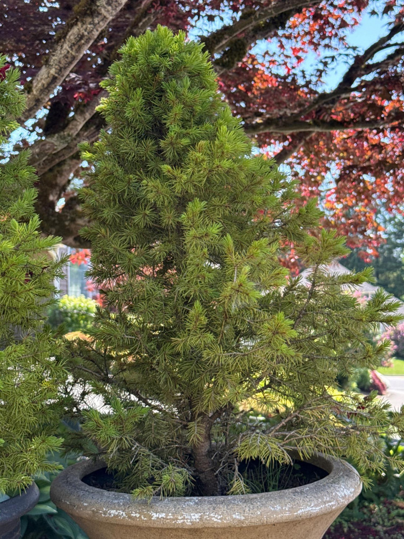 Lot # 66 - Three Pedestal Pots with Dwarf Alberta Spruce Trees