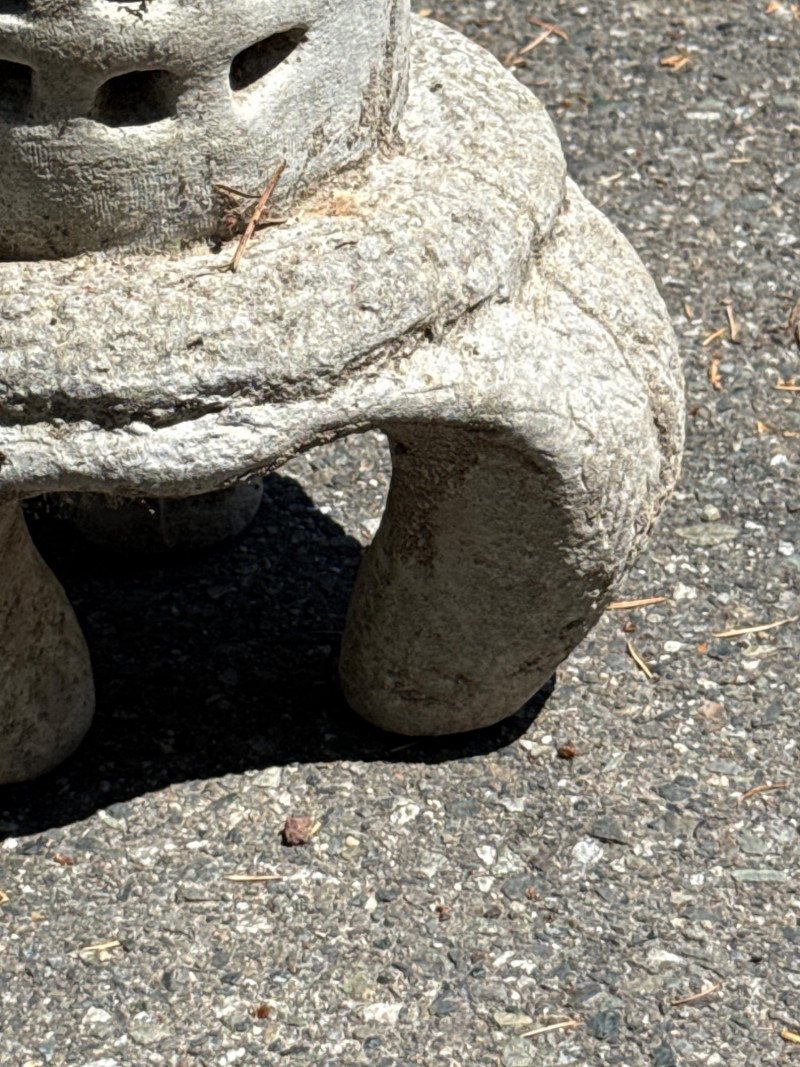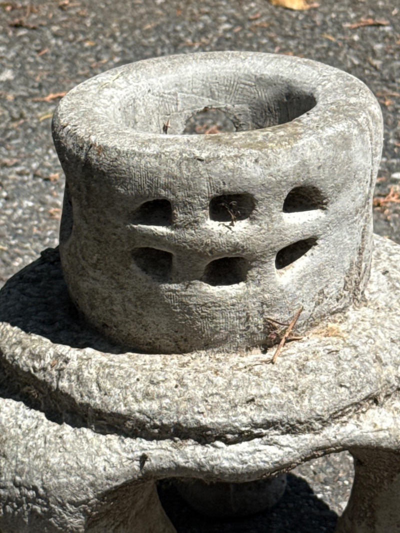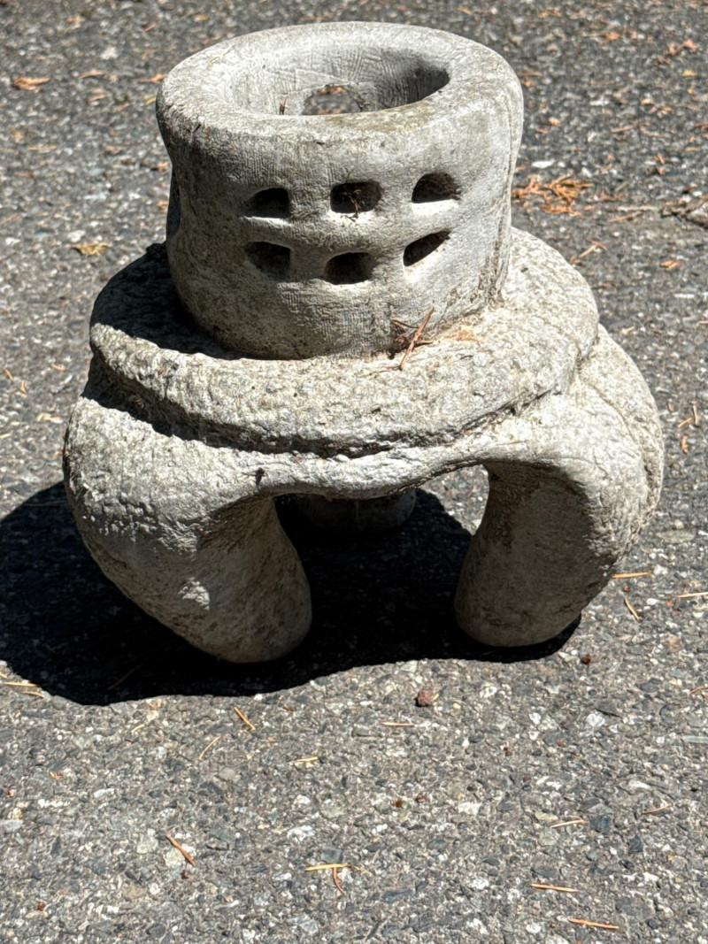 Heavy, cement pagoda style planter. Dimensions are 11in wide, 11in tall Multiple holes around crown. Possibly for orchids or incense in great condition
