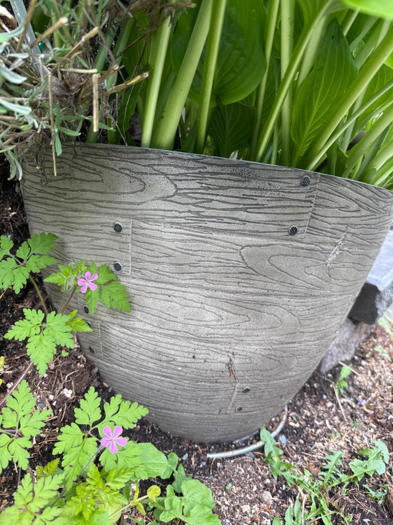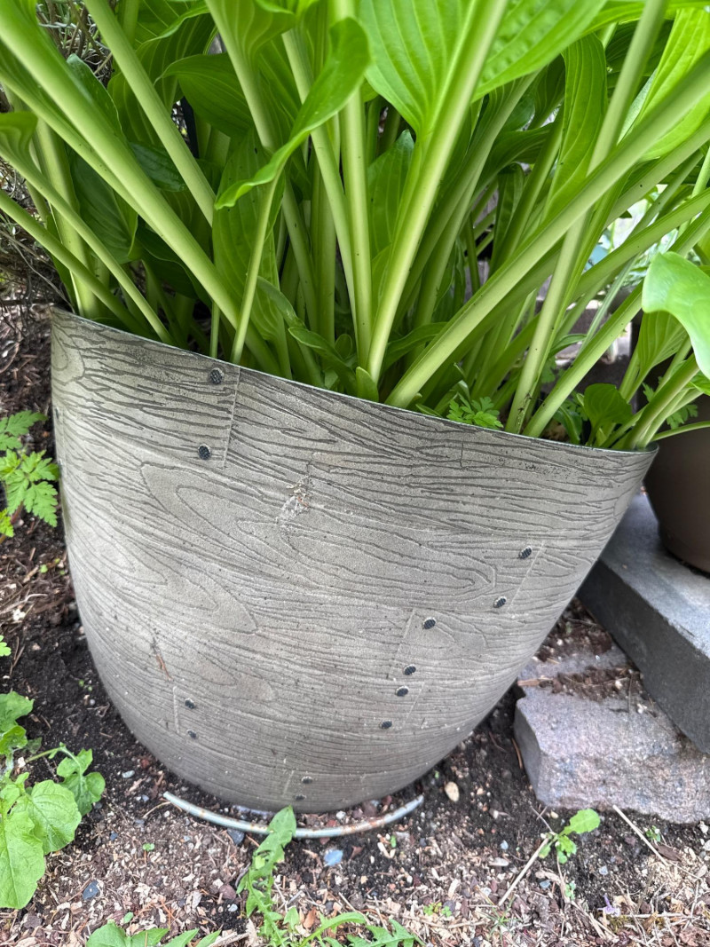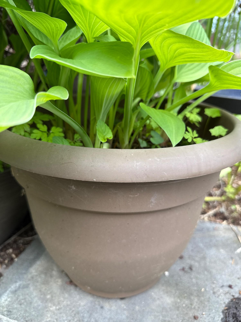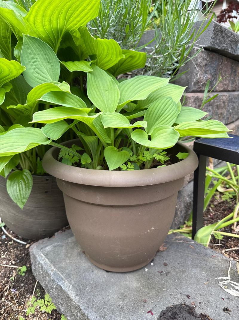 **Note: Plant dimensions are approximate. Plant health is not guaranteed but are being maintained. Plastic/Resin pot dimensions are 17in tall, 17in wide. 11in tall, 11in wide Plant dimensions from soil to tip are: Varies Heavy, with easy load location. Bring support to help load. Hosta, Lavendar, Creeping Jenny plants. Smaller pots do not all have plants