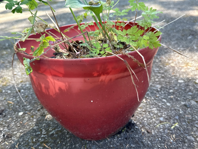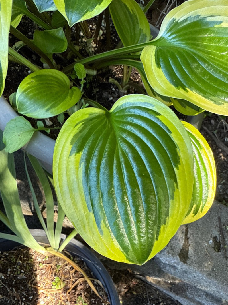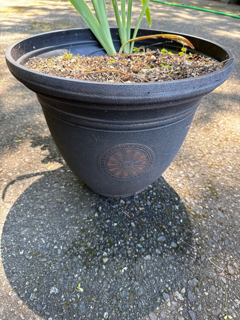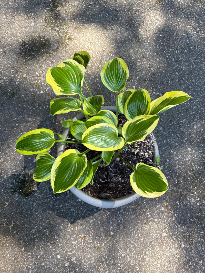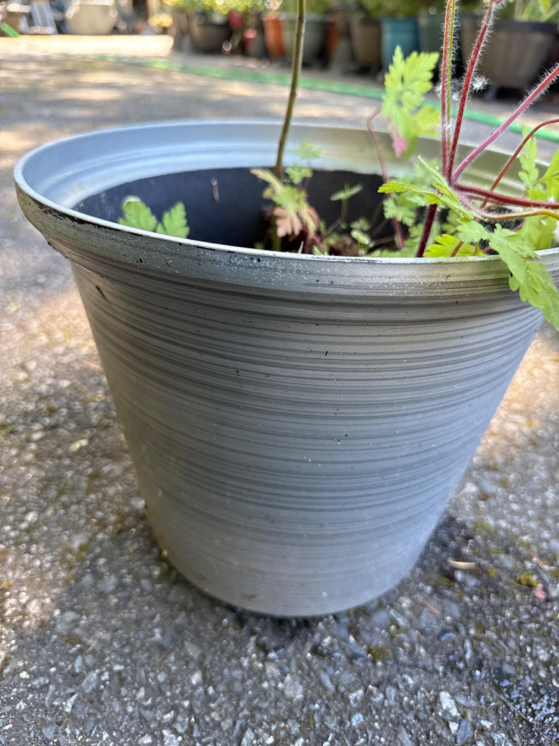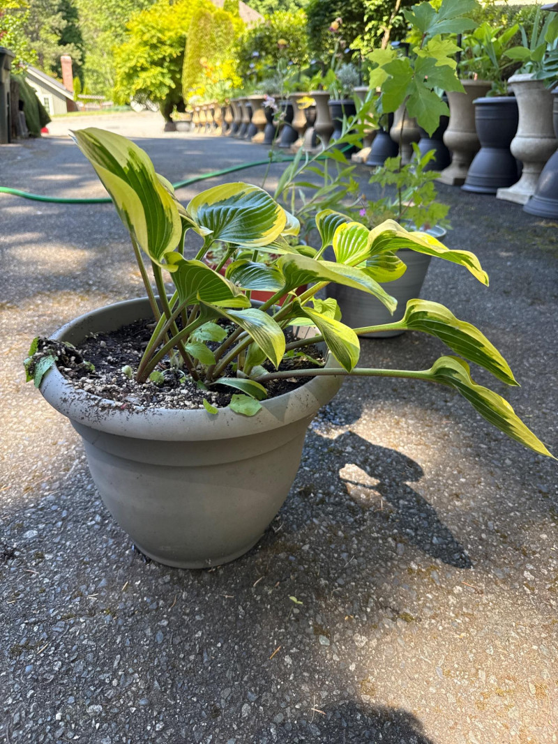**Note: Plant dimensions are approximate. Plant health is not guaranteed but are being maintained. Plastic/Resin pot dimensions are: Stacked pot is 22in tall, 14in wide Hosta, Big Leaf Maple, Krossa Regal Plantain Lilly, Columbine, Gold and Red Iris