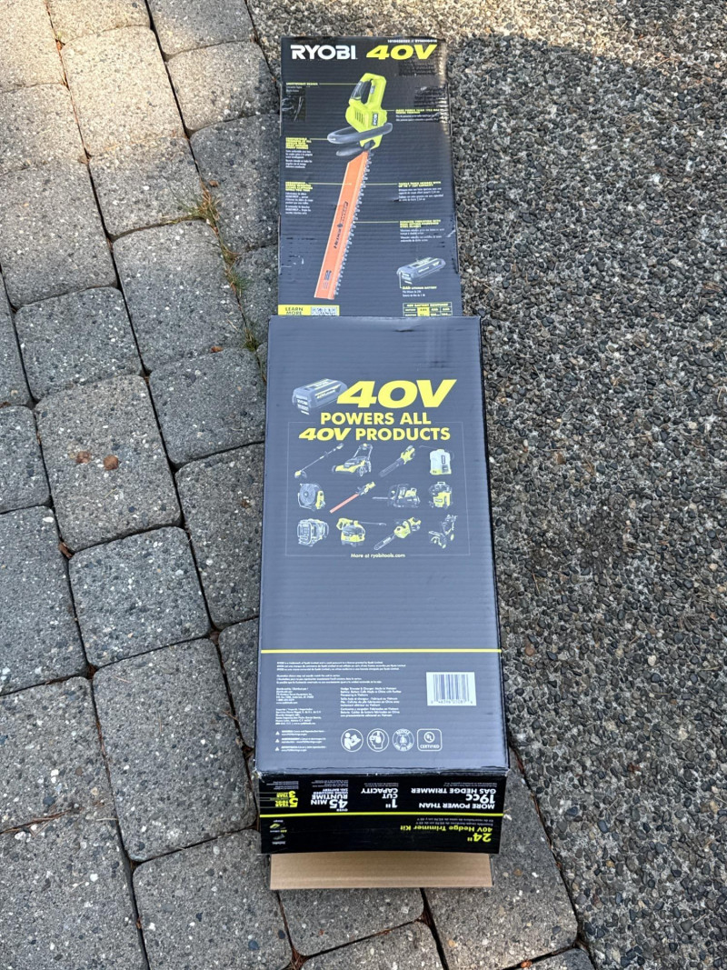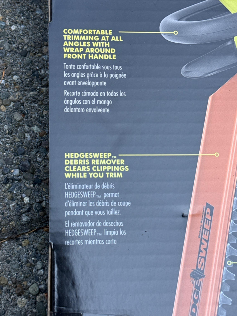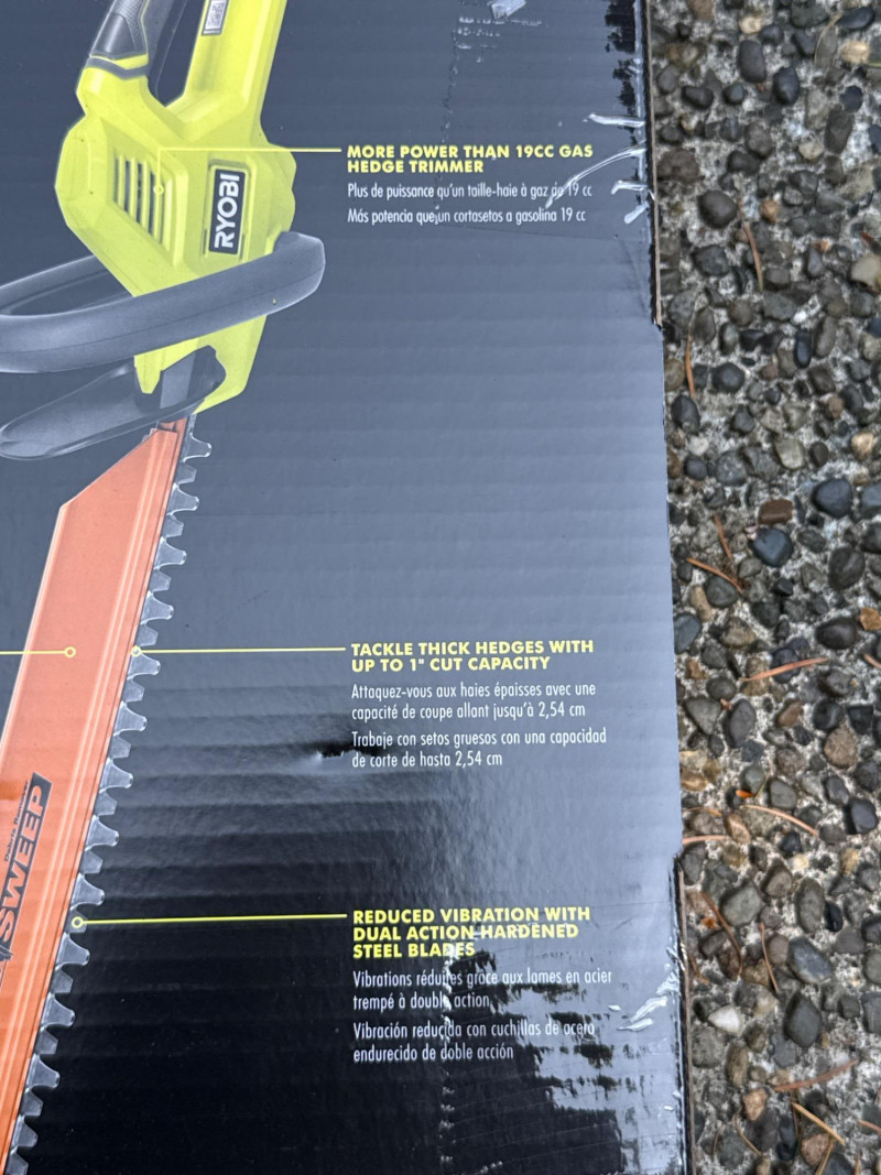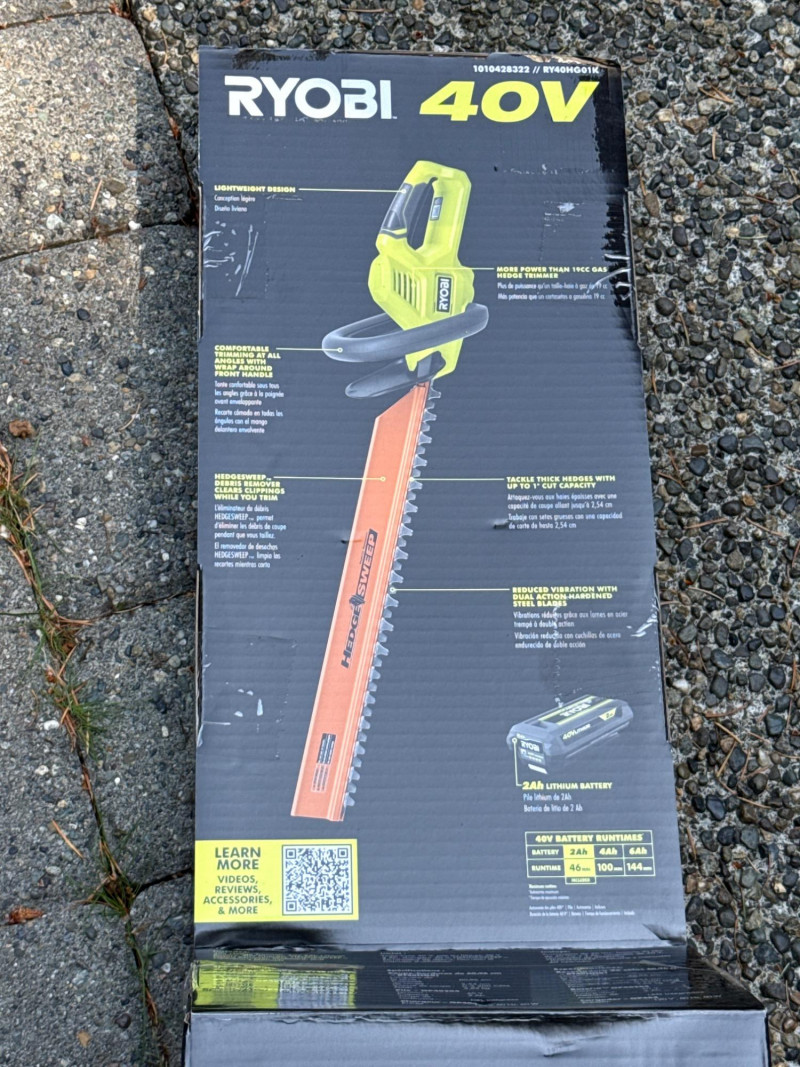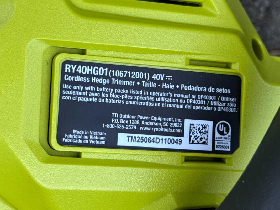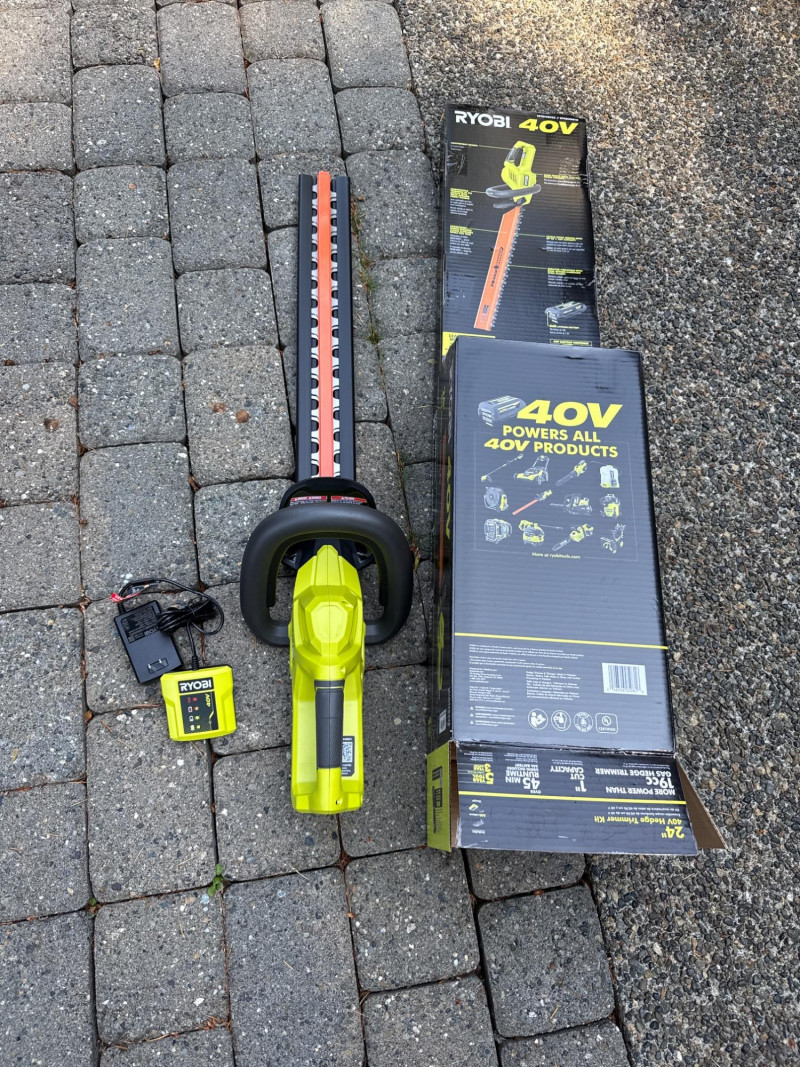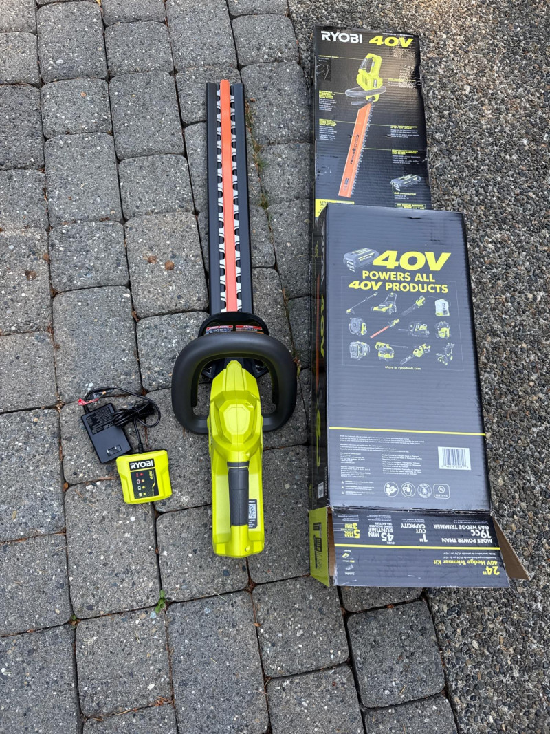 NIB Ryobi battery operated hedge trimmer. Battery has been removed. Charger, manual and guard included 40V battery capacity. Multiple features. Light weight Model RY40HG01 Never used