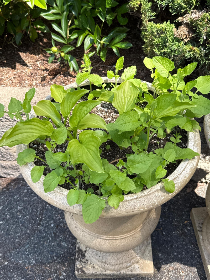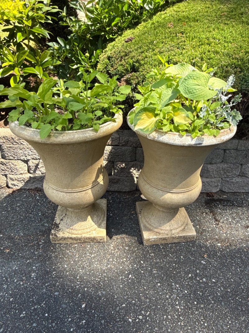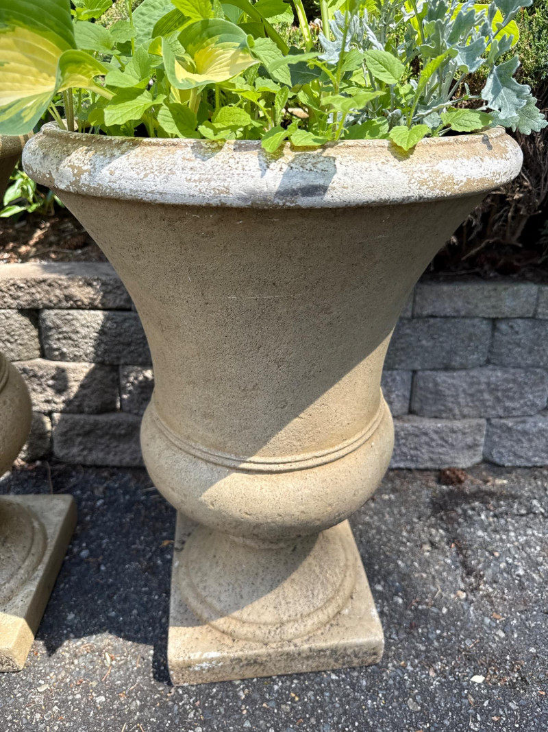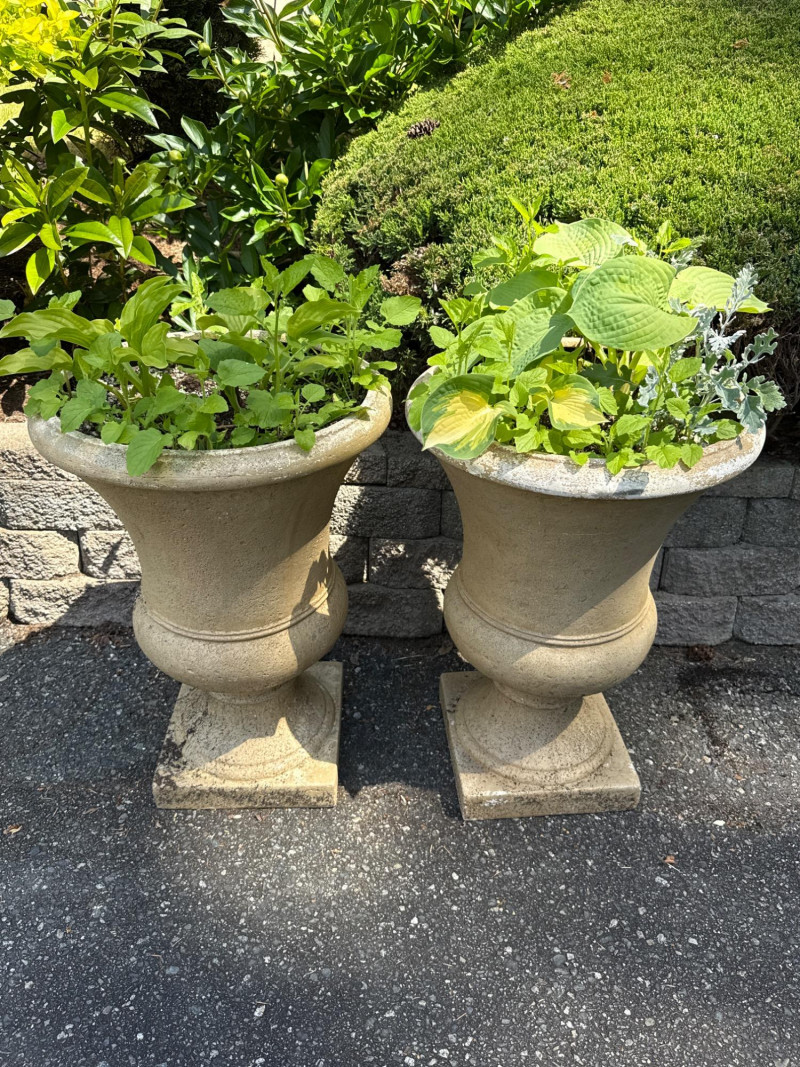 **Note: Plant dimensions are approximate. Plant health is not guaranteed but are being maintained Plastic/Resin pot dimensions are: 26in tall, 17in wide. Plant dimensions from soil to tip are: Varies Heavy, with easy load location. Bring support to help load. Hosta, Dusty Miller, Variegated Hosta