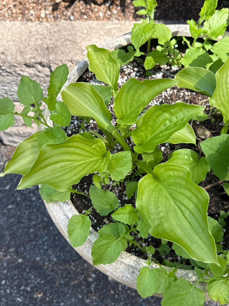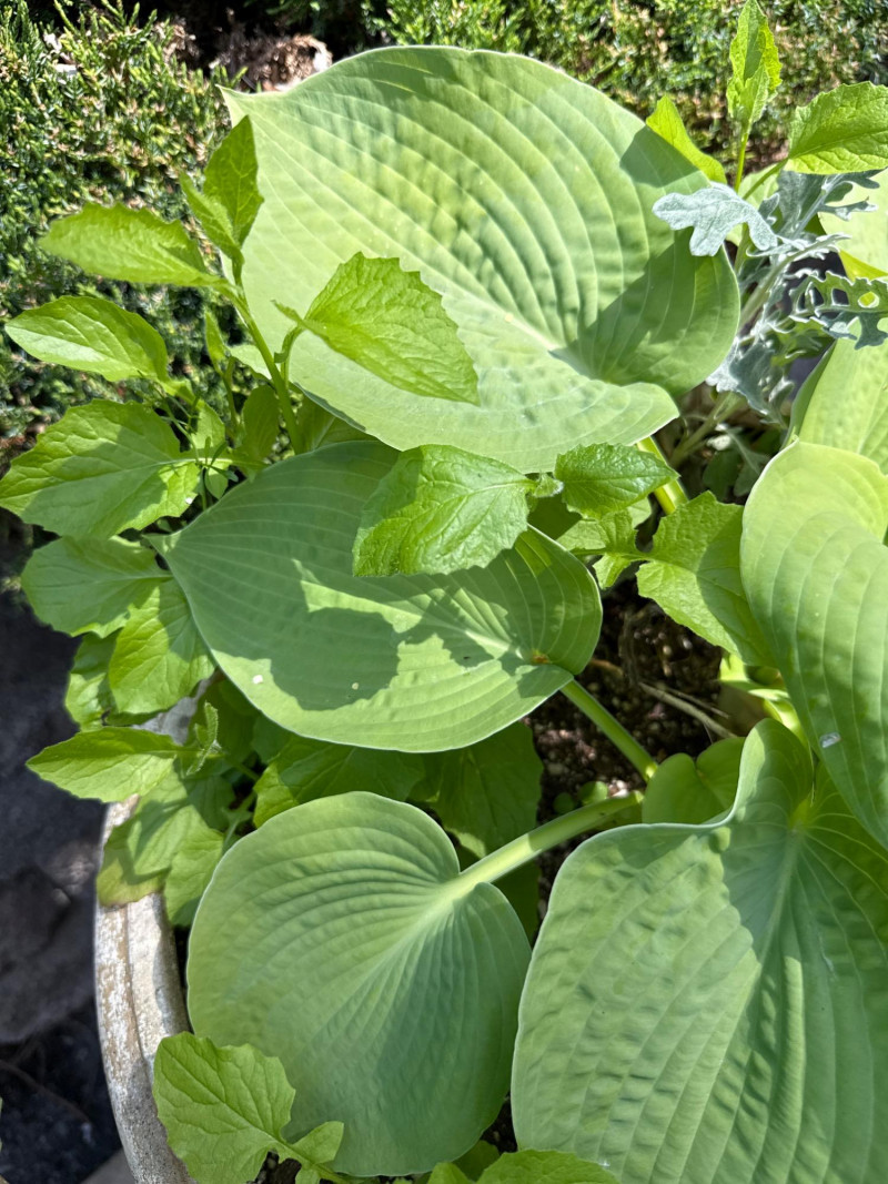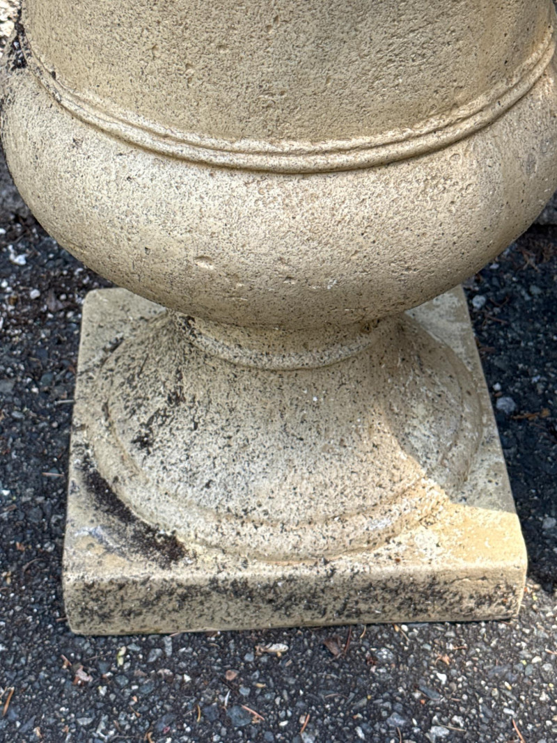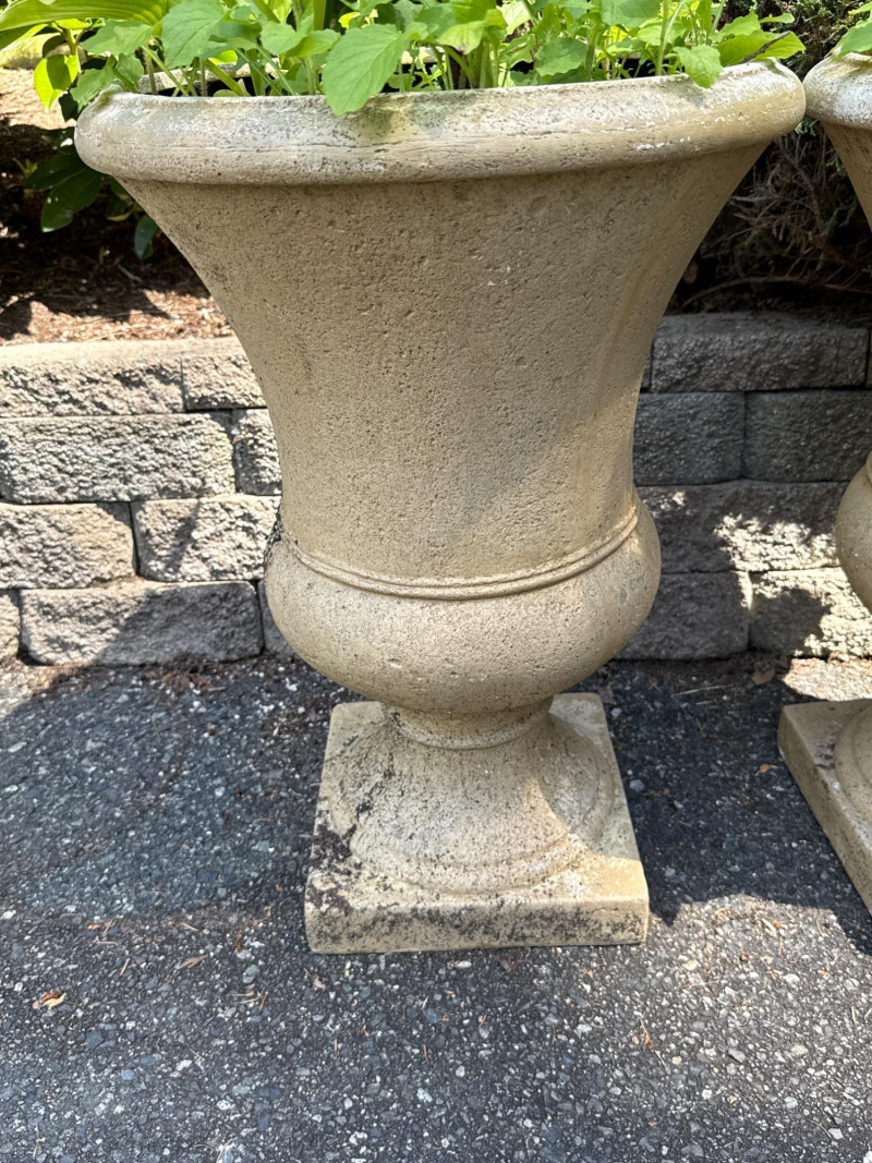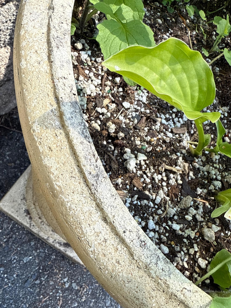 **Note: Plant dimensions are approximate. Plant health is not guaranteed but are being maintained Plastic/Resin pot dimensions are: 26in tall, 17in wide. Plant dimensions from soil to tip are: Varies Heavy, with easy load location. Bring support to help load. Hosta, Dusty Miller, Variegated Hosta
