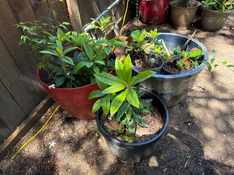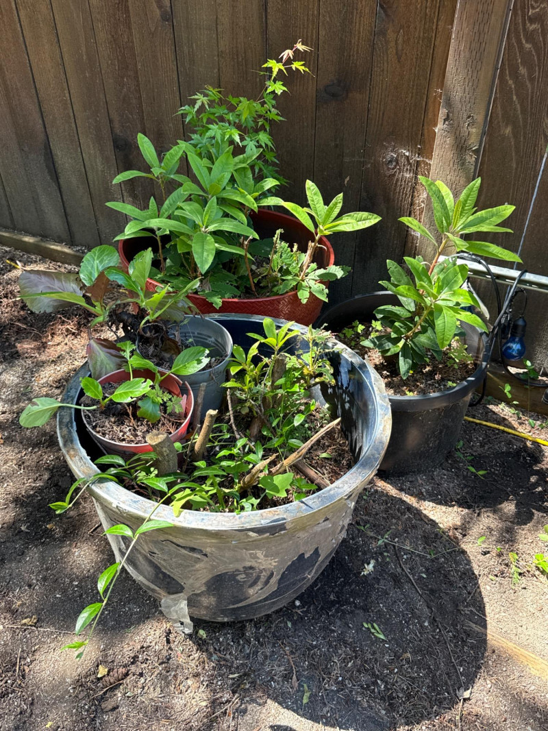 **Note: Plant dimensions are approximate. Plant health is not guaranteed but are being maintained Plastic/Resin pot dimensions are: Two largest are 22in tall, 18in wide. Plant dimensions from soil to tip are: Varies Heavy, with easy load location. Bring support and equipment to help load. Rhododendron, Kalanchoe, Japanese Maple, Viburnum,