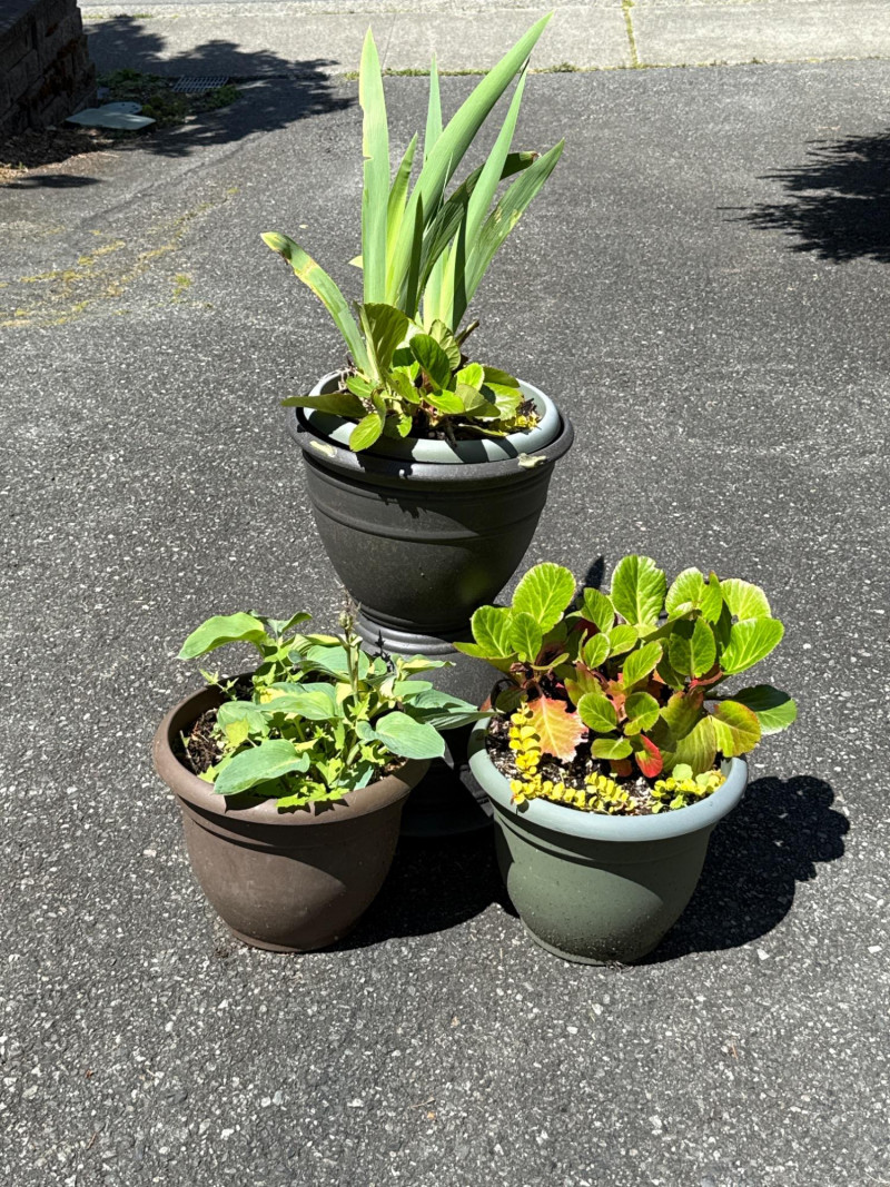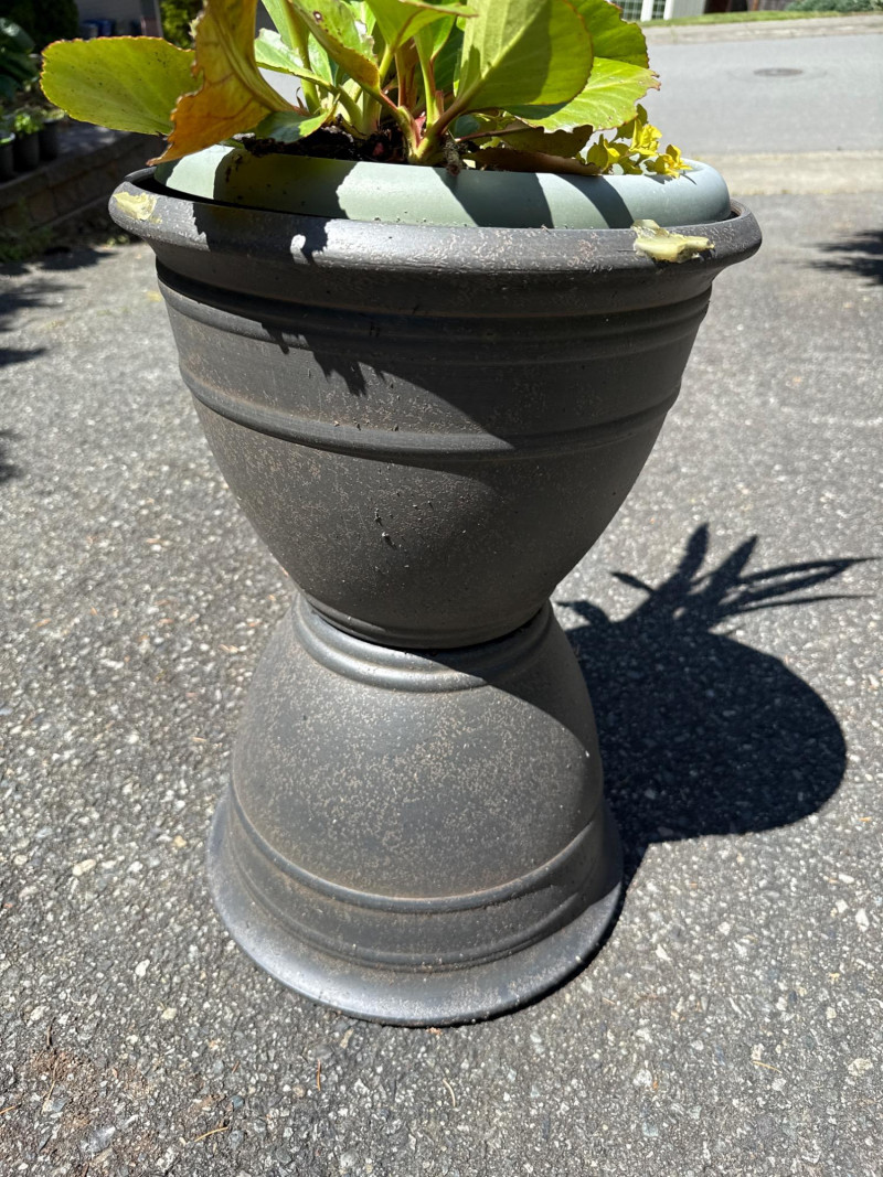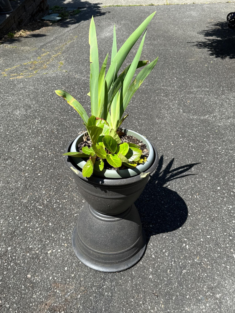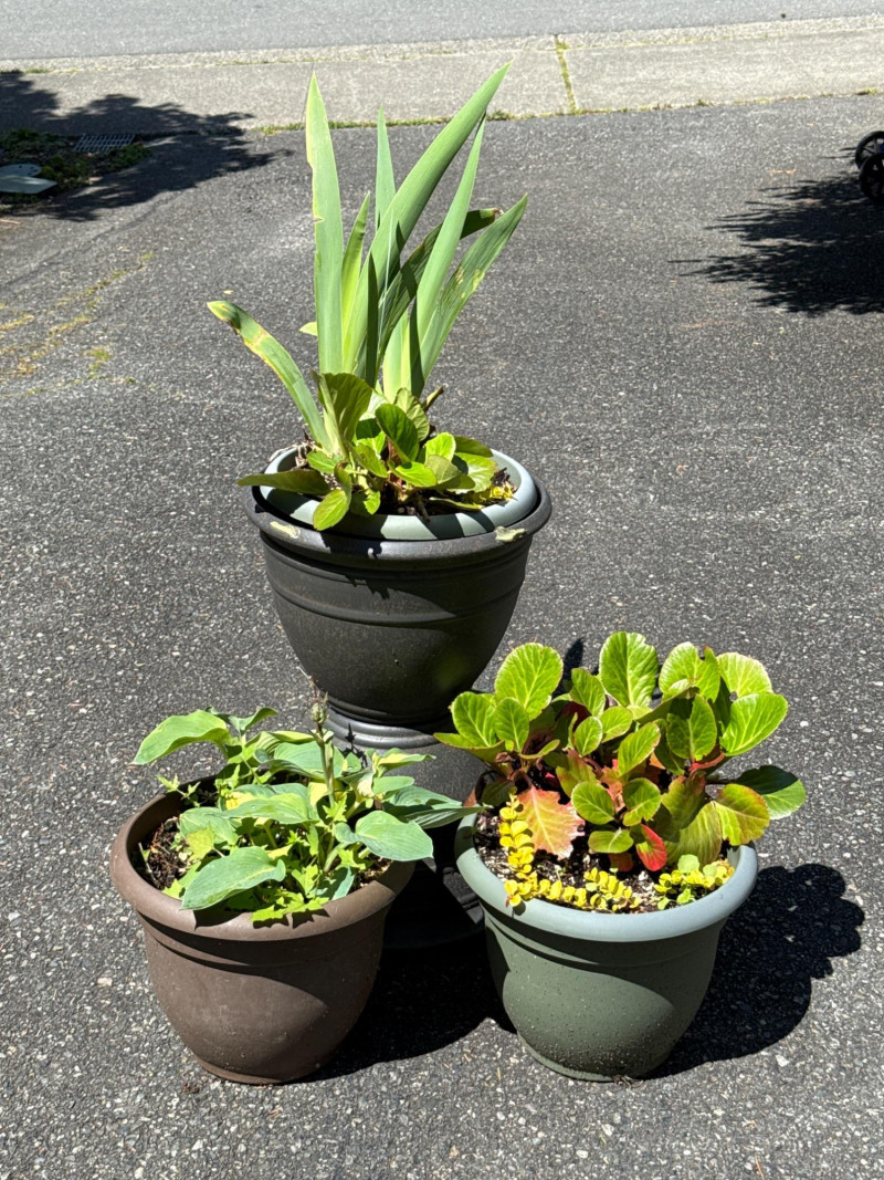 **Note: Plant dimensions are approximate. Plant health is not guaranteed but are being maintained Plastic/Resin pot dimensions are: 14 inches wide, 22 inches tall. Three pots total Plant dimensions from soil to tip are: Varies Iris, Kalanchoe, Hosta, Creeping Jenny One pot is damaged