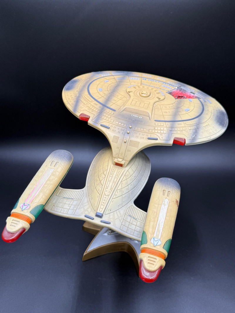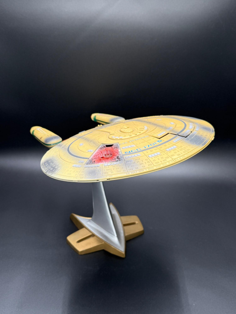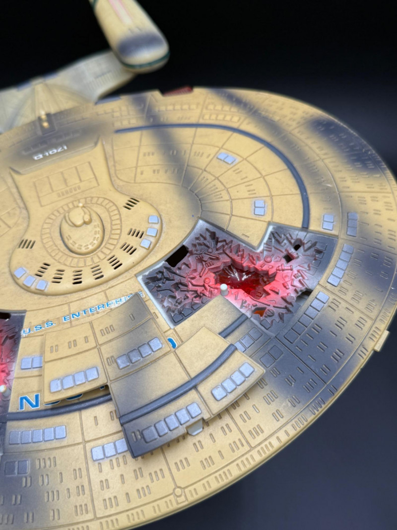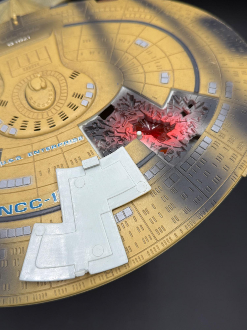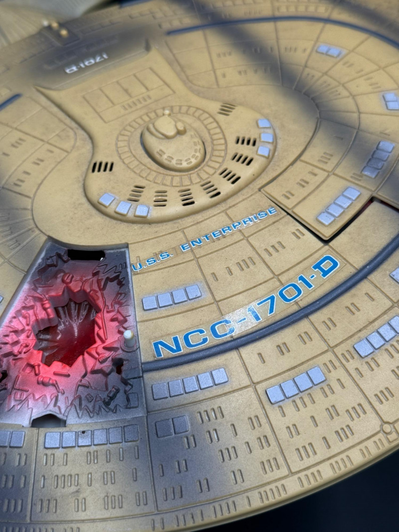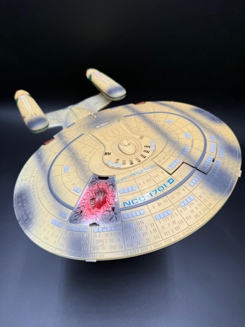 Model of the U.S.S Enterprise NCC-1701-D from Star Trek: The Next Generation. The ship includes a saucer section with registry markings and two rear-mounted warp nacelles. A panel on the saucer section is missing, showing an exposed red interior detail.