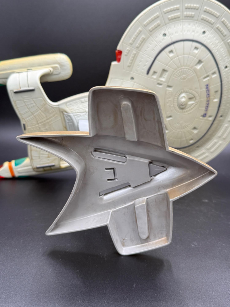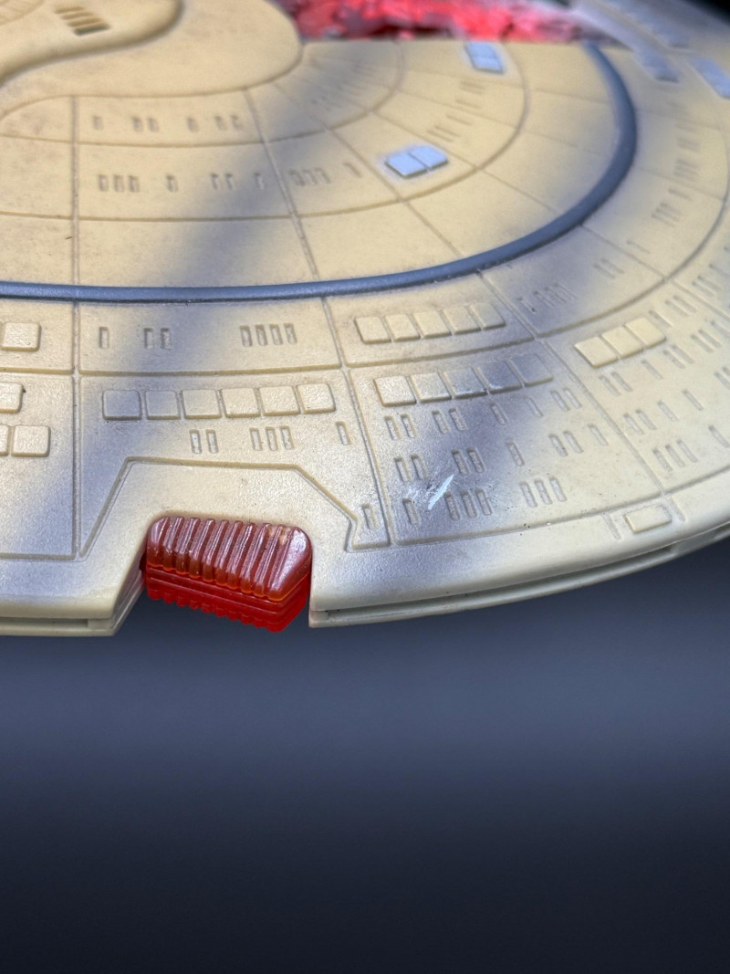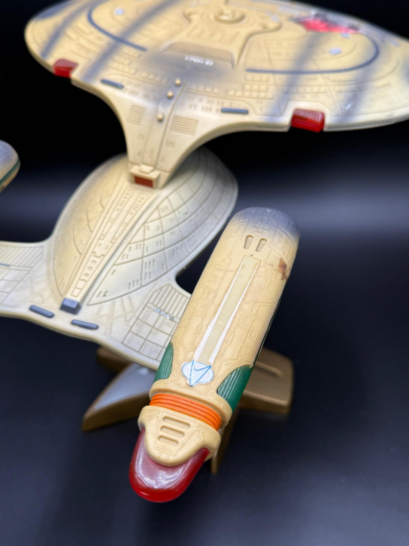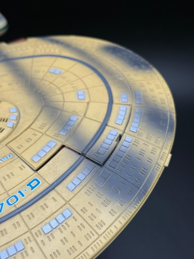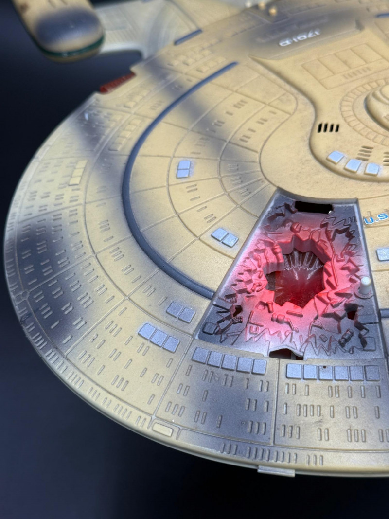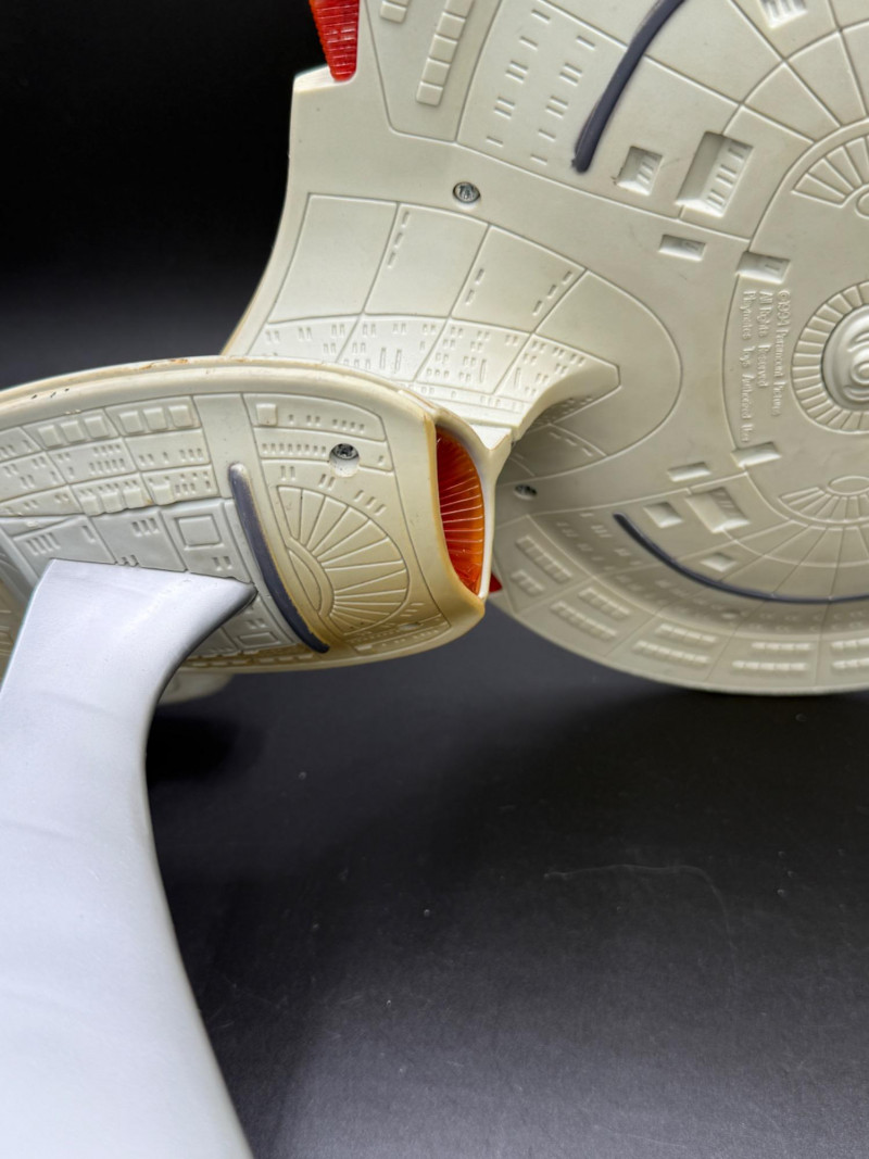 Model of the U.S.S Enterprise NCC-1701-D from Star Trek: The Next Generation. The ship includes a saucer section with registry markings and two rear-mounted warp nacelles. A panel on the saucer section is missing, showing an exposed red interior detail.