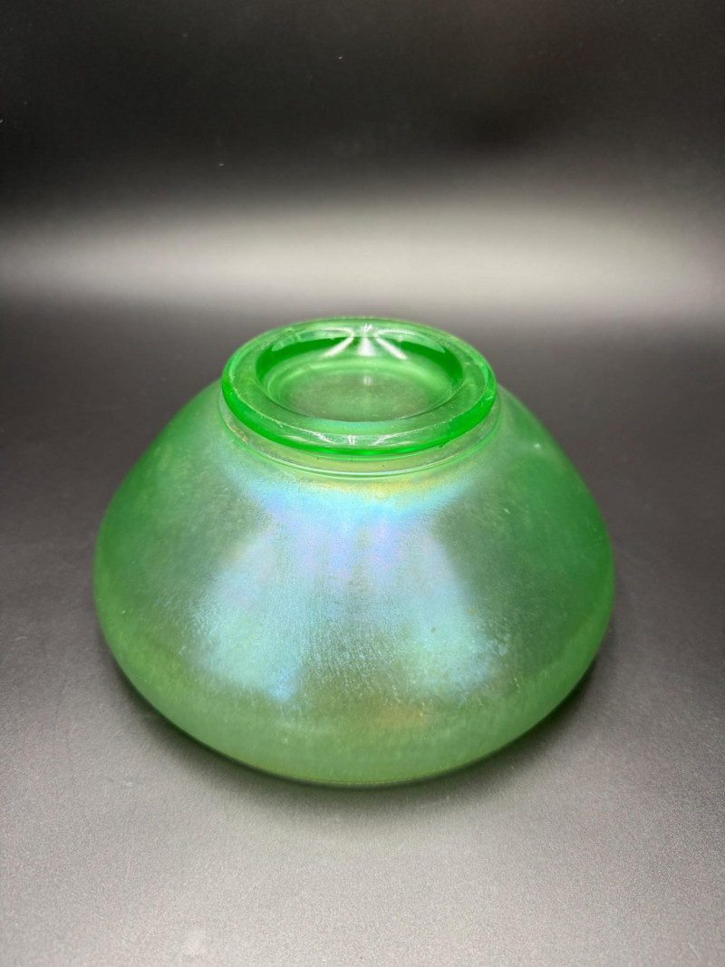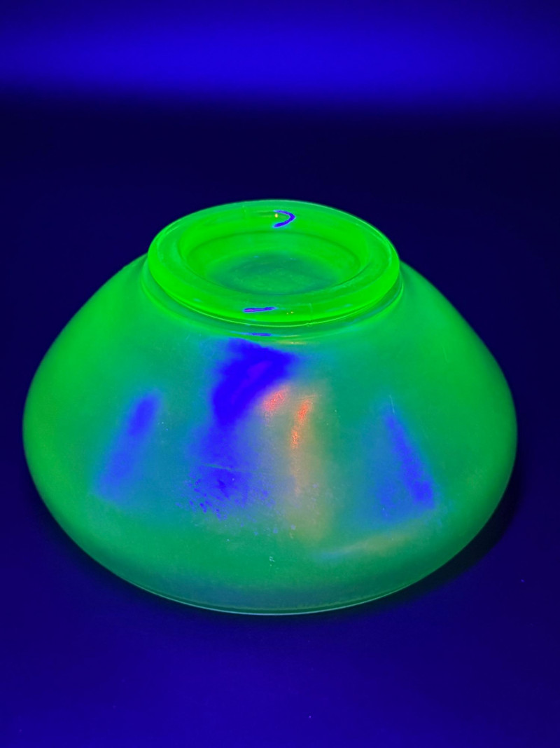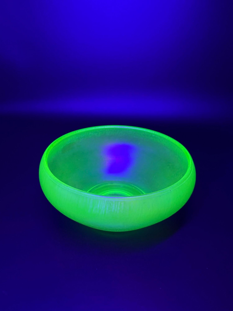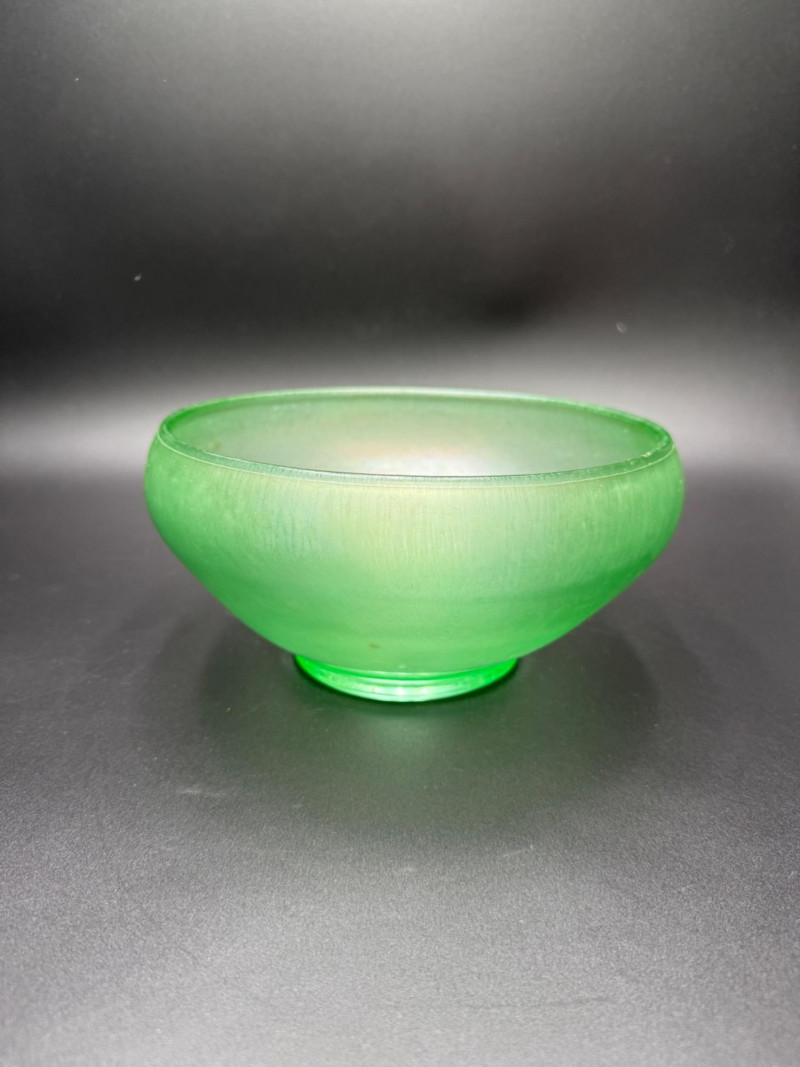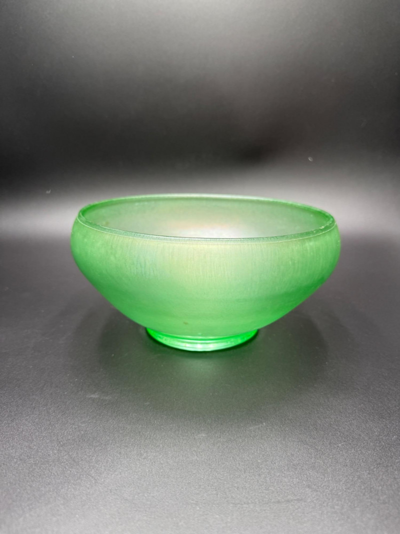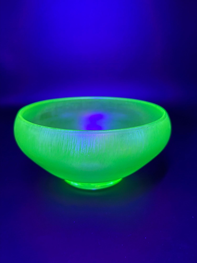 Green glass bowl with subtle iridescence and a slightly rounded base. Measures approximately 8 inches in diameter and 4 inches tall. The bowl fluoresces under UV light, indicating uranium content.