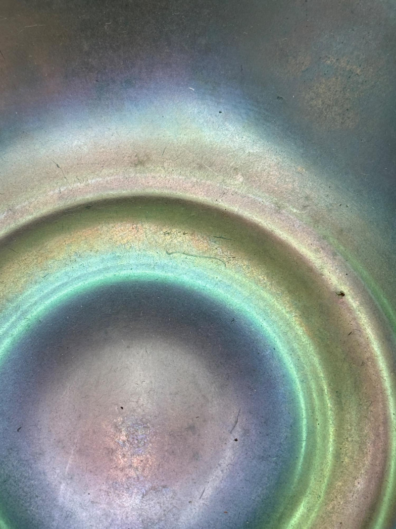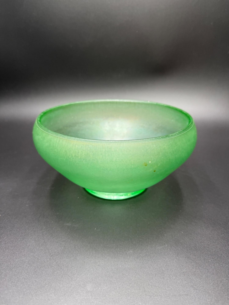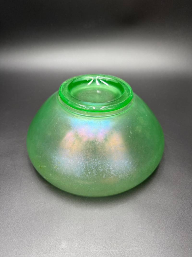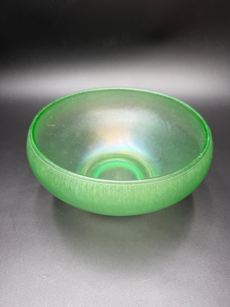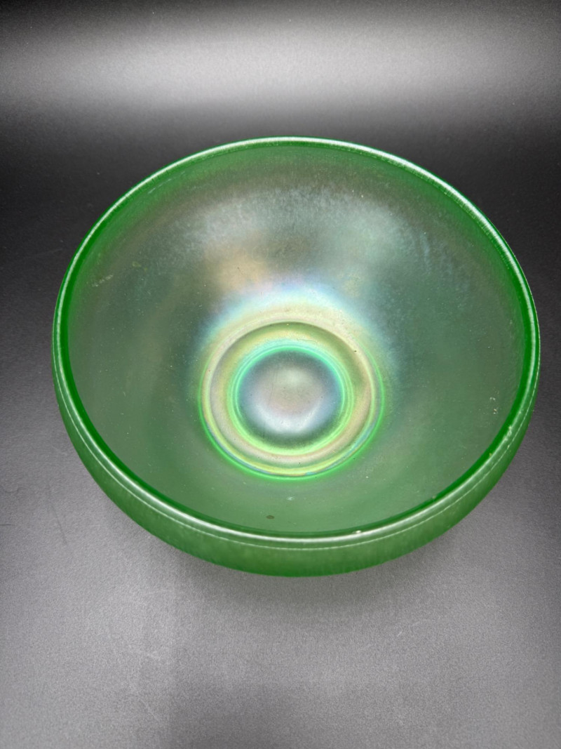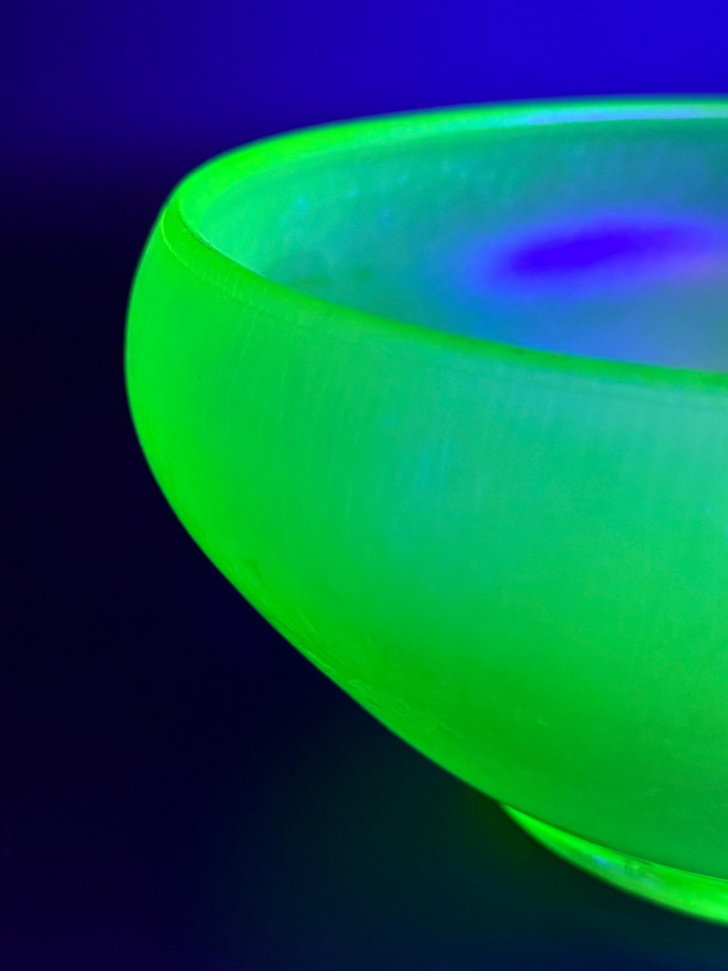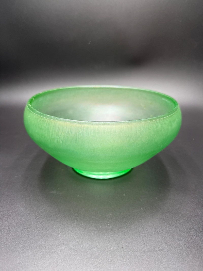 Green glass bowl with subtle iridescence and a slightly rounded base. Measures approximately 8 inches in diameter and 4 inches tall. The bowl fluoresces under UV light, indicating uranium content.