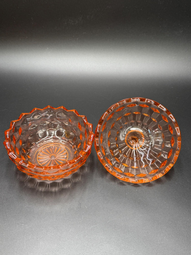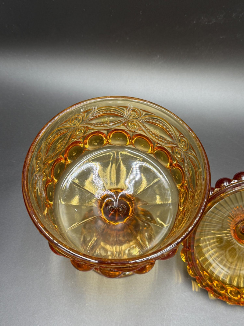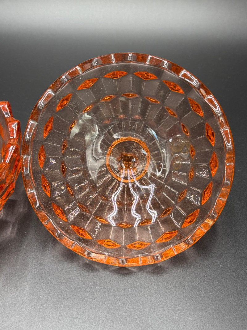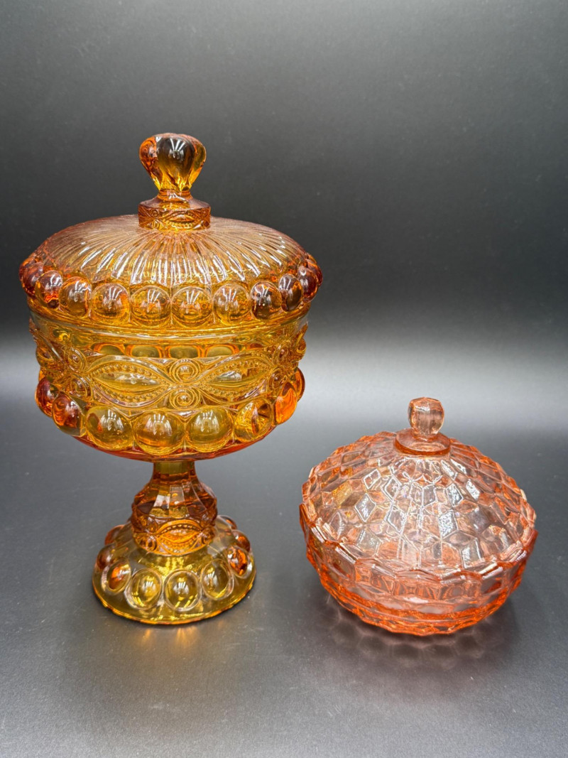 Vintage Amberina Glass Lidded Compotes – Ornate Pedestal & Candy Dish Pair This set includes two lidded glass dishes. The first is a pedestal dish with a domed lid, decorated with molded patterns around the bowl, stem, and base. The second is a round dish with a matching lid, featuring a pressed geometric pattern throughout the surface. Set Includes: 1 Pedestal Dish with Lid: Approx. 10.5" H x 6" W 1 Covered Round Dish: Approx. 5" H x 5.5" W