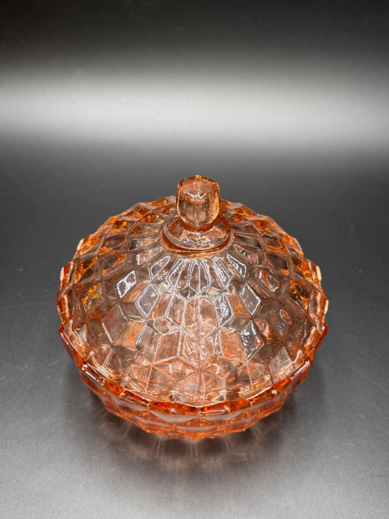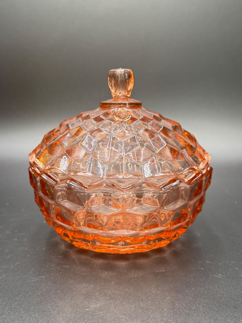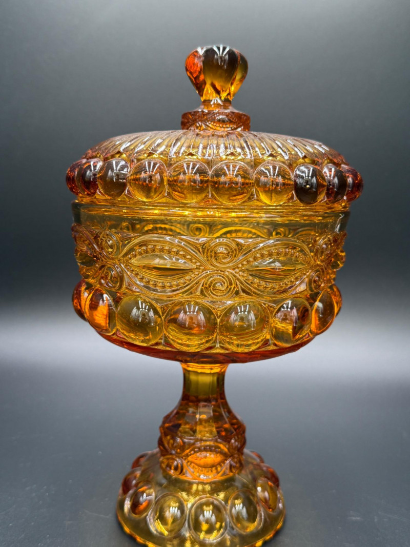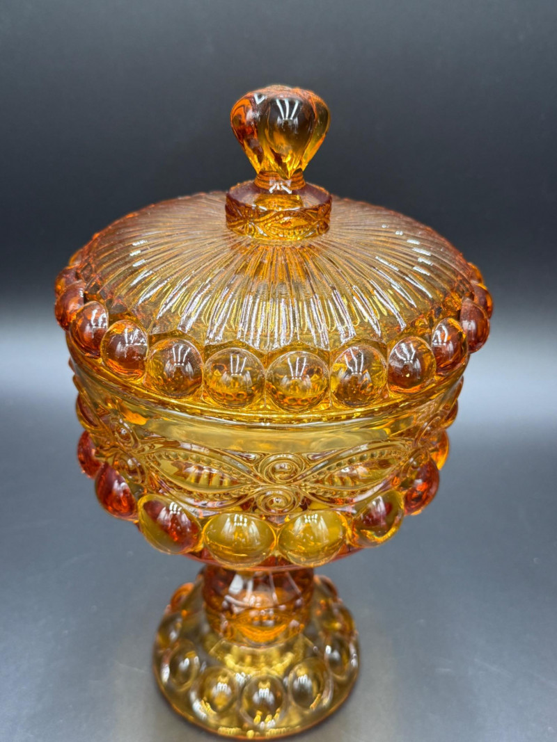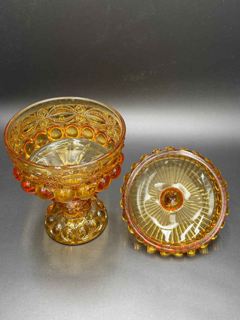 Vintage Amberina Glass Lidded Compotes – Ornate Pedestal & Candy Dish Pair This set includes two lidded glass dishes. The first is a pedestal dish with a domed lid, decorated with molded patterns around the bowl, stem, and base. The second is a round dish with a matching lid, featuring a pressed geometric pattern throughout the surface. Set Includes: 1 Pedestal Dish with Lid: Approx. 10.5" H x 6" W 1 Covered Round Dish: Approx. 5" H x 5.5" W