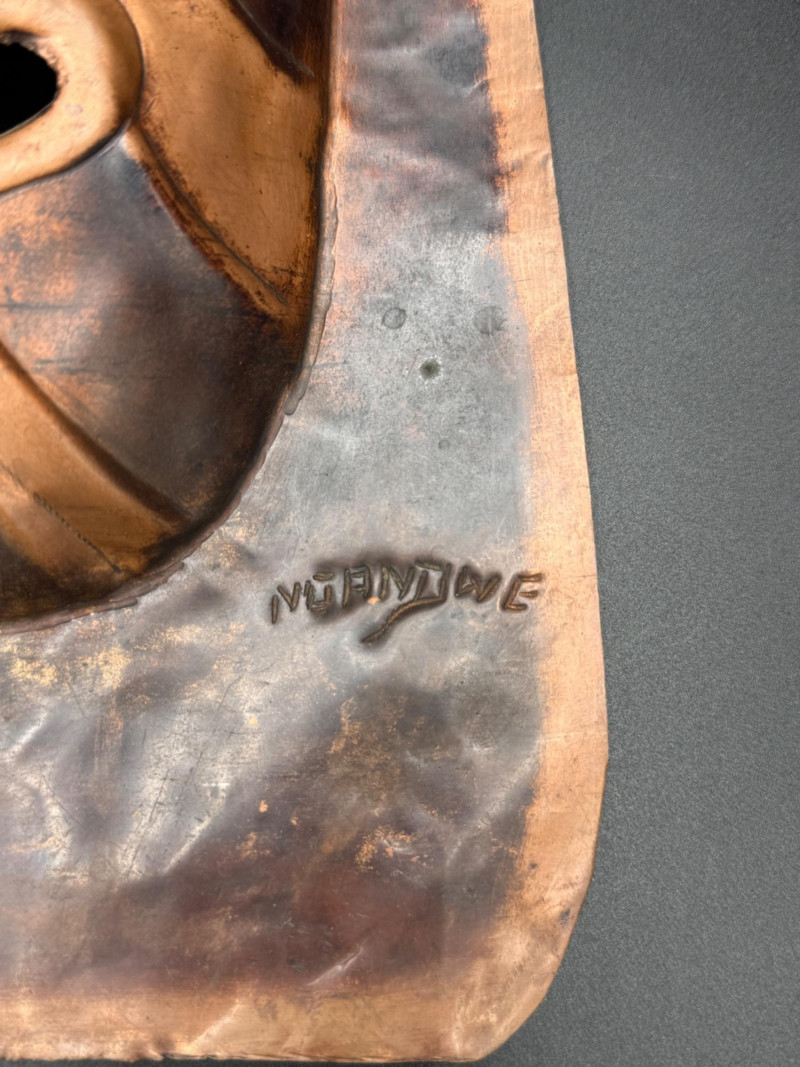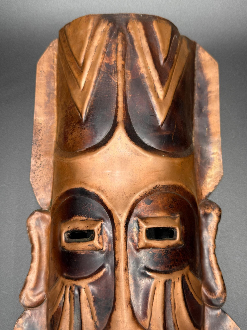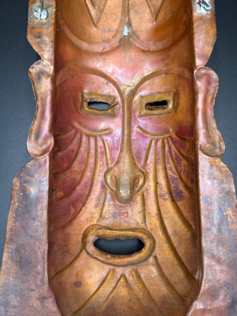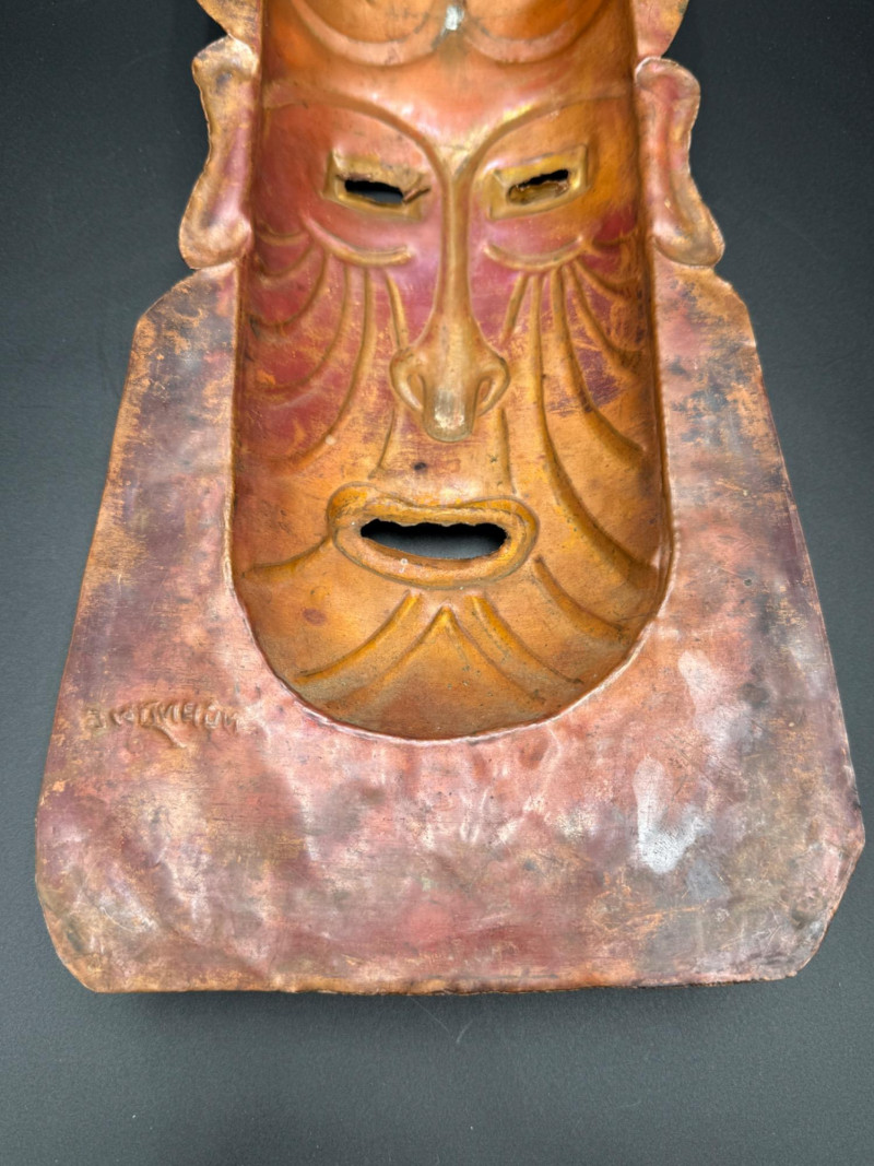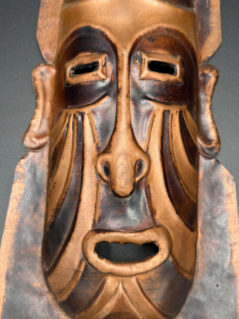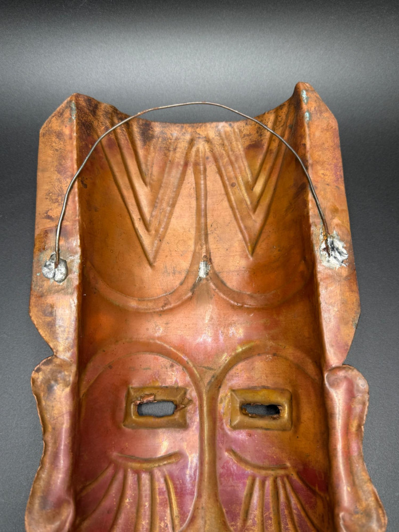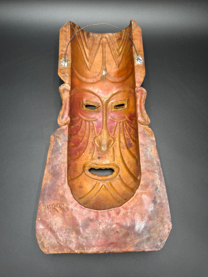 Metal mask with stylized facial features, slotted eyes, and open mouth. Includes artist’s mark and wire hanger. Made of brass or similar metal.