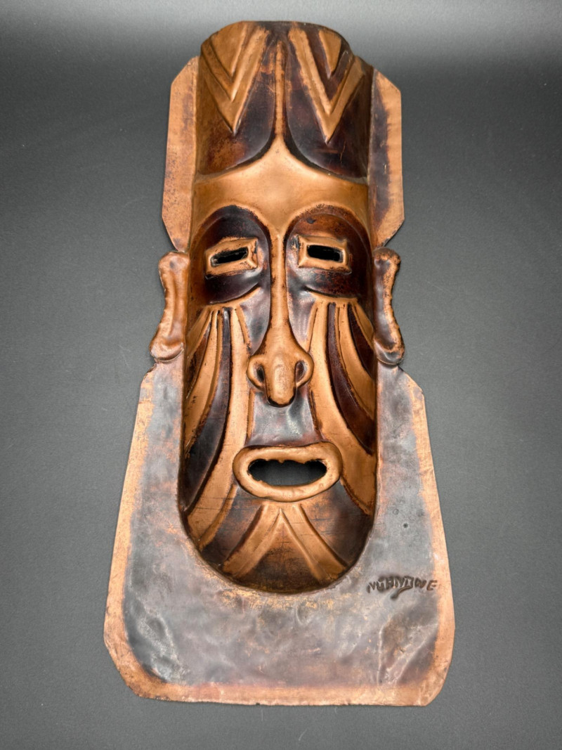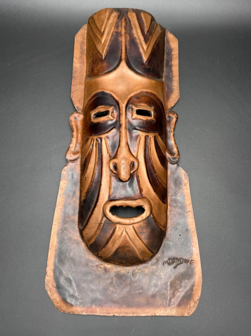 Artist-Signed Metal Tribal Mask Wall Art – Bold Sculptural Statement Measurements: 8.5" W × 17.5" H
