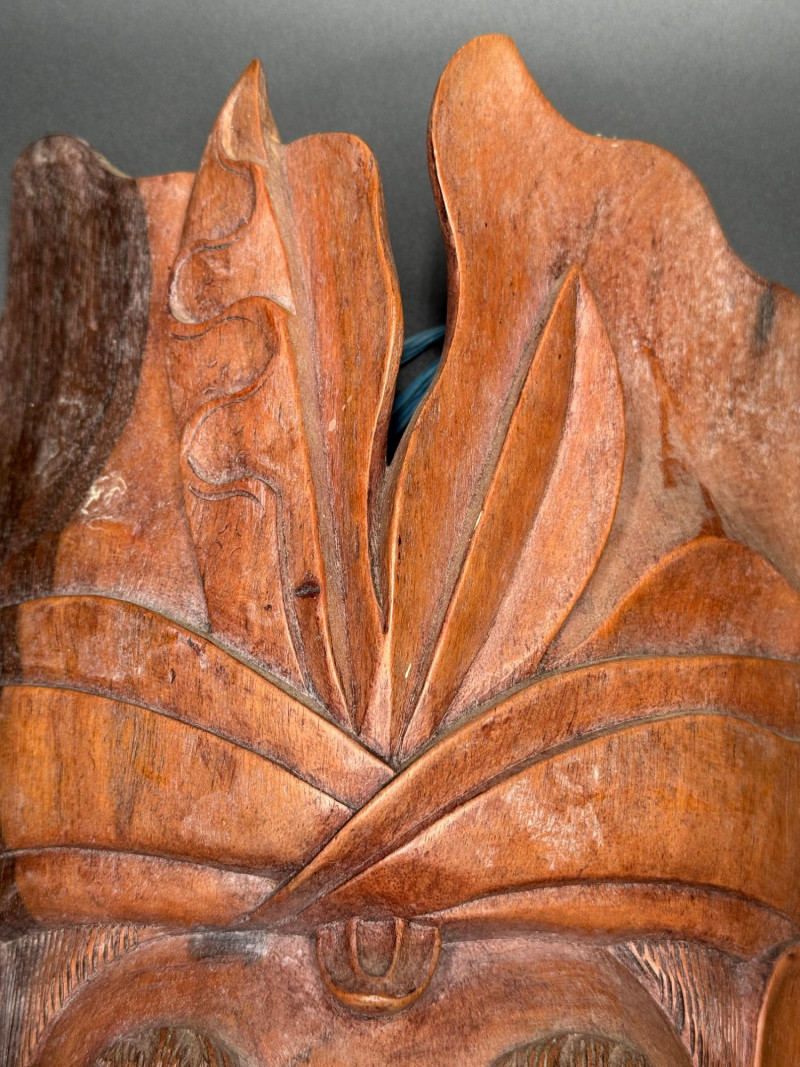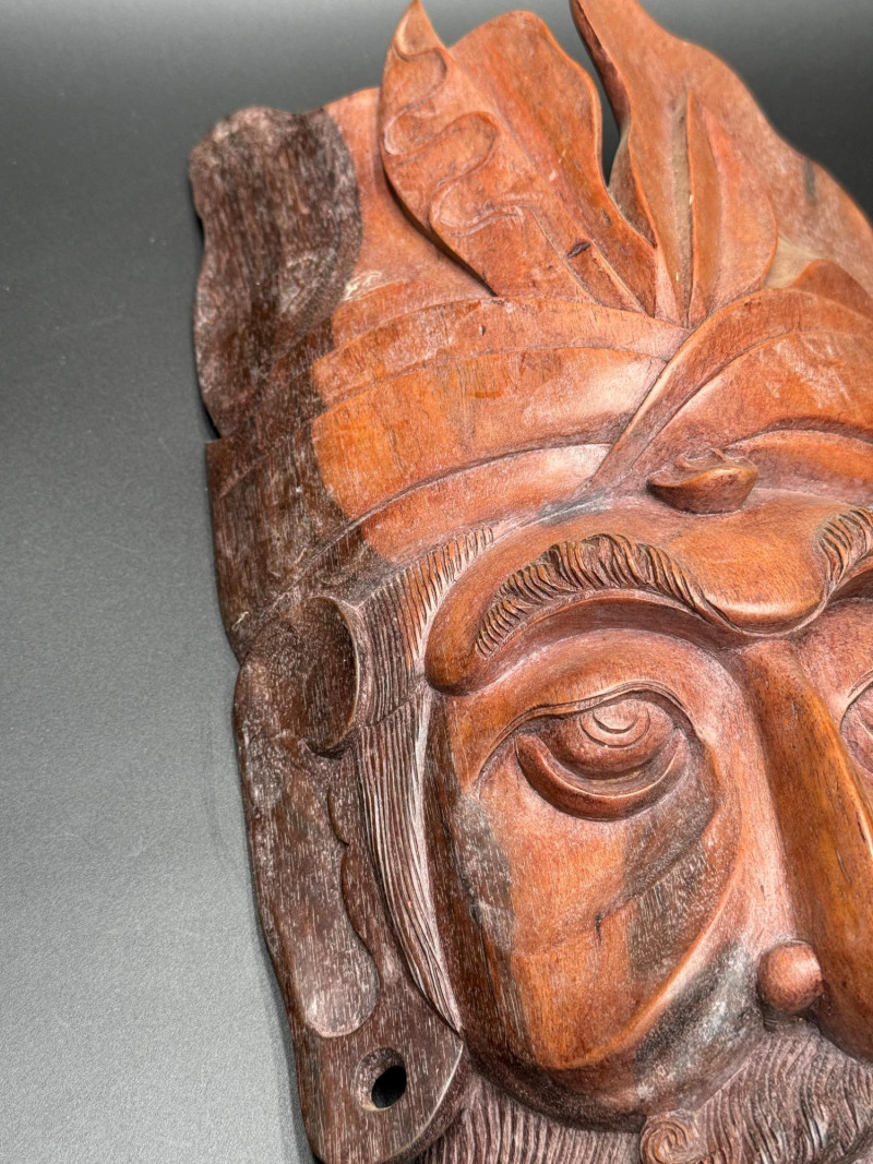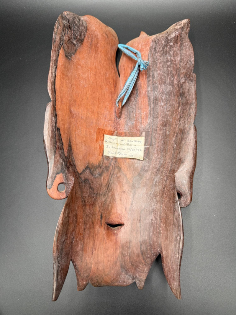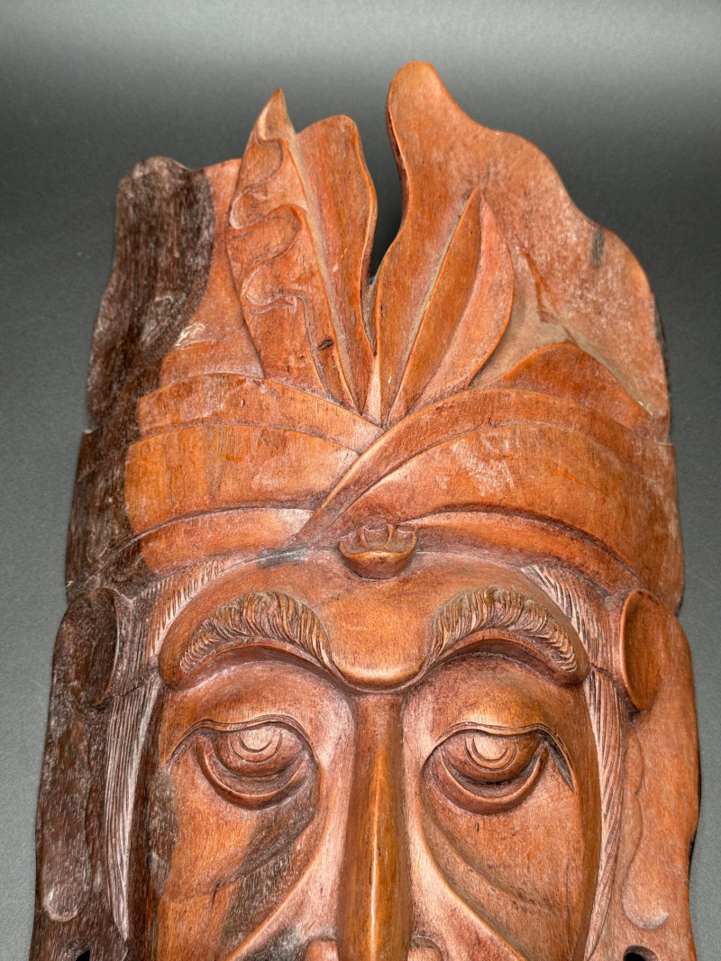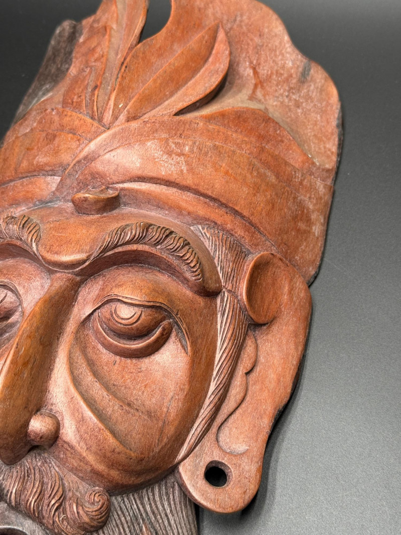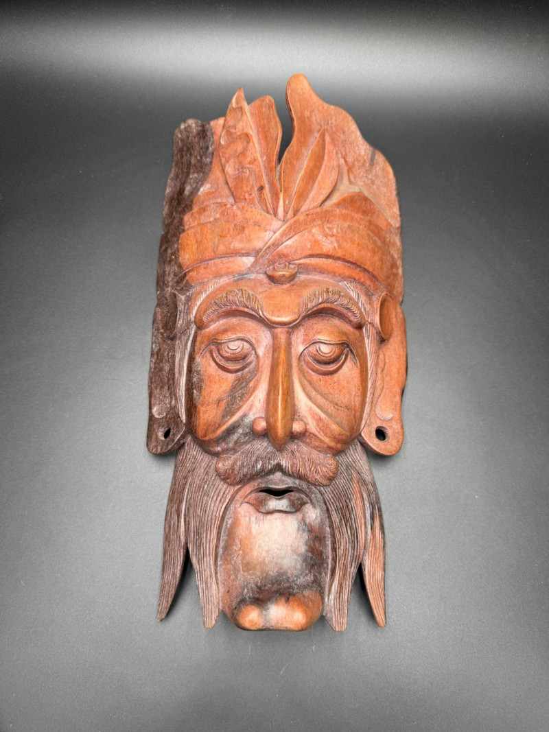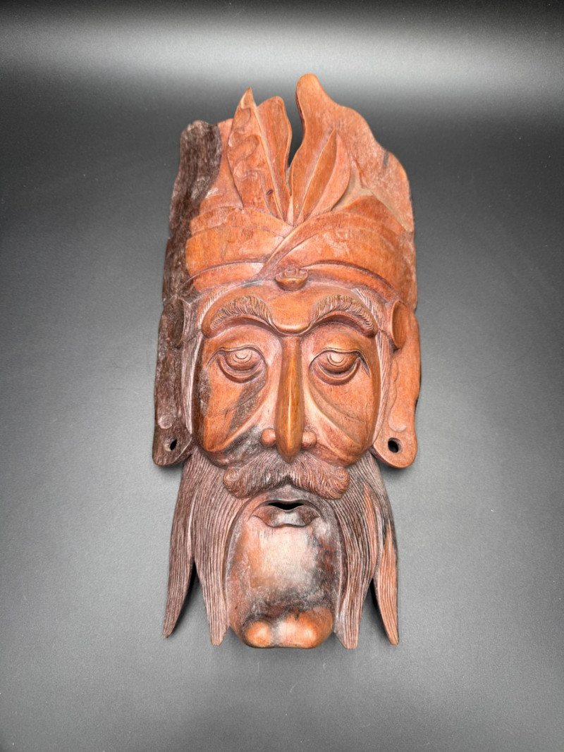 Hand-Carved Wooden Tribal Mask – Bearded Elder with Leaf Headdress Carved wooden mask showing a bearded face with a tall, leaf-patterned headdress. Includes detailed facial features and pierced ears. A loop is attached at the back for hanging. Purchased in Bontang, Kalimantan, Borneo, Indonesia on 12/31/1992. Measurements: 16" H × 7" W