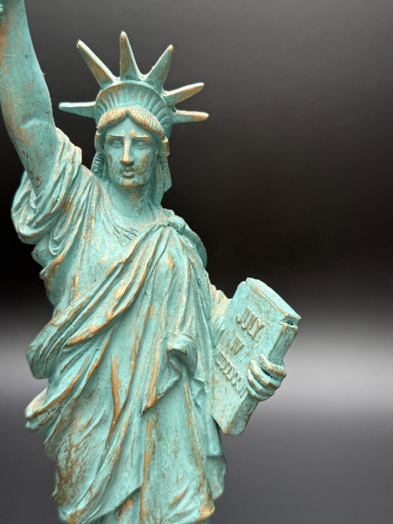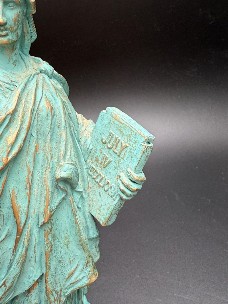 Statue of Liberty Cast Replica Cast replica of the Statue of Liberty featuring a patinated finish. The figure holds a torch in the raised right hand and a tablet in the left inscribed with “JULY IV MDCCLXXVI.” The surface shows textured detailing across the robe and base. Measurements: 13 x 3 x 3 in.