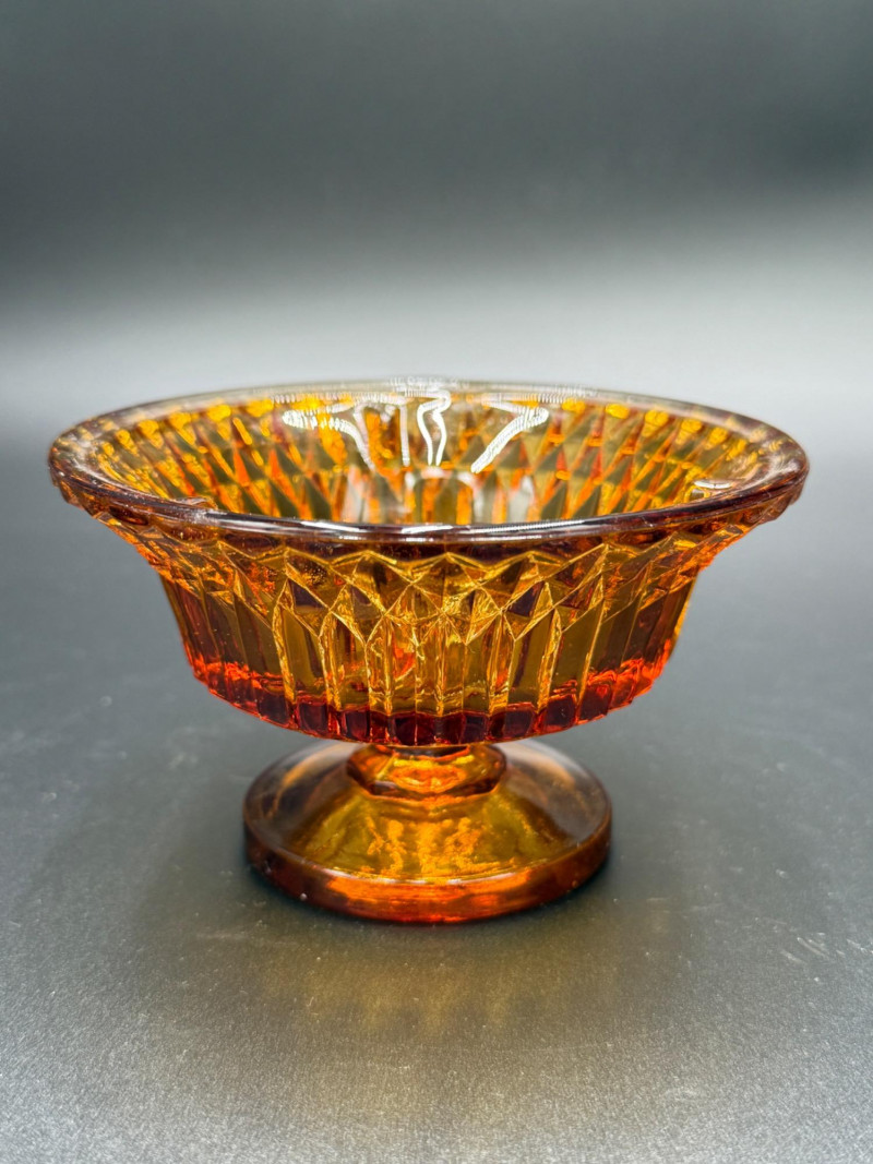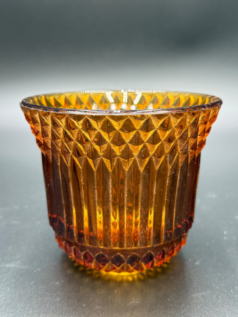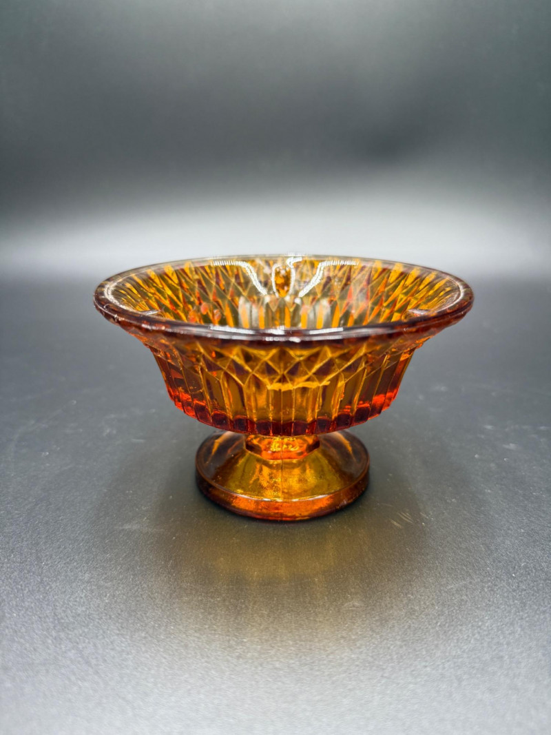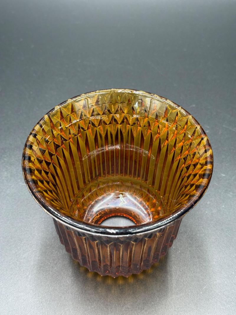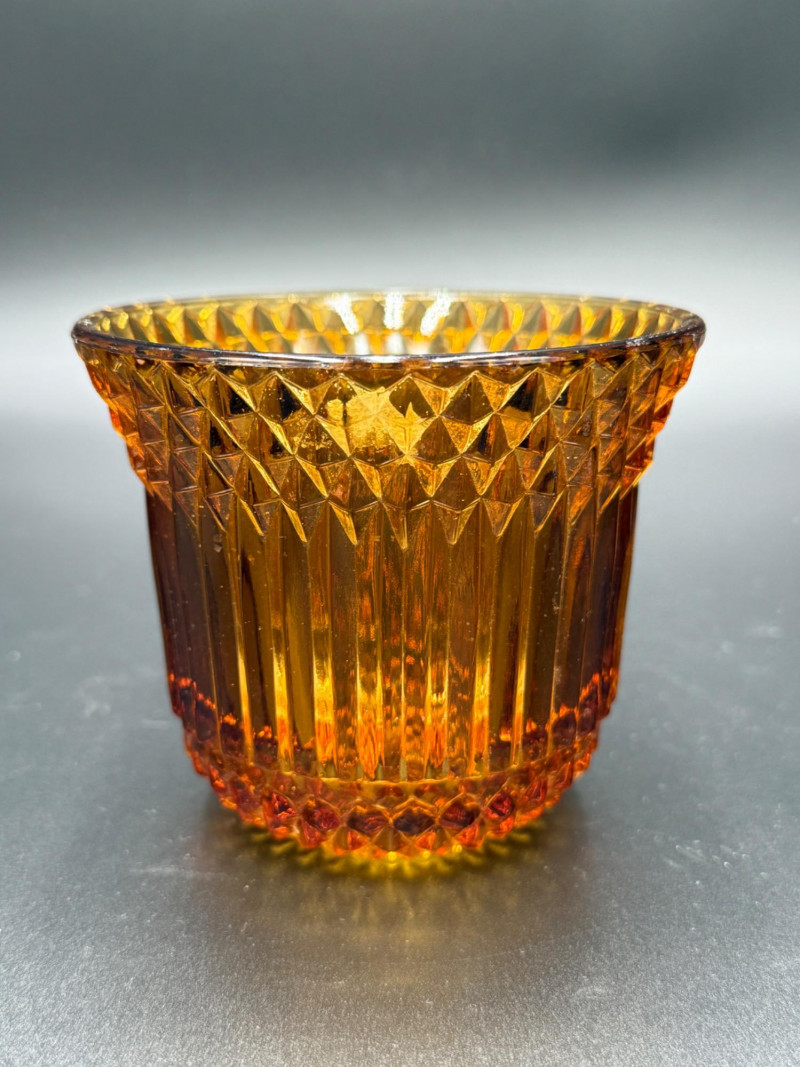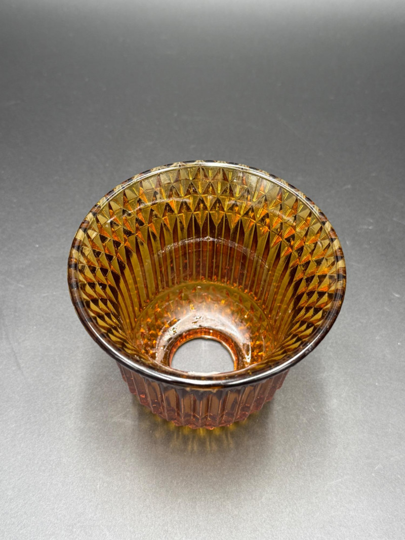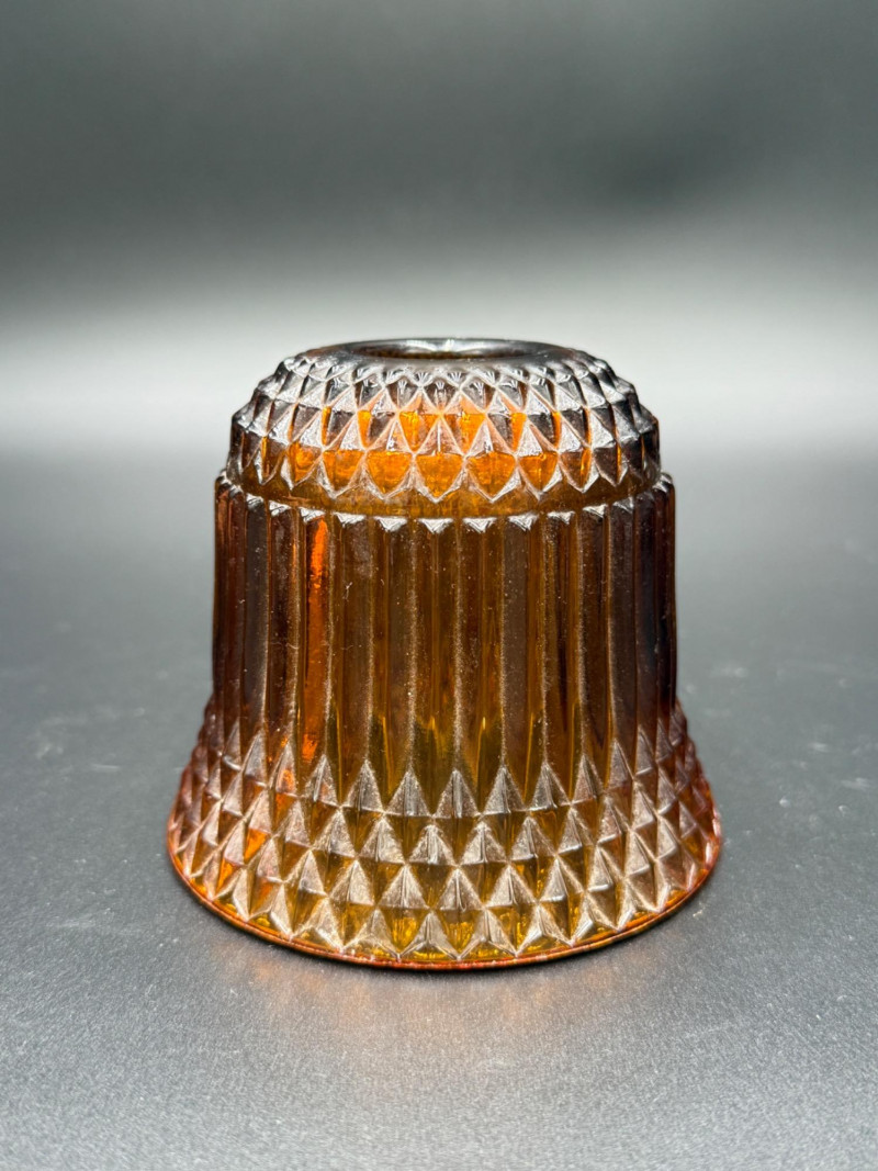 Vintage MCM Indiana Amber Glass Fairy Light Lamp Pressed amber glass candle holder in two parts, featuring a pedestal base and ribbed dome cover. The surface displays a diamond point and vertical ribbed pattern. It appears to be Indiana Glass in the Diamond Point pattern. Measurements: