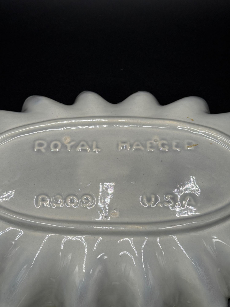 A leaf-shaped dish in green glaze marked "Royal Haeger USA RH09" on the underside. Accompanying the dish are two small animal figurines: one pig with a pink ribbon and one sheep grazing.