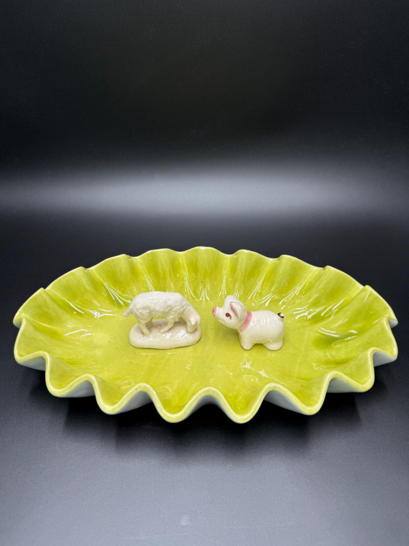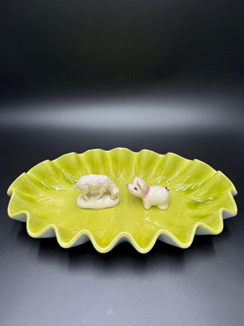 Royal Haeger Green Dish with Pig and Sheep Figurines Measurements: