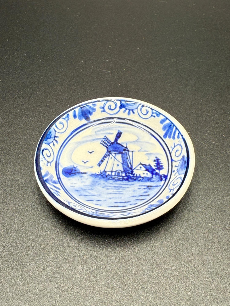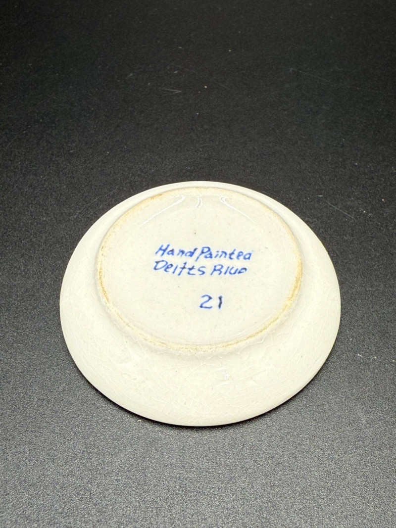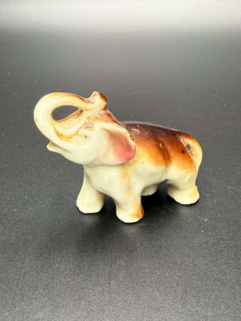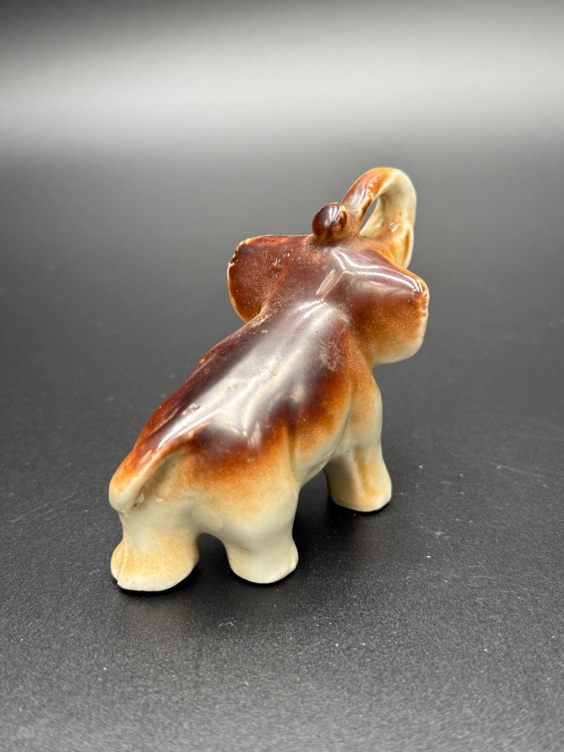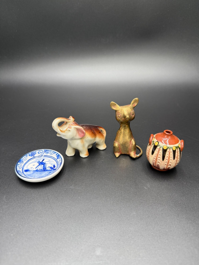 Miniature Ceramic Animal Figurines and Dish Four miniature ceramic pieces including a marbled glaze pot with side handles, a seated mouse figurine with rounded features and curled tail, a ceramic elephant with raised trunk marked "Japan" on the base, and a round dish with blue windmill scene marked “Hand Painted Delft’s Blue 21” underneath. Measurements: 0.5" to 3.5" high