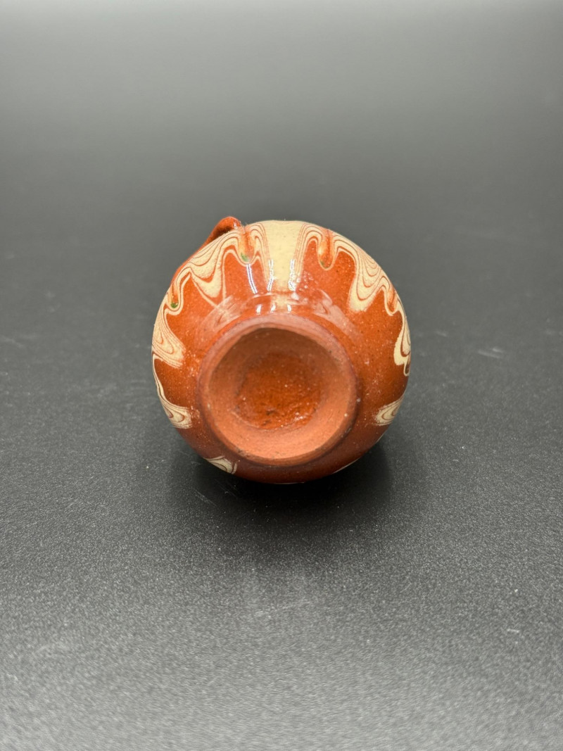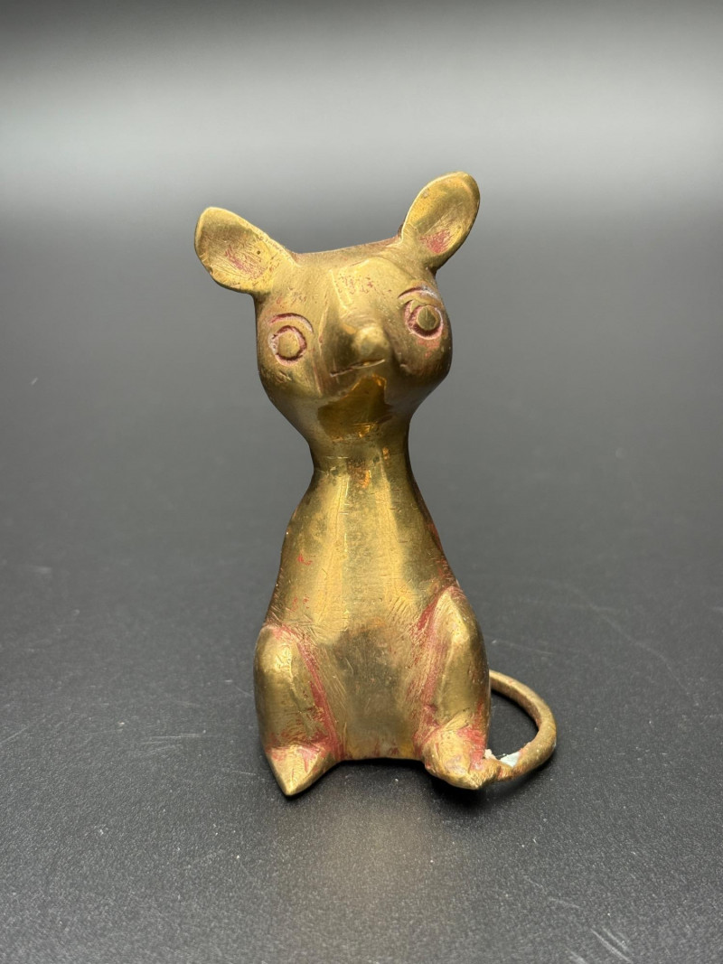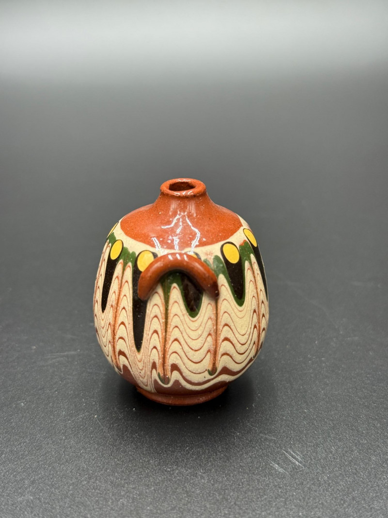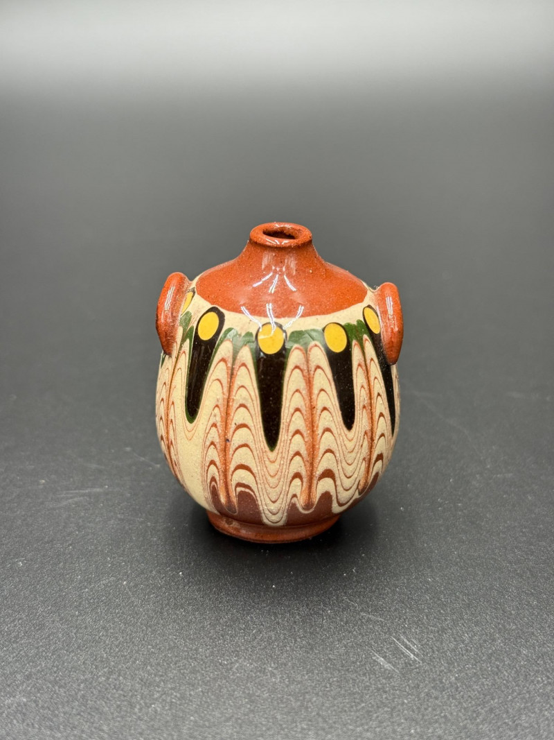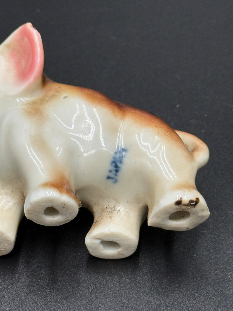 Miniature Ceramic Animal Figurines and Dish Four miniature ceramic pieces including a marbled glaze pot with side handles, a seated mouse figurine with rounded features and curled tail, a ceramic elephant with raised trunk marked "Japan" on the base, and a round dish with blue windmill scene marked “Hand Painted Delft’s Blue 21” underneath. Measurements: 0.5" to 3.5" high