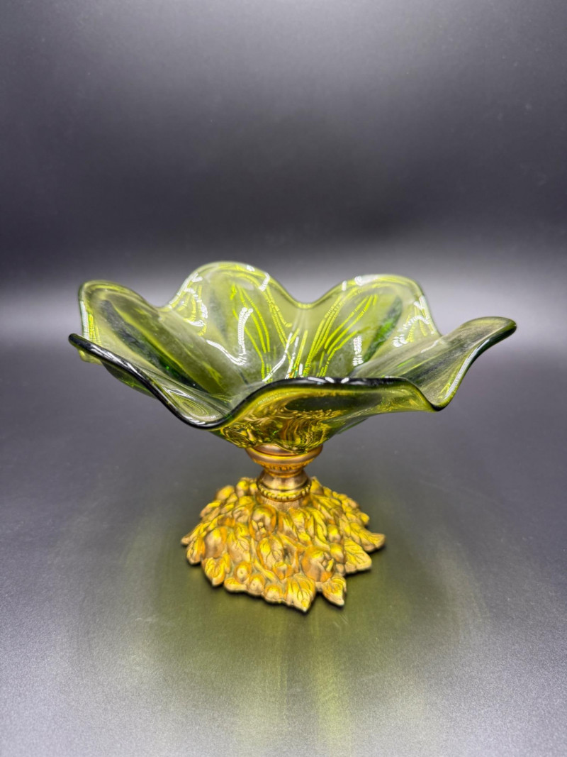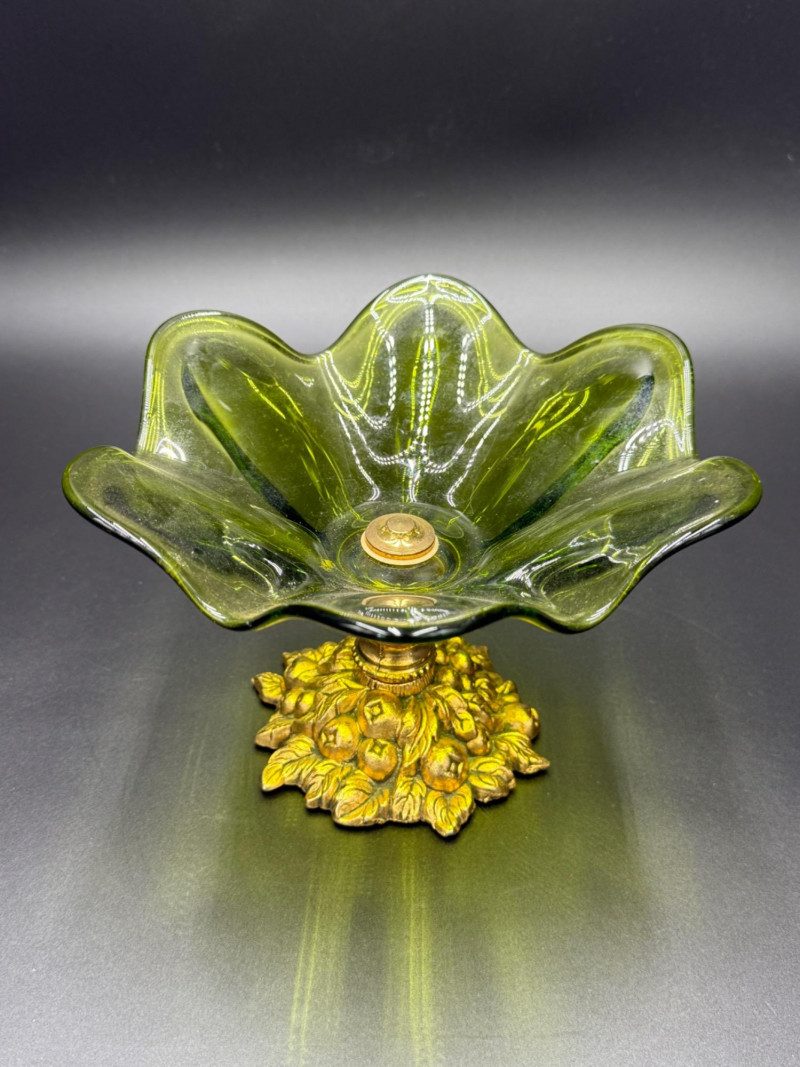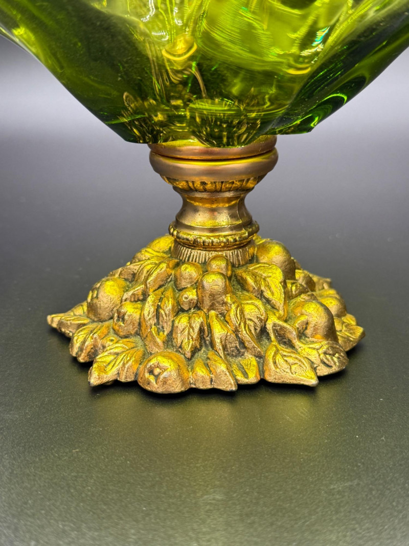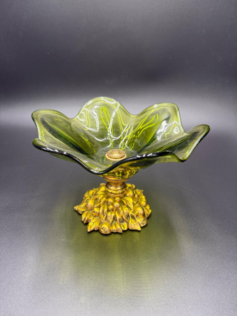 Vintage Green Art Glass Compote with Ornate Gilded Base – 8" W x 5.5" H This eye-catching pedestal compote features a flowing, ruffled green art glass bowl, gracefully flared to create organic, wave-like curves. The glass has a luminous, slightly iridescent finish, beautifully catching light and highlighting its Mid-Century to Hollywood Regency aesthetic. The bowl is seated atop an elaborate, fruit-and-foliage cast metal base finished in a gilded gold tone—rich in texture and depth. The ornate styling of the base evokes 1960s-70s glam décor, when statement glassware and opulent metallic accents were centerpieces of fashionable homes. A stunning display piece, perfect for collectors of vintage glass, or anyone looking to add a pop of retro elegance to their décor. These types of compotes were often sold in limited quantities and are increasingly difficult to find in such well-preserved condition. Measurements: