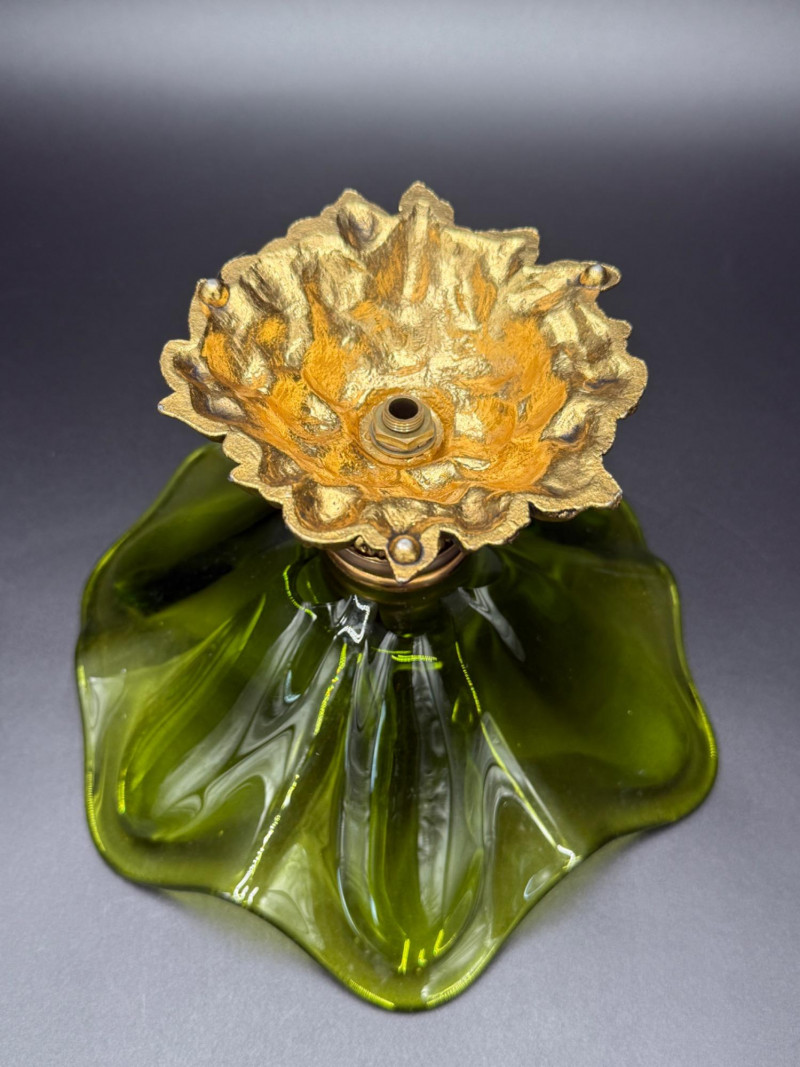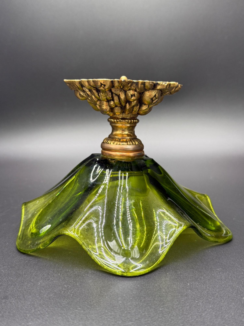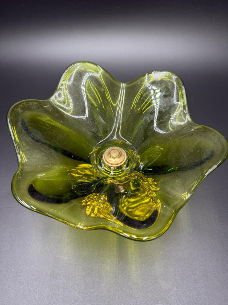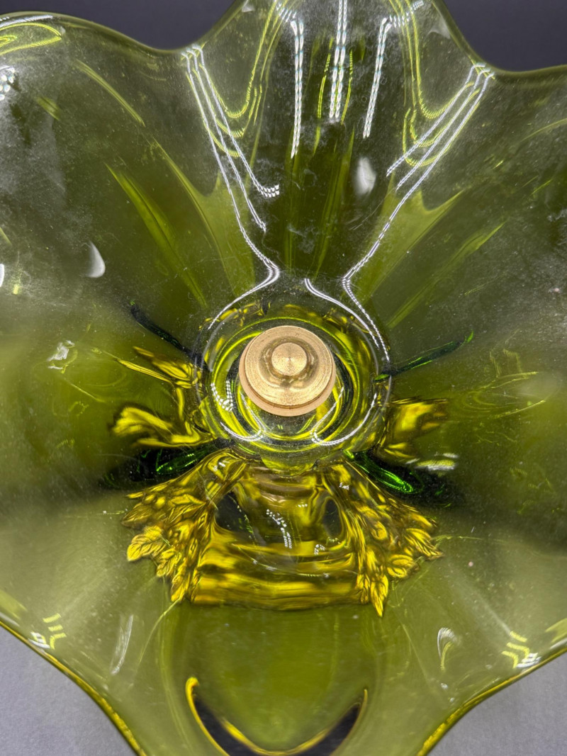 Vintage Green Art Glass Compote with Ornate Gilded Base – 8" W x 5.5" H This eye-catching pedestal compote features a flowing, ruffled green art glass bowl, gracefully flared to create organic, wave-like curves. The glass has a luminous, slightly iridescent finish, beautifully catching light and highlighting its Mid-Century to Hollywood Regency aesthetic. The bowl is seated atop an elaborate, fruit-and-foliage cast metal base finished in a gilded gold tone—rich in texture and depth. The ornate styling of the base evokes 1960s-70s glam décor, when statement glassware and opulent metallic accents were centerpieces of fashionable homes. A stunning display piece, perfect for collectors of vintage glass, or anyone looking to add a pop of retro elegance to their décor. These types of compotes were often sold in limited quantities and are increasingly difficult to find in such well-preserved condition. Measurements: